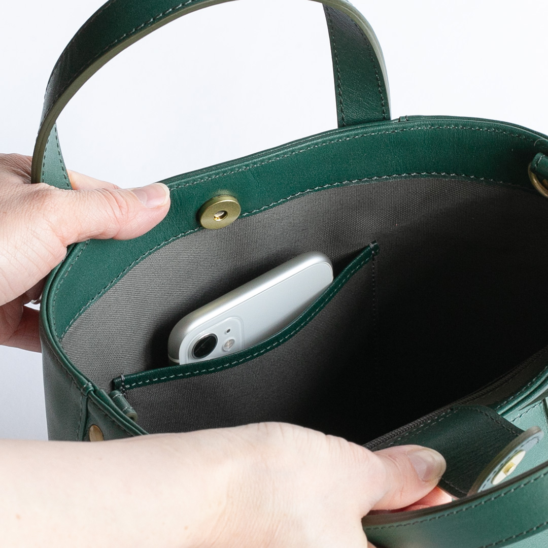 着脱式のショルダーベルト(幅1.5㎝、長さ111㎝~123㎝)がついており、肩かけとしても手さげとしてもお使いいただけます。その日の気分やコーディネートに合わせて、お好みのスタイルでお持ちください。