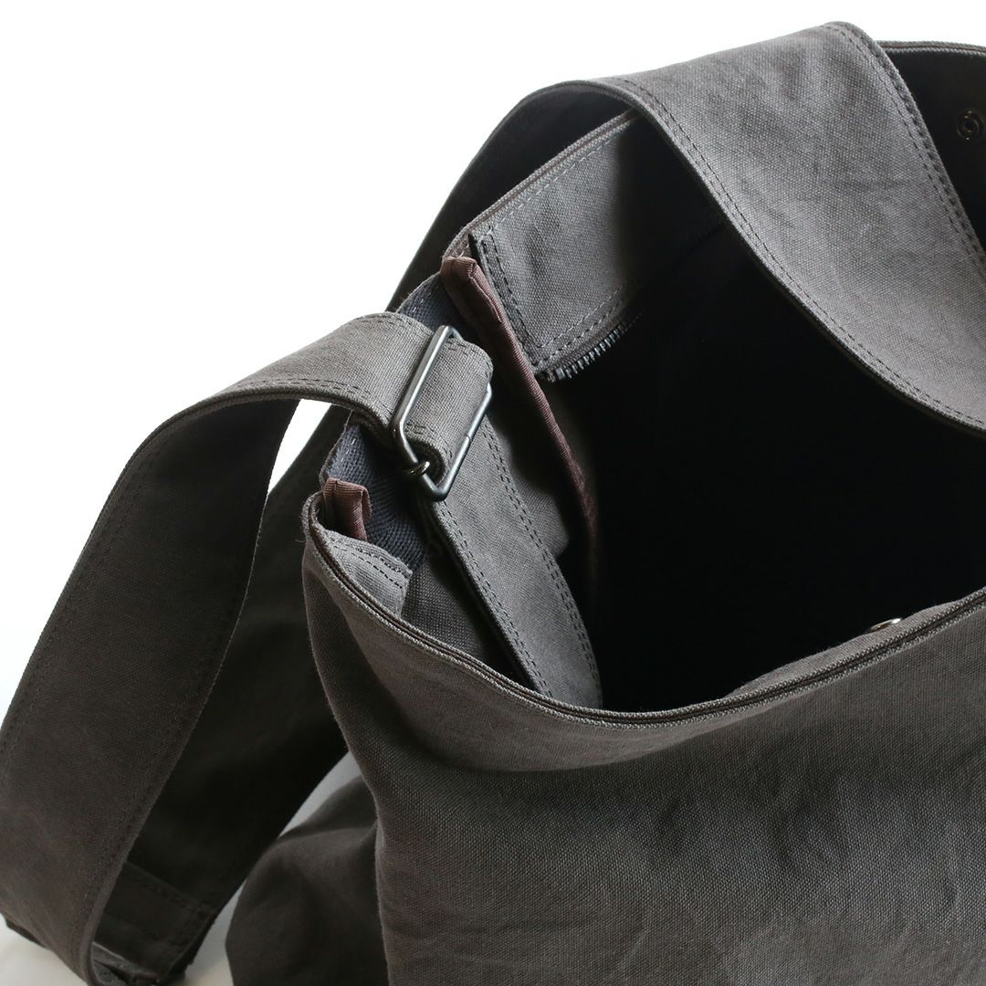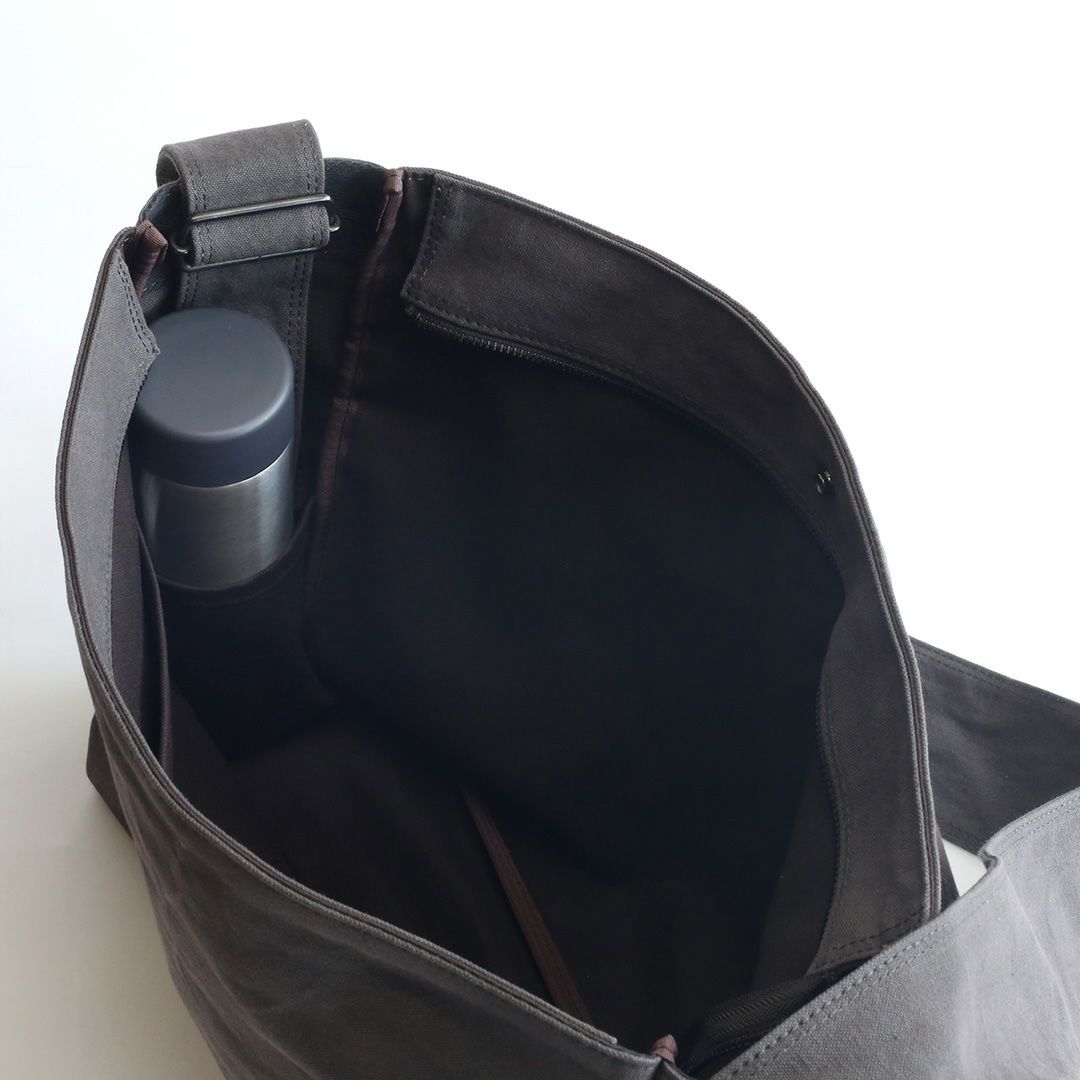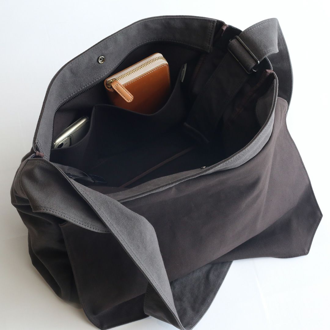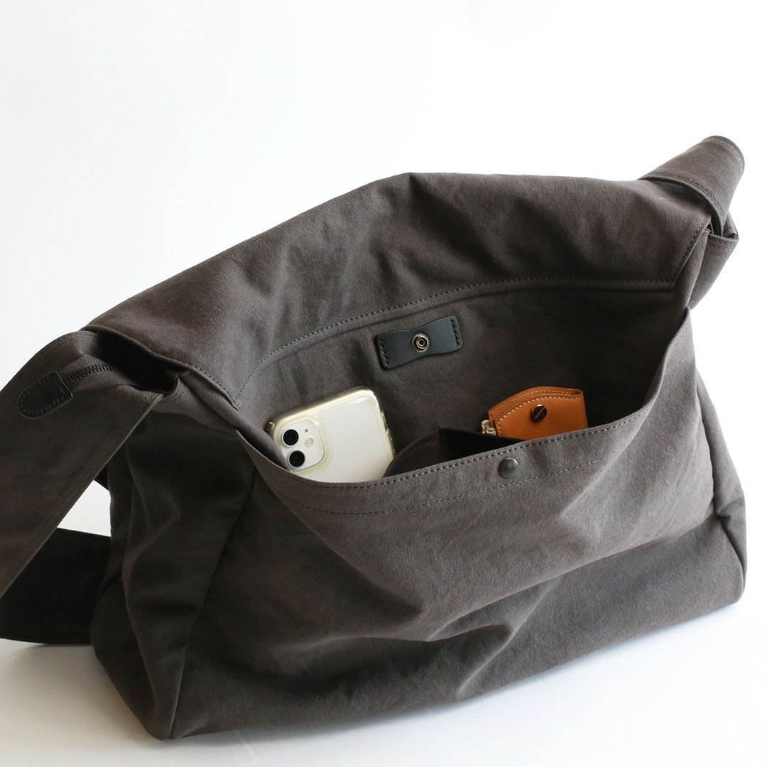 ショルダーバッグのサイズや構造を綿密に計算し、備長炭染め帆布のくたっと柔らかな素材感はそのままに、荷物を入れた時にも型崩れせずに、どなたでも美しいシルエットのままお使いいただけるつくりを実現させました。