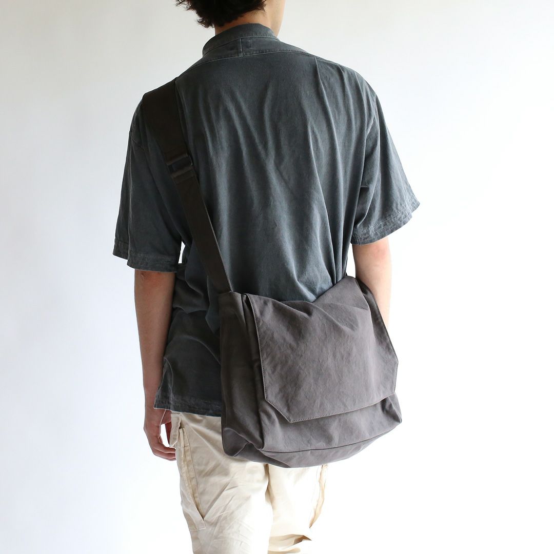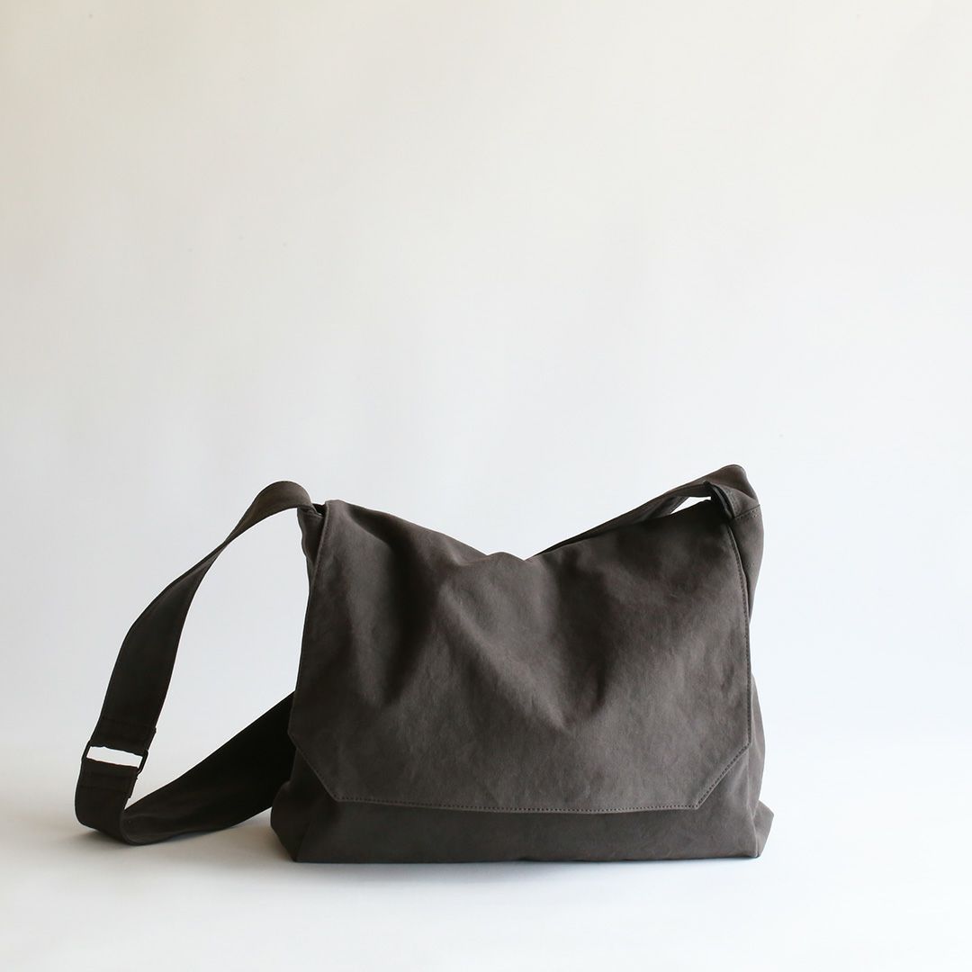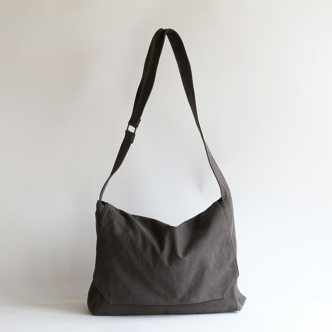 ショルダーバッグのサイズや構造を綿密に計算し、備長炭染め帆布のくたっと柔らかな素材感はそのままに、荷物を入れた時にも型崩れせずに、どなたでも美しいシルエットのままお使いいただけるつくりを実現させました。