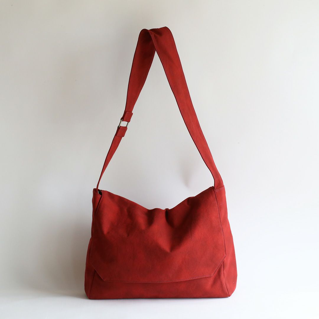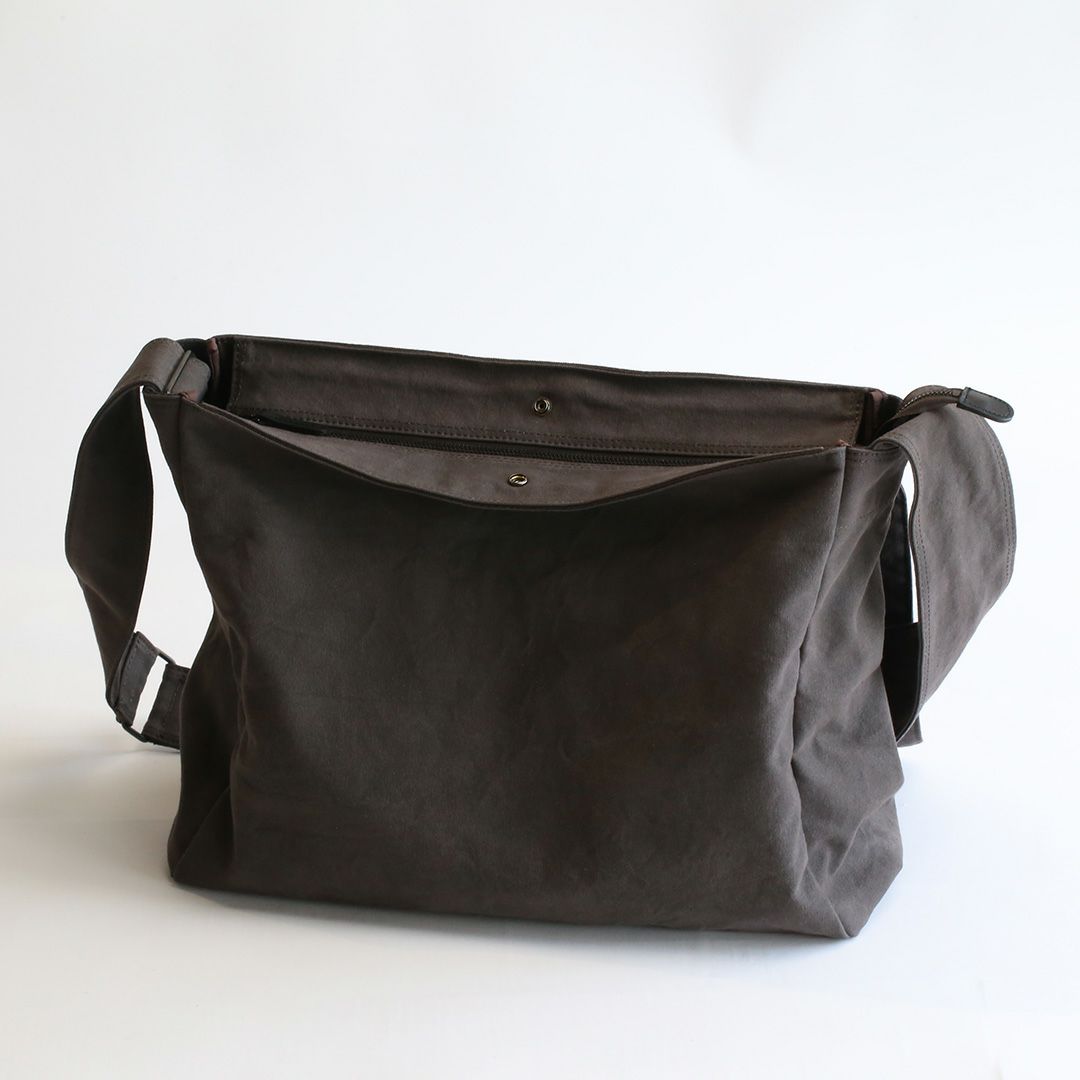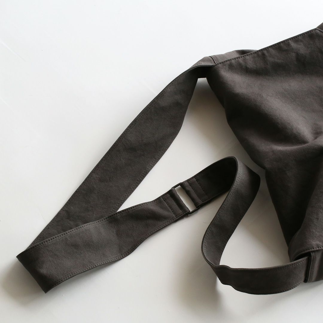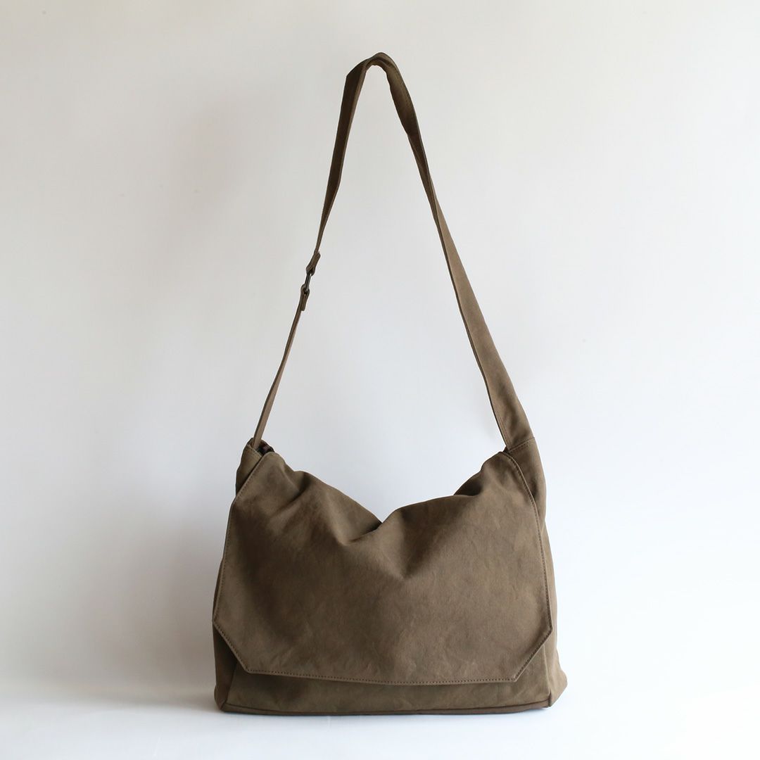 ショルダーバッグのサイズや構造を綿密に計算し、備長炭染め帆布のくたっと柔らかな素材感はそのままに、荷物を入れた時にも型崩れせずに、どなたでも美しいシルエットのままお使いいただけるつくりを実現させました。