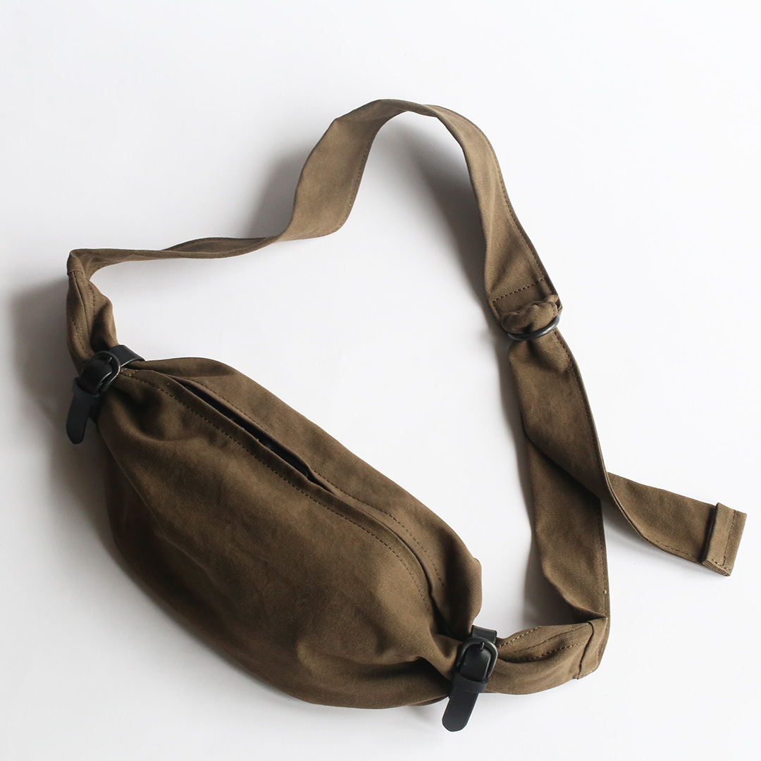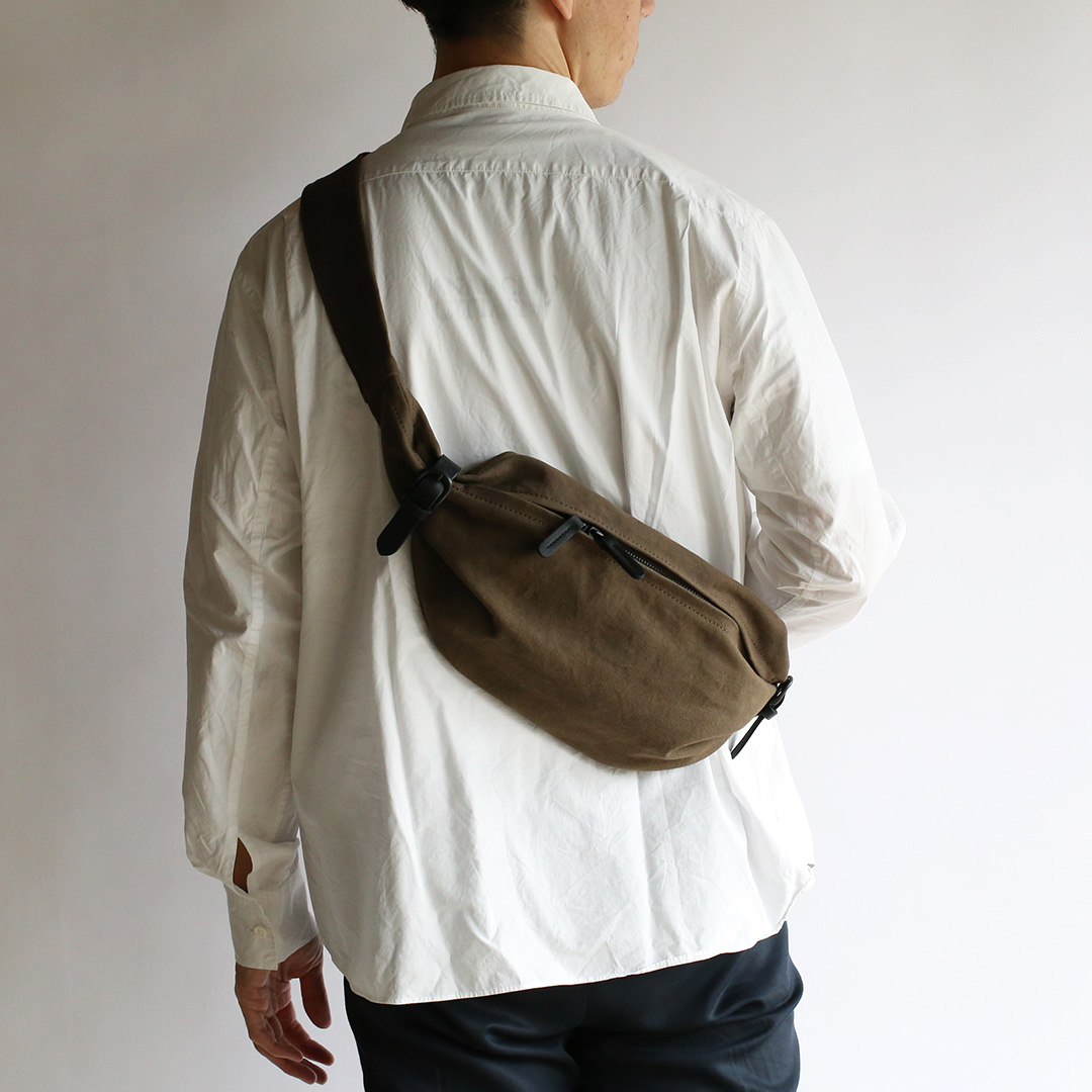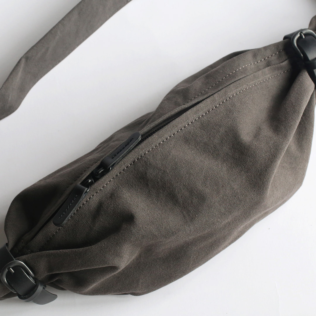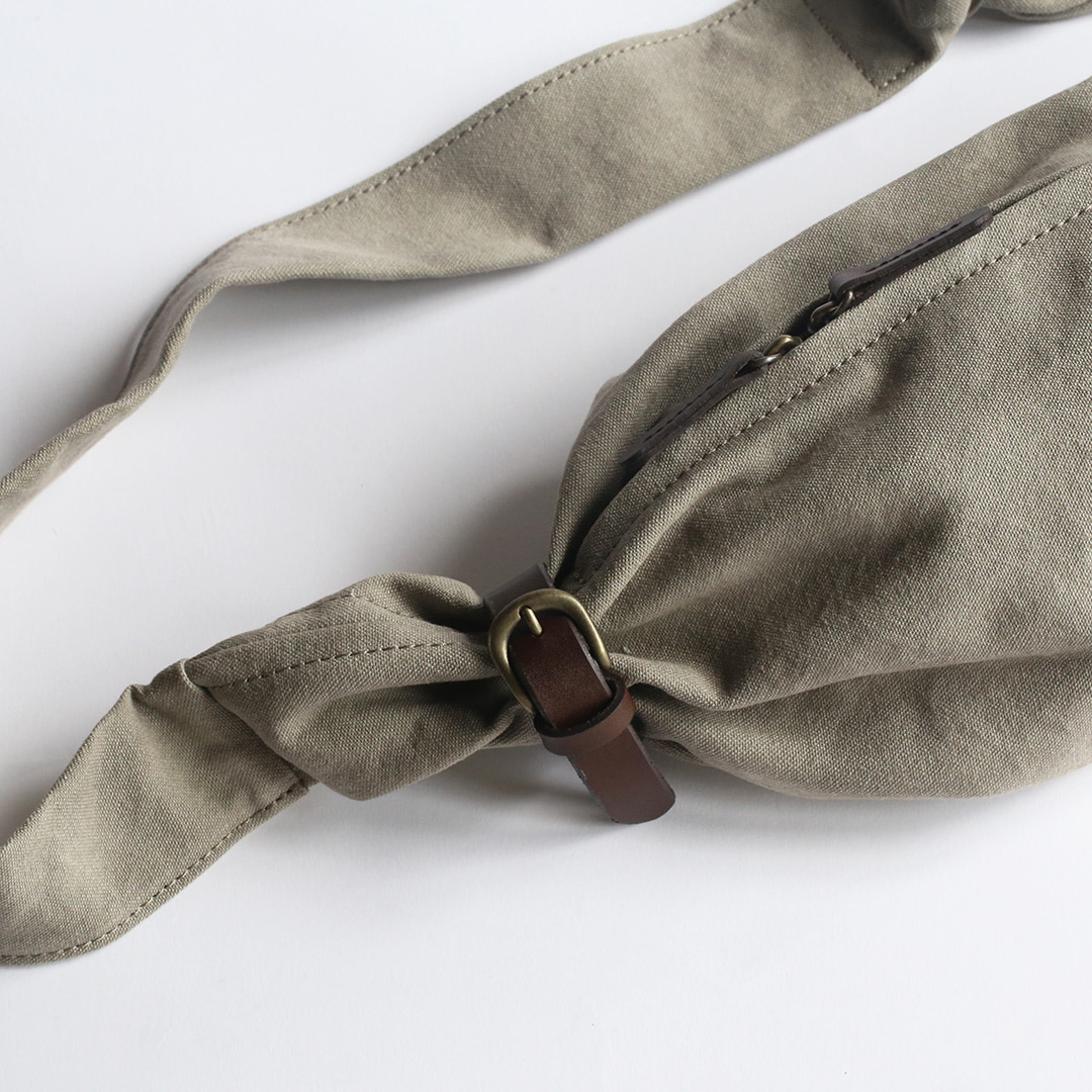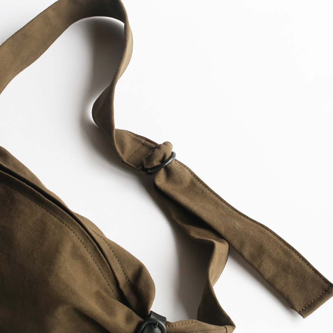 備長炭染め帆布のくたっと柔らかな素材感を活かし、荷物の形や容量に合わせて変幻自在に包むことのできる風呂敷をイメージしてつくったボディバッグ。使いやすさはもちろんのこと、使用時にできる生地のシワ感や表情が美しく出るよう、サイズや構造を綿密に計算してデザインしています。持っていることをついつい忘れるほど、衣服の一部のように自然にフィットします。