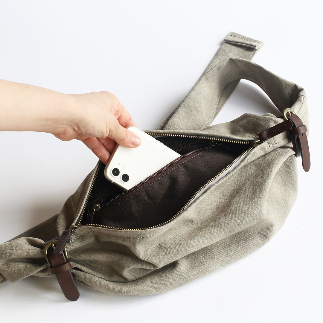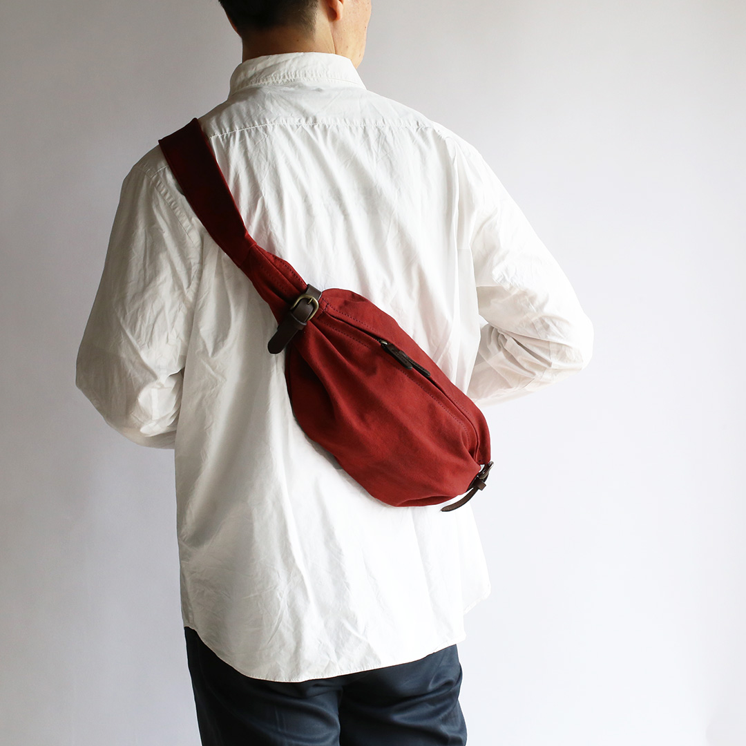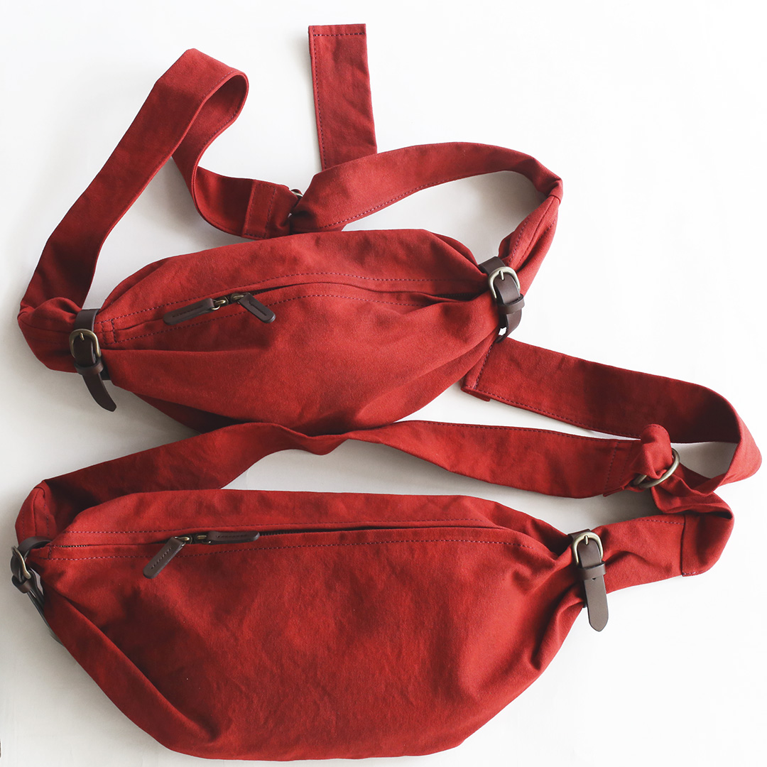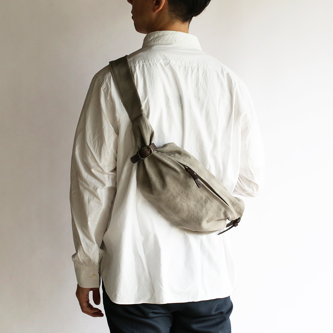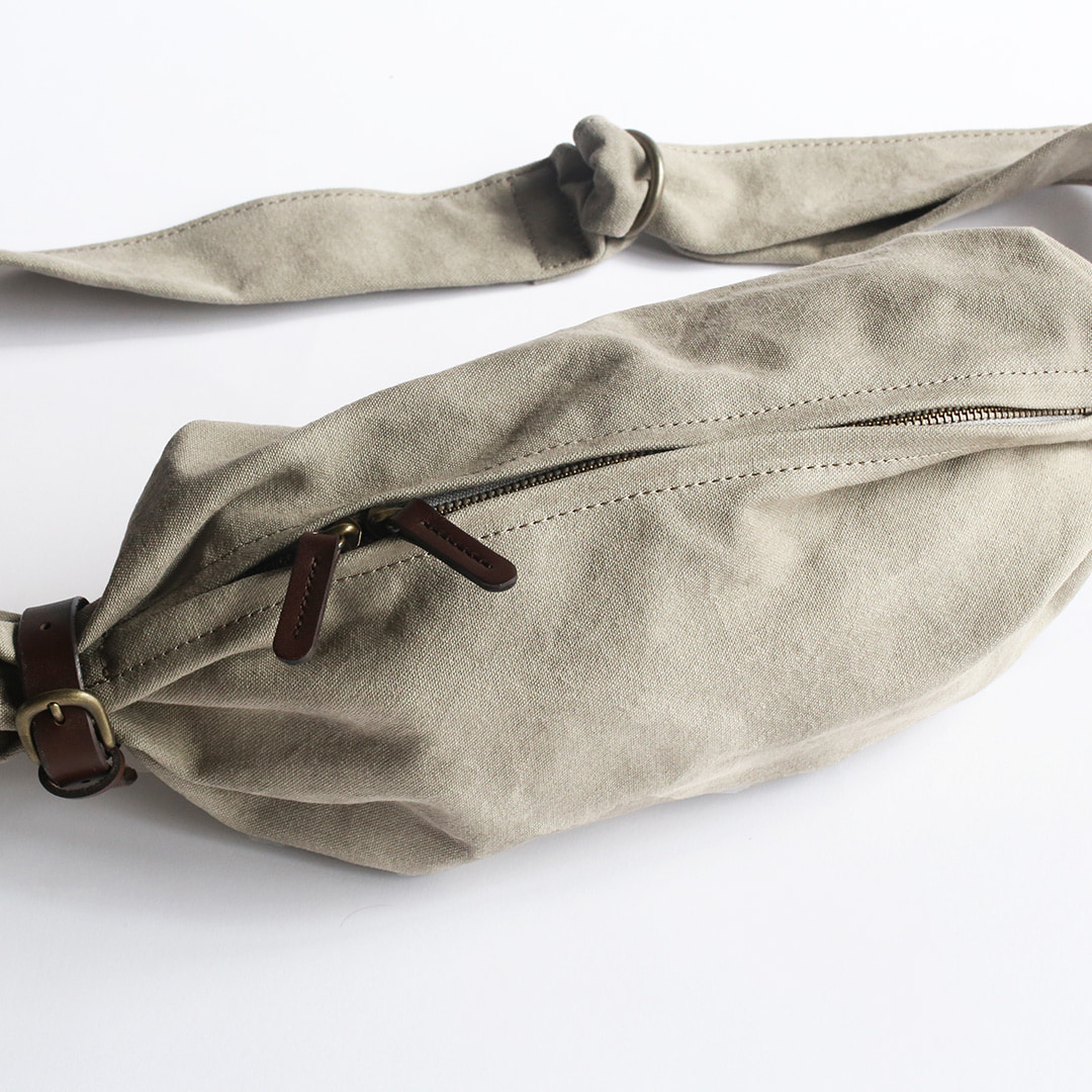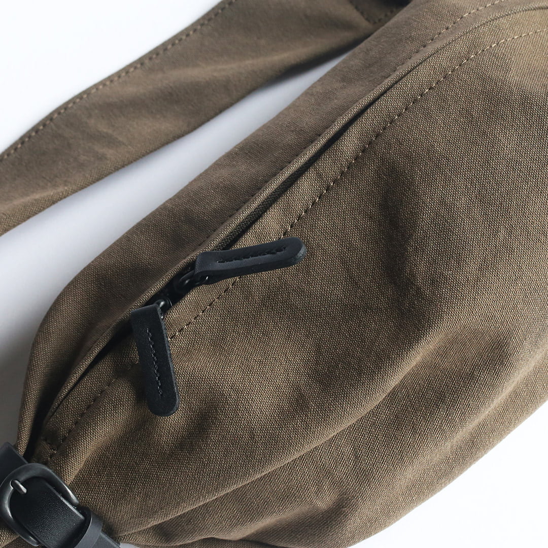 備長炭染め帆布のくたっと柔らかな素材感を活かし、荷物の形や容量に合わせて変幻自在に包むことのできる風呂敷をイメージしてつくったボディバッグ。使いやすさはもちろんのこと、使用時にできる生地のシワ感や表情が美しく出るよう、サイズや構造を綿密に計算してデザインしています。持っていることをついつい忘れるほど、衣服の一部のように自然にフィットします。