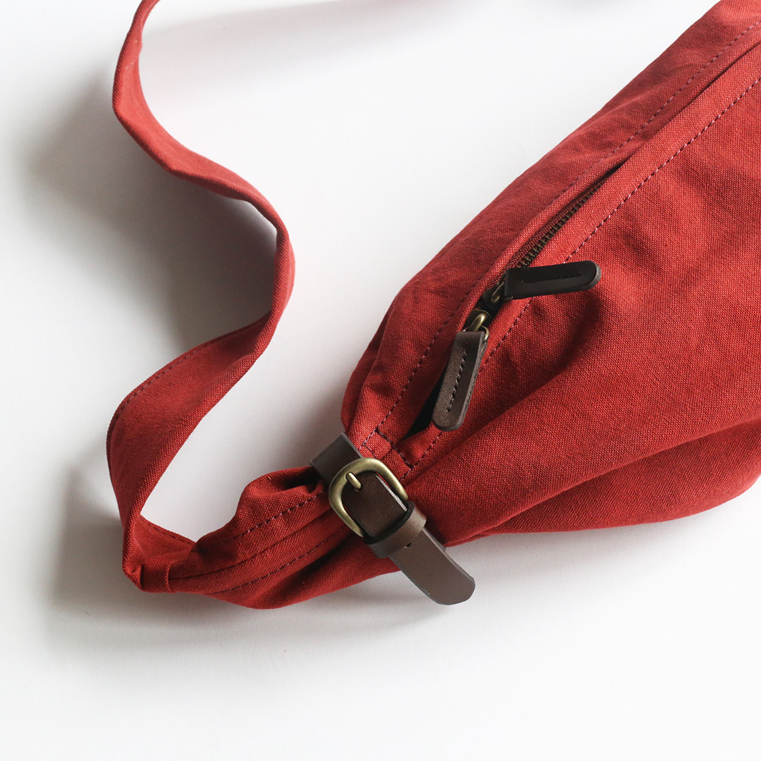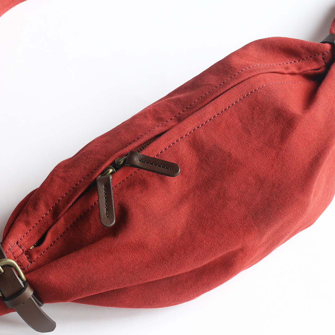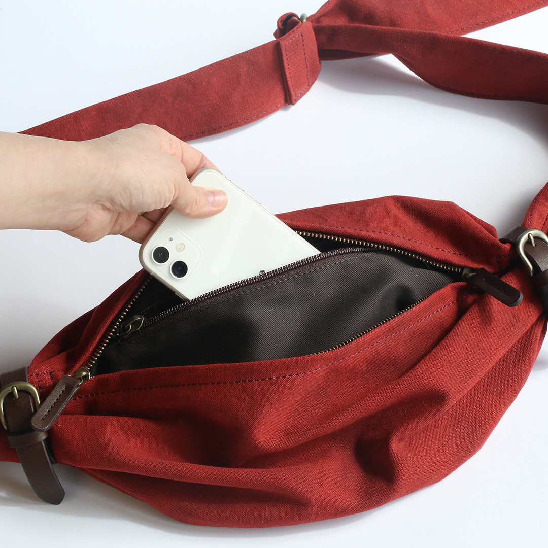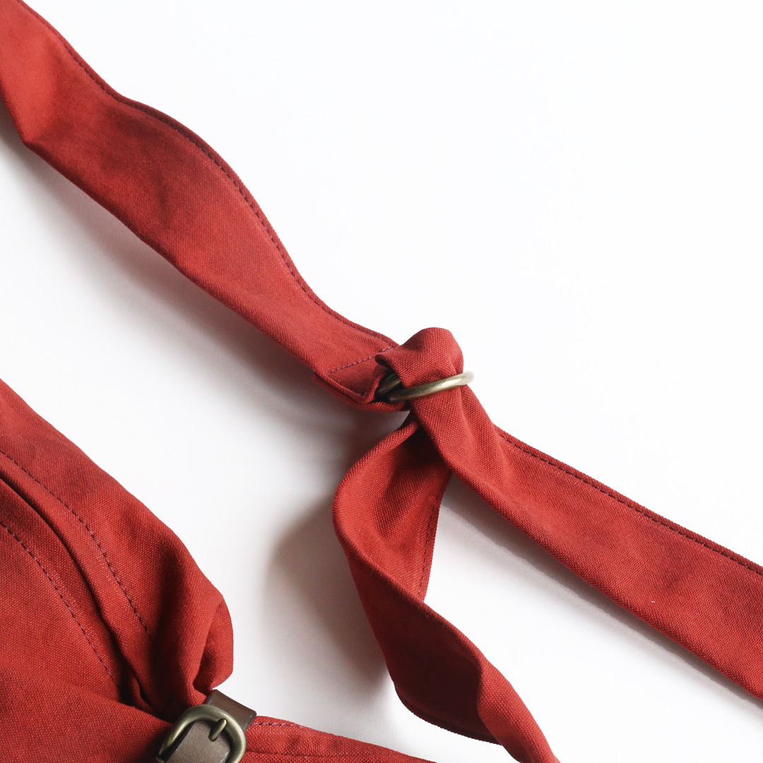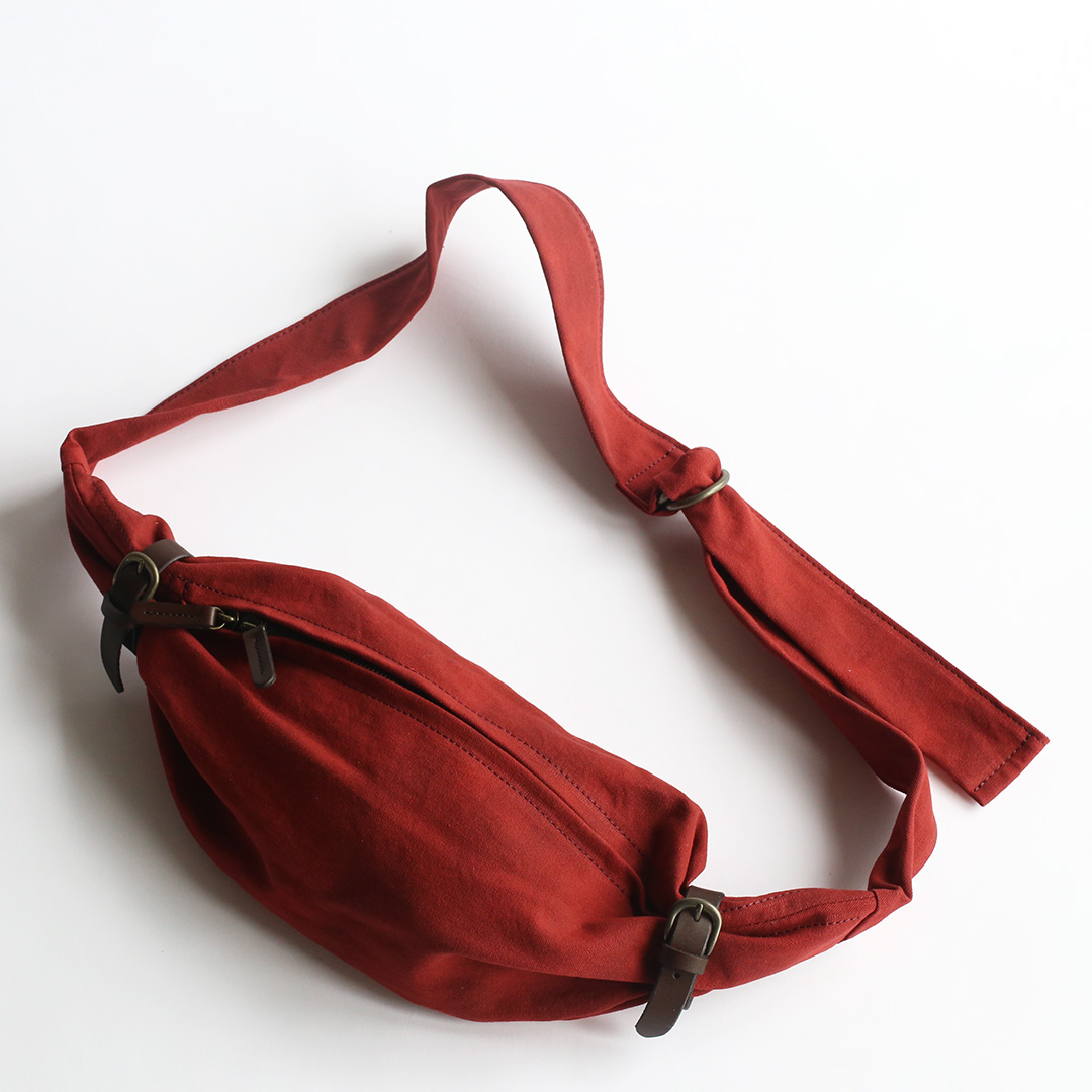 備長炭染め帆布のくたっと柔らかな素材感を活かし、荷物の形や容量に合わせて変幻自在に包むことのできる風呂敷をイメージしてつくったボディバッグ。使いやすさはもちろんのこと、使用時にできる生地のシワ感や表情が美しく出るよう、サイズや構造を綿密に計算してデザインしています。持っていることをついつい忘れるほど、衣服の一部のように自然にフィットします。