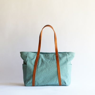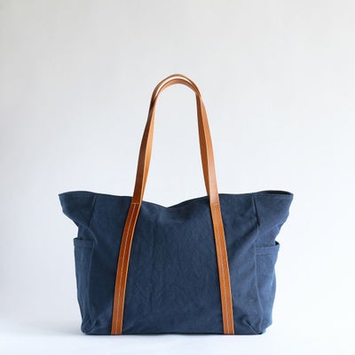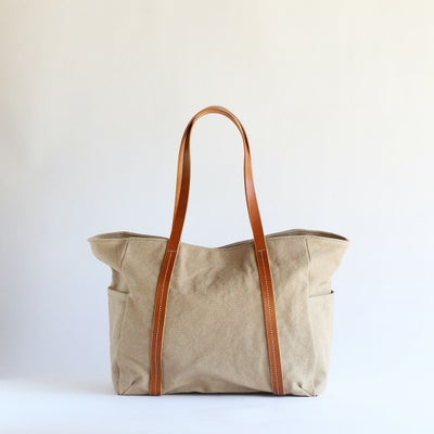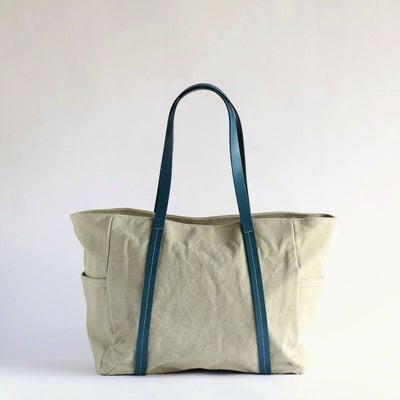 ふんわりした帆布生地のナチュラルな風合いにマッチするヌメ革の持ち手をつけています。使うほどに触れるほどに味わいが深まり、帆布生地と両方の経年変化を楽しめます。