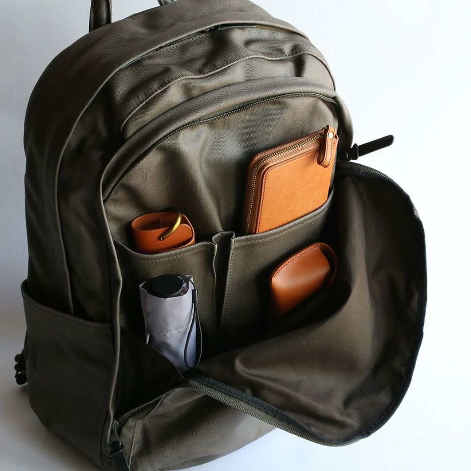 フロントポケットは開閉口がL字型になっており、4つのオーガナイズポケットが備わります。 広々したリビングにはA4ファイルや折りたたみ傘などが収納可能。もはやちょっとしたバッグなみの収納力を誇るポケットです。