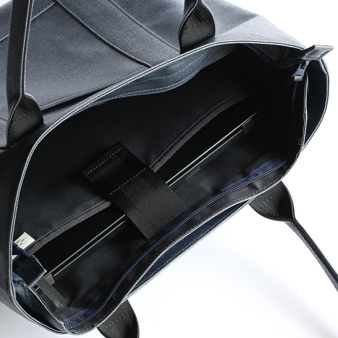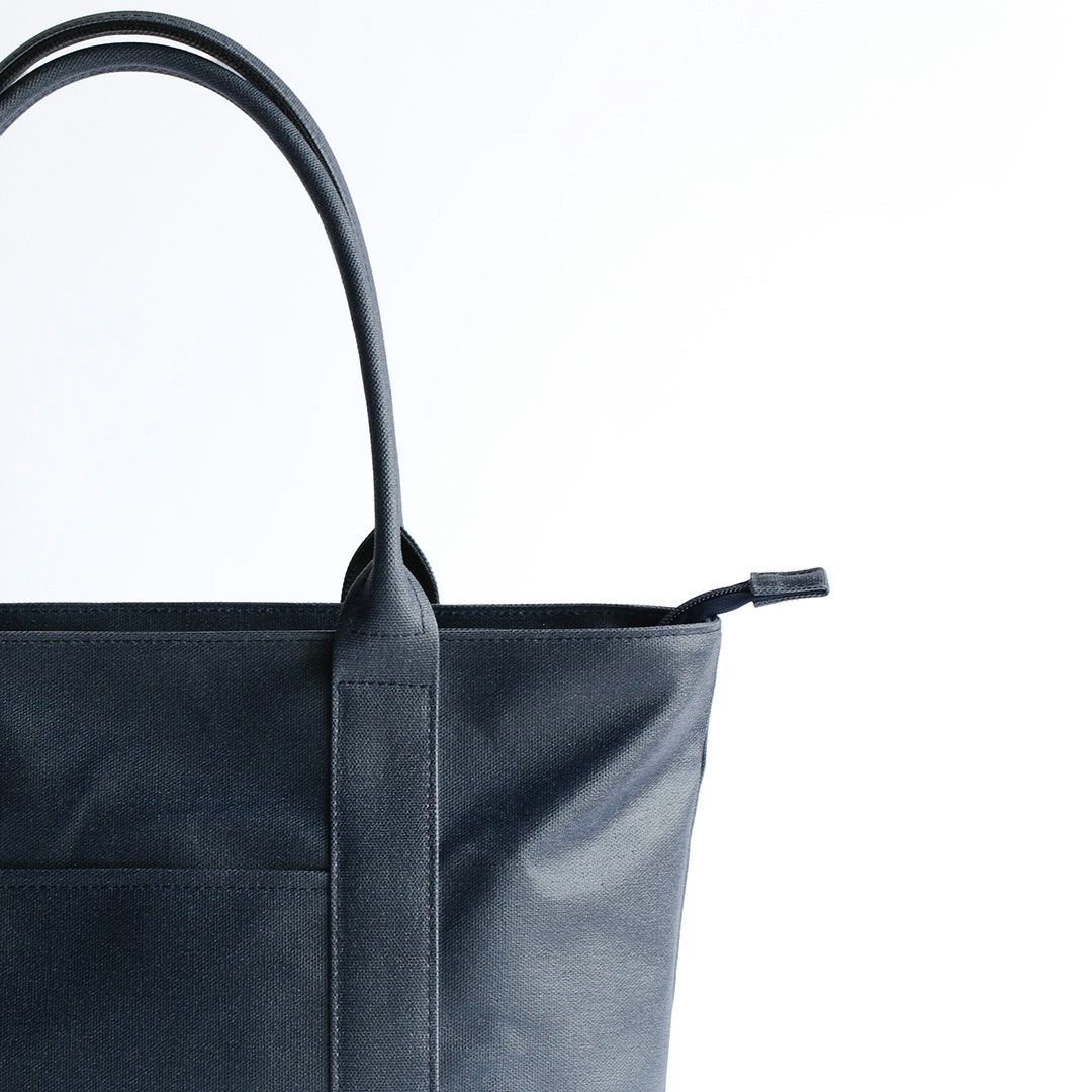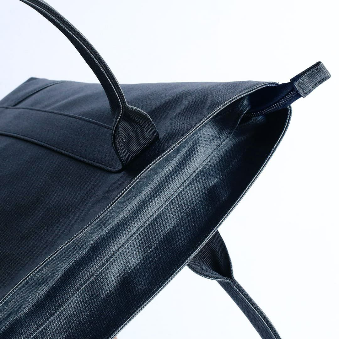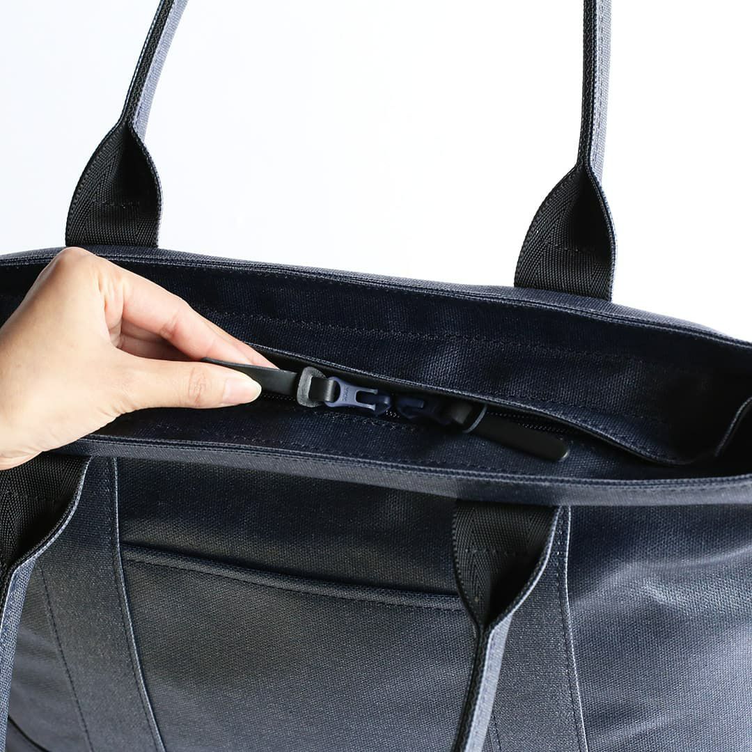このトートバッグは、ファスナー部分を覆ってくれる”屋根”のような構造を設けることで水を遮断します。 上から覆っているため、内側に空間を作ることでファスナーの摺動性・作動性を妨げません。またファスナーを覆い隠すことで防犯性にも一役買っています。