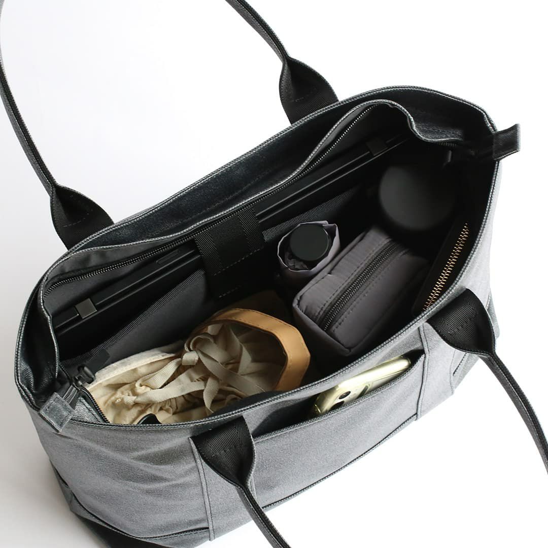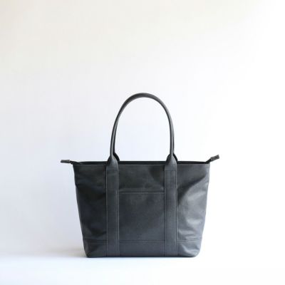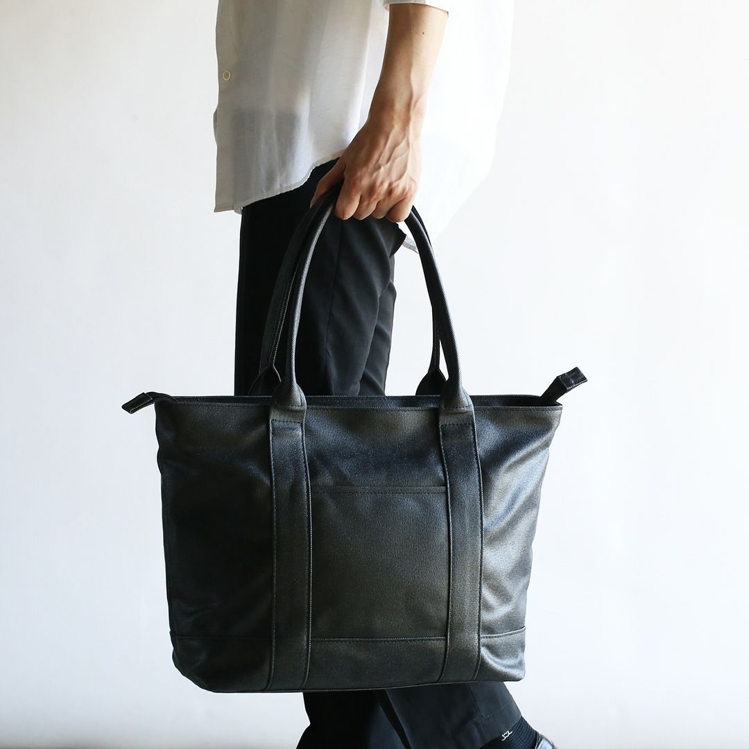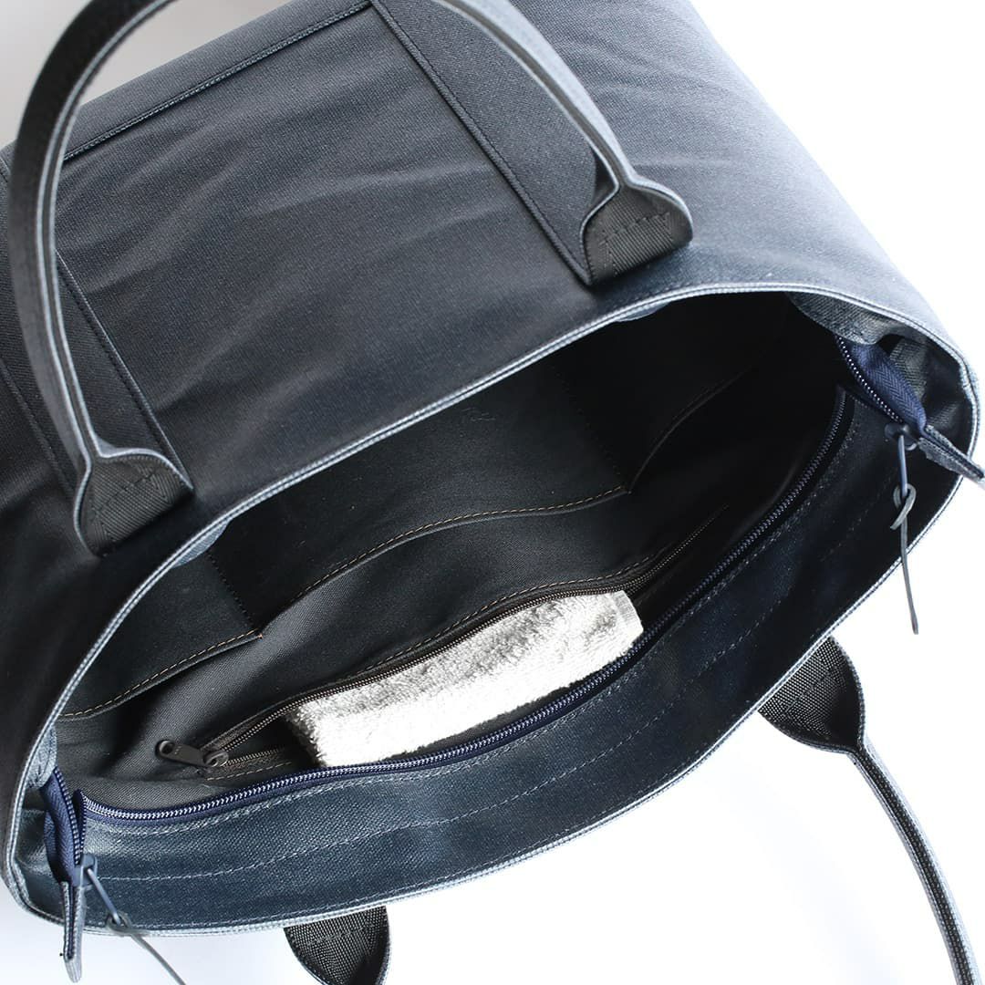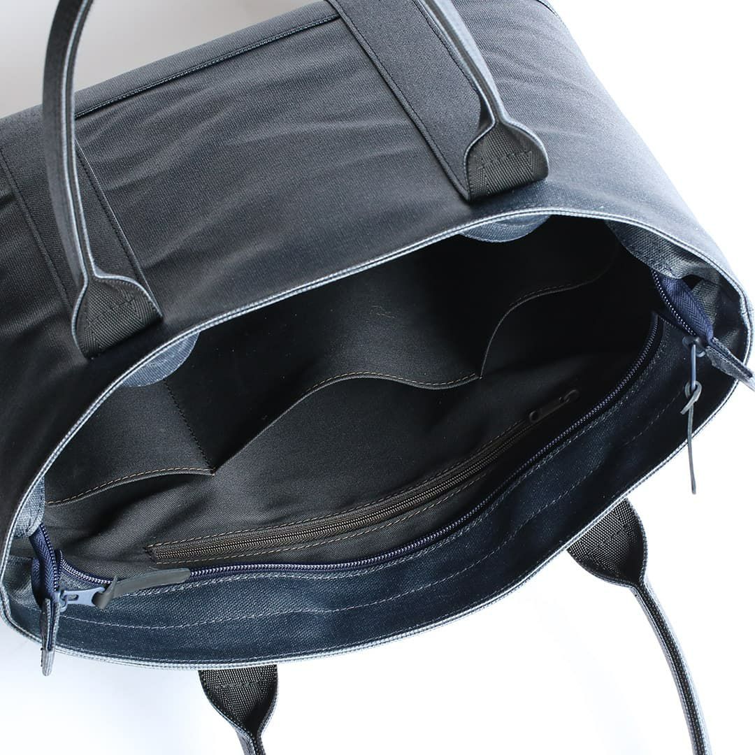 このトートバッグは、ファスナー部分を覆ってくれる”屋根”のような構造を設けることで水を遮断します。 上から覆っているため、内側に空間を作ることでファスナーの摺動性・作動性を妨げません。またファスナーを覆い隠すことで防犯性にも一役買っています。