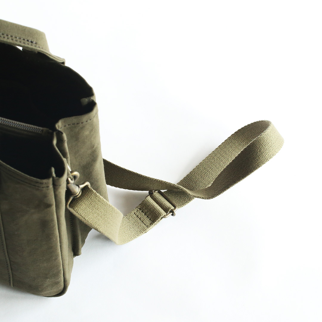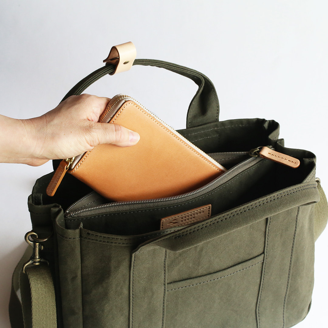 しっかりとした質感は使い込むほどに柔らかく馴染んで、くたっと感も愛らしくなっていきます。ポケットが充実しており、持ち歩く荷物を整理して見やすく収めることができるので、どこへ行くにも快適に使えます。