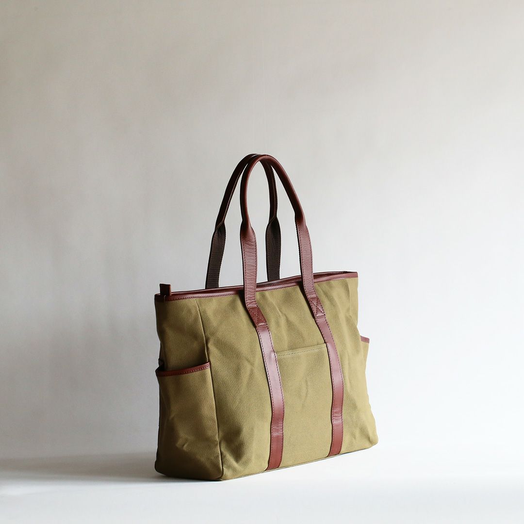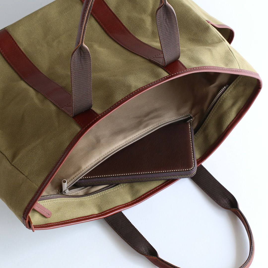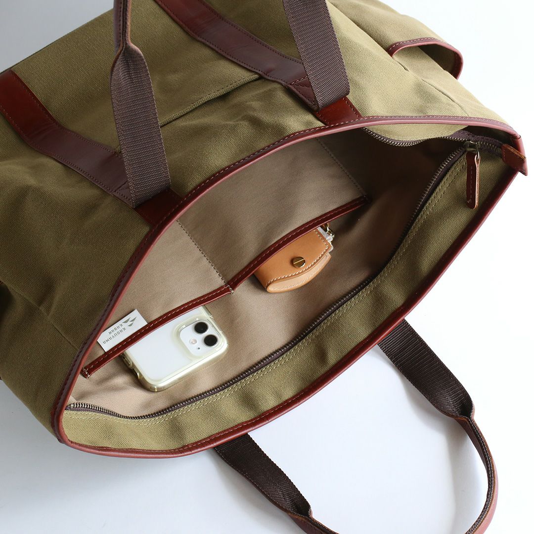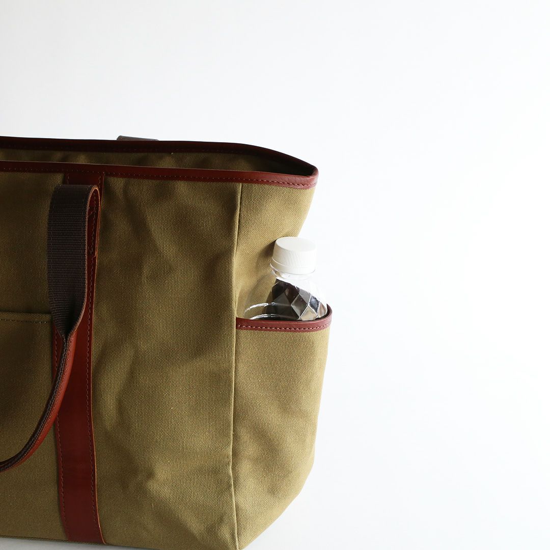 革と帆布を組み合わせた、丈夫で収納力抜群のトートバッグです。 荷物をまとめて持ち歩くのに便利な大きめサイズは、シーンを選ばず、どんなコーディネートにもマッチします。
