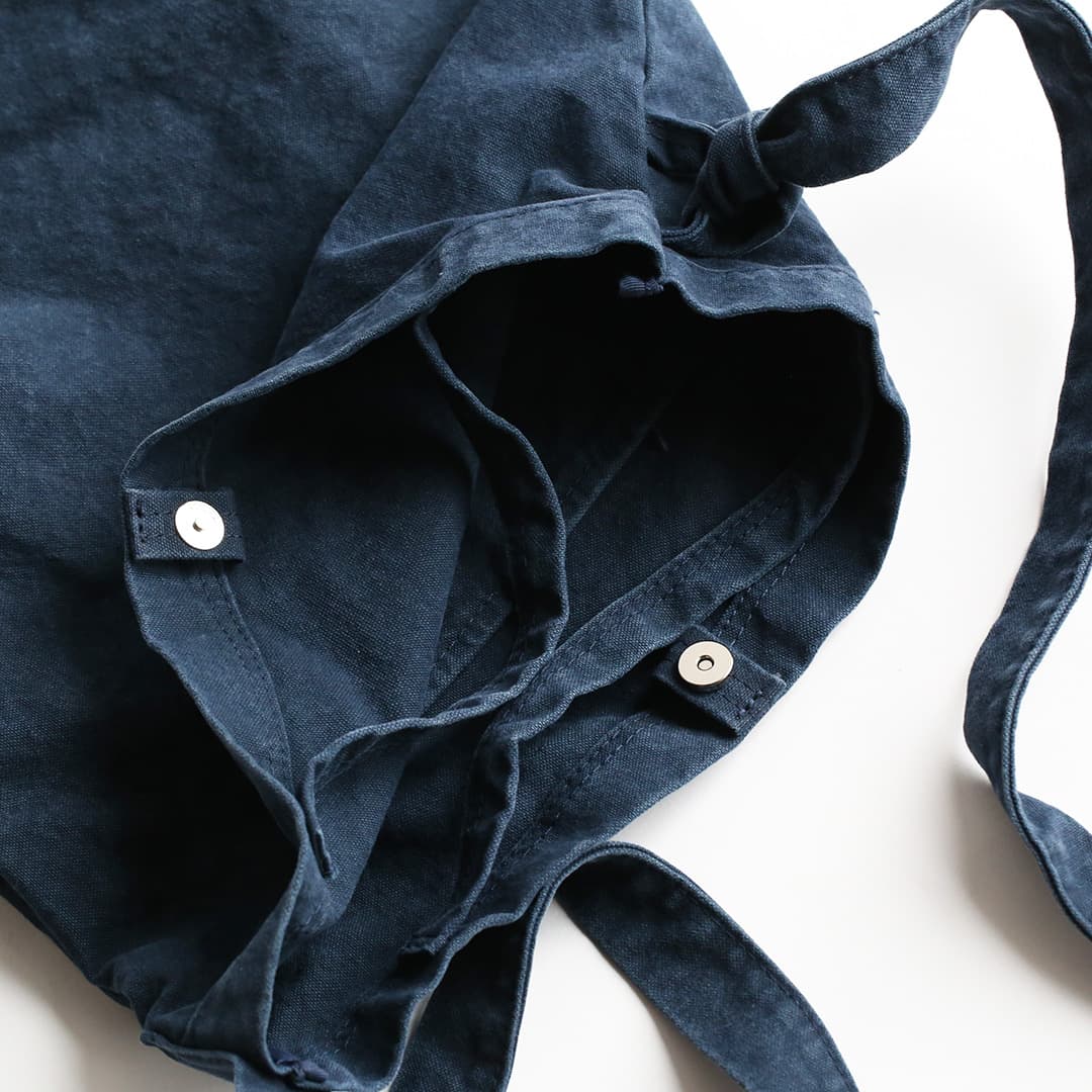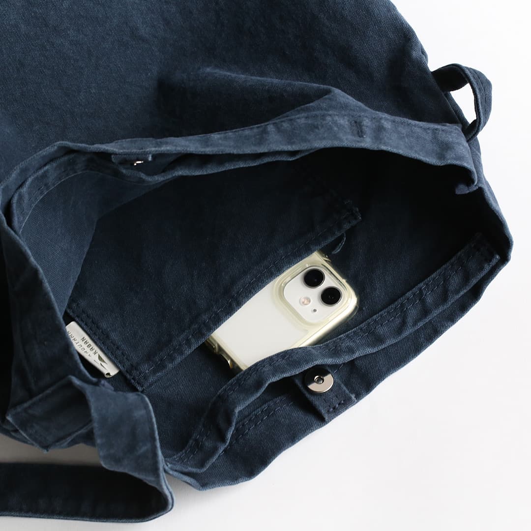 間口はマグネットホックでカチッと留めていただけます。ストーンウォッシュ加工によるダメージや破損を防ぐため、加工後に手作業で取り付けています。また、マグネットホックをカバン本体に直接取り付けるのではなく、帆布でつくった輪状のパーツに取りつけることで、持ち手を持ったまま片手でもマグネットホックを開け閉めしやすいよう工夫しています。シンプルなつくりのなかにも、使い心地へのこだわりを。