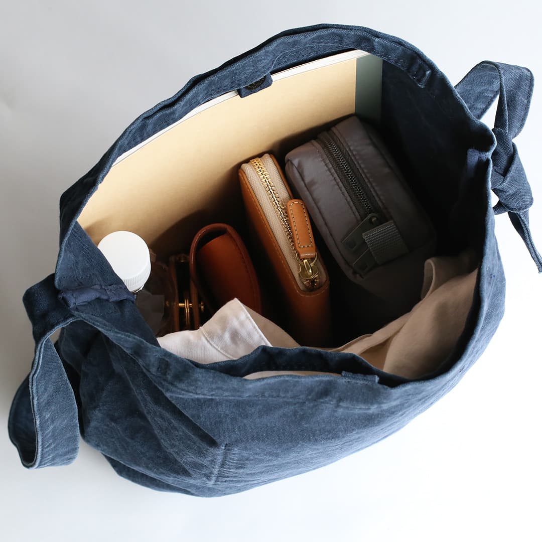 使うシーンに合わせて肩かけとしても手さげスタイルとしても持てる2WAYタイプ。持ち手は内側に取り付けているため、外からは見えないところがすっきりとしたデザインのためのポイント。軽くて、くたっと柔らかな肌触りと長く愛用してきたかのようなこなれ感を味わいながら、たくさんの荷物もラフに楽に持ち運べます。