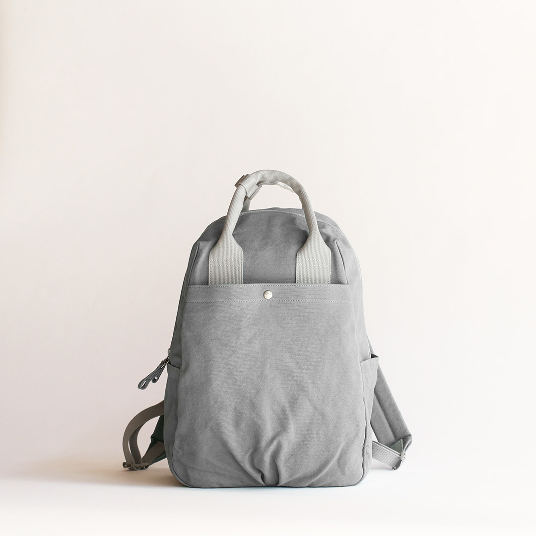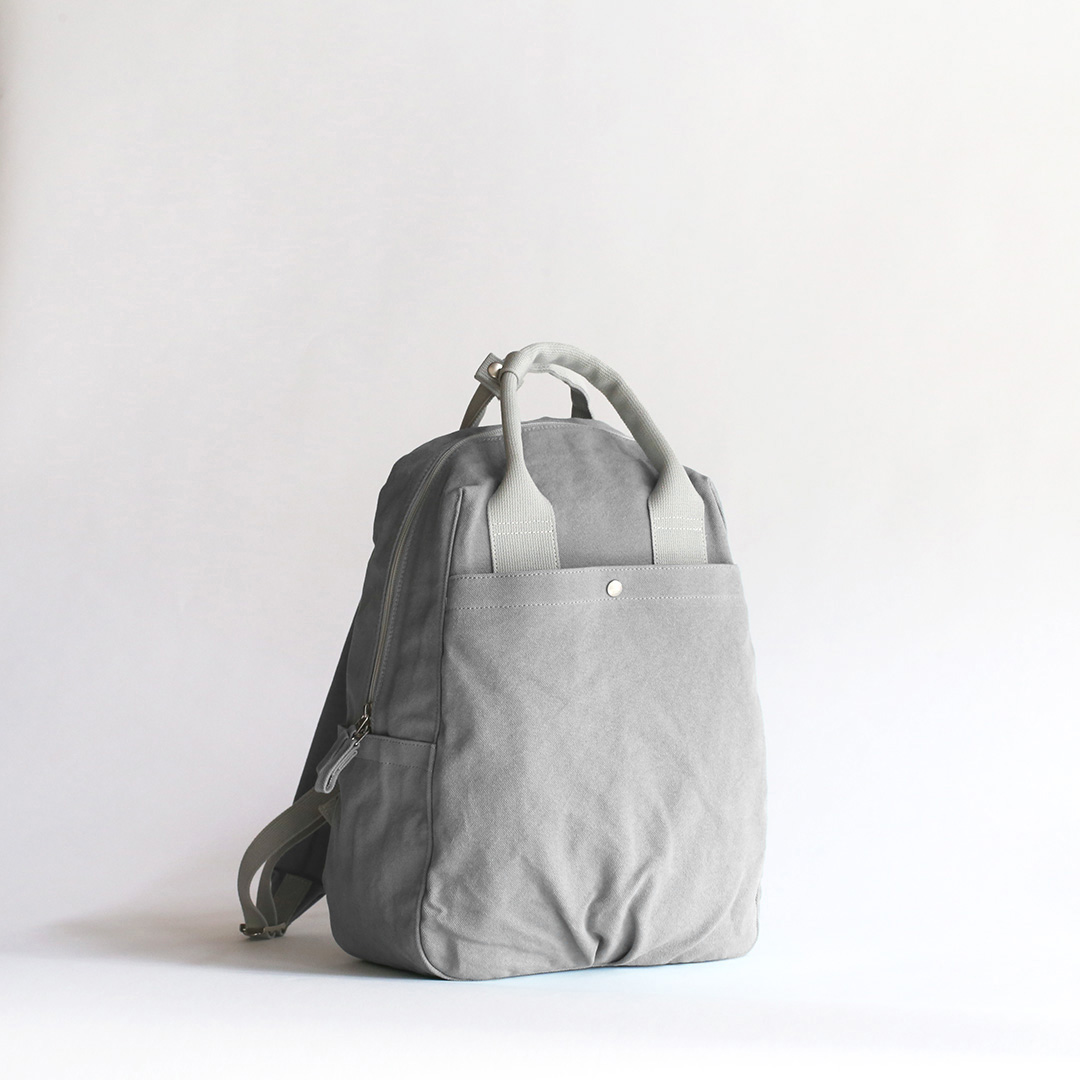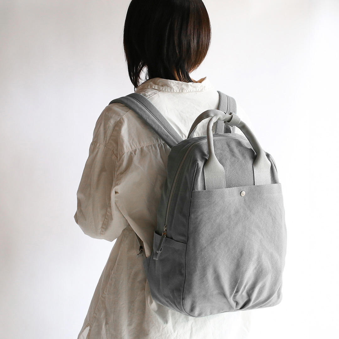 国産の8号帆布でつくった、持ち手が自立するA4サイズ対応のリュックです。背負っても持っても愛らしい、ふんわり柔らかい雰囲気のデザインは、リュック本体からマチへ回り込むように形取る設計により生み出されています。見た目はふんわりしてますが、持ち手やベルトのつくりのこだわりなど、快適な背負い心地のための工夫はしっかり詰め込んでいます。
