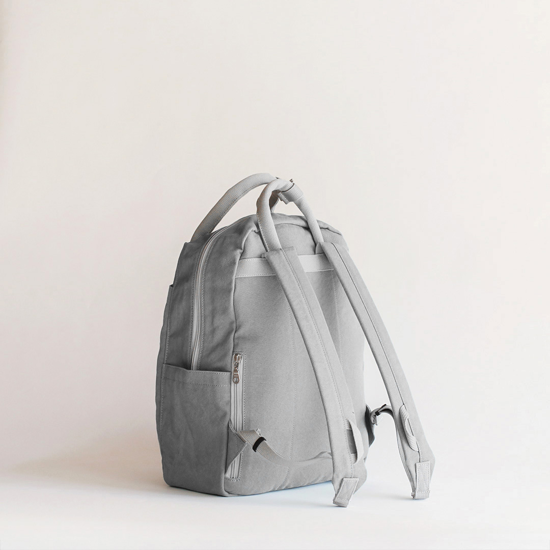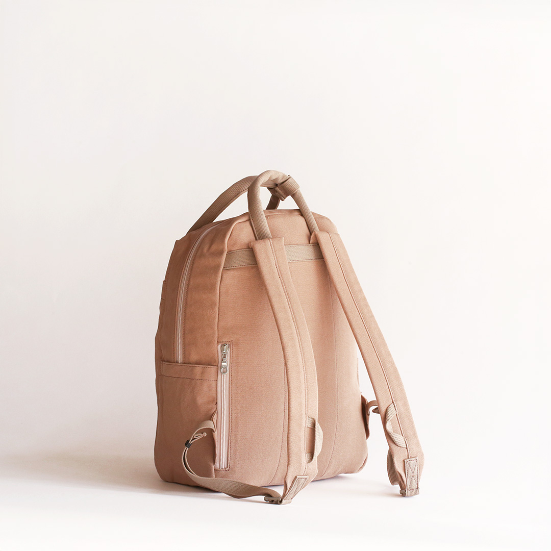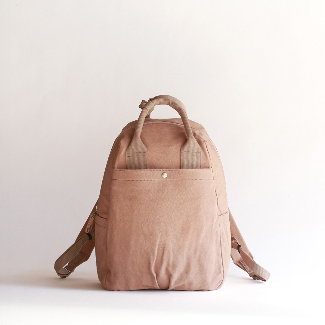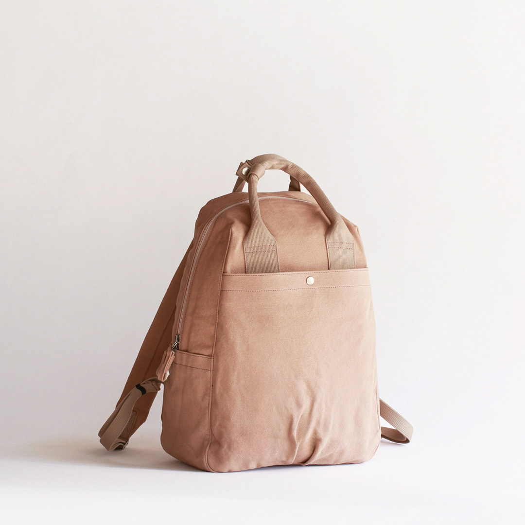 国産の8号帆布でつくった、持ち手が自立するA4サイズ対応のリュックです。背負っても持っても愛らしい、ふんわり柔らかい雰囲気のデザインは、リュック本体からマチへ回り込むように形取る設計により生み出されています。見た目はふんわりしてますが、持ち手やベルトのつくりのこだわりなど、快適な背負い心地のための工夫はしっかり詰め込んでいます。