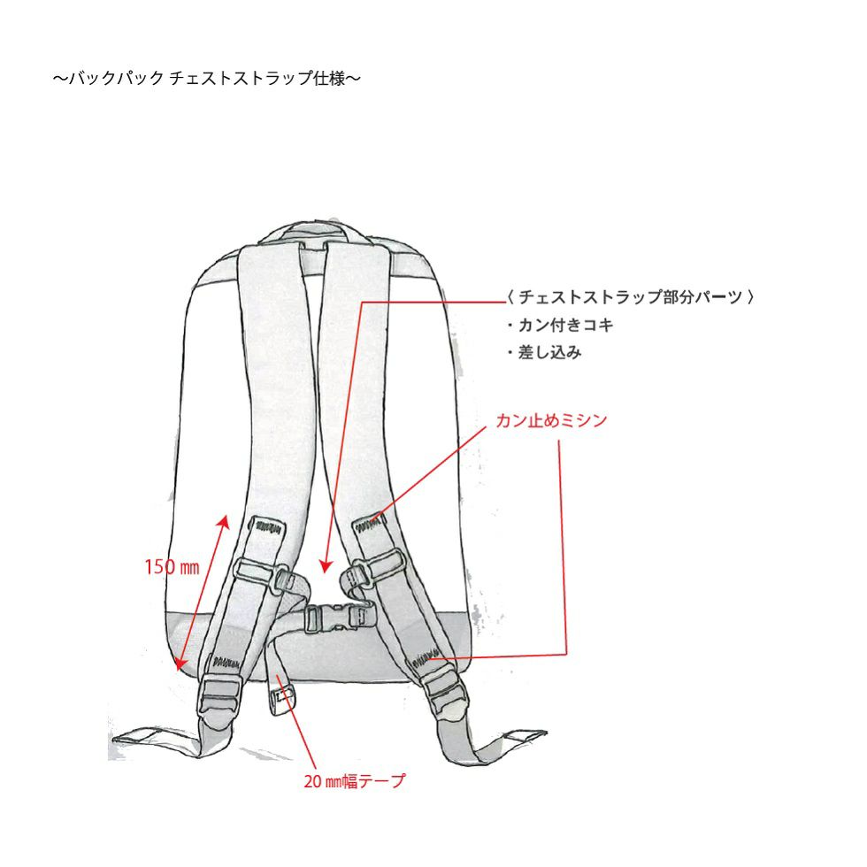 ユーザー様から付けてほしいとのお声をいただいたことから、チェストストラップをう。チェストベルト、チェストハーネスなど呼び方はいろいろありますが、自由に呼んで下さい。これで荷物満載のバックパックを背負っても肩のベルトが外に広がらず、ズレることがないので安定感もバッチリです。おまけに体感重量も軽く感じることができると、いいことずくめでございます。