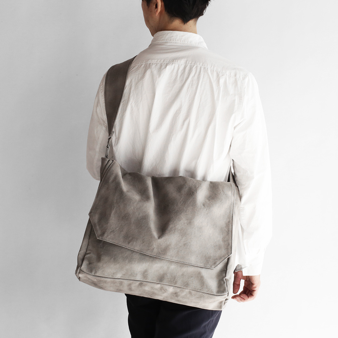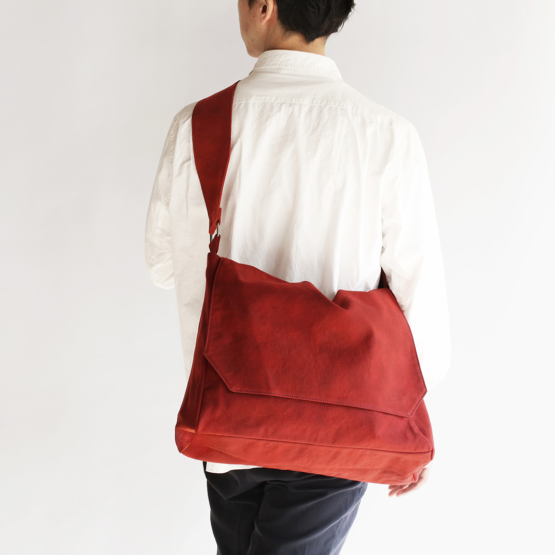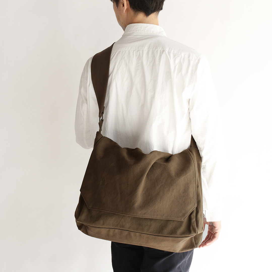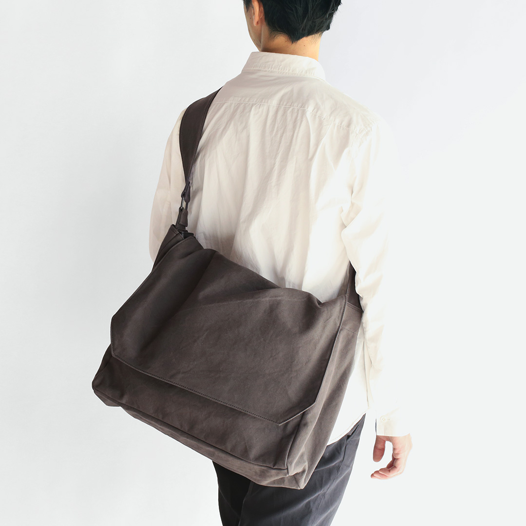 ショルダーバッグのサイズや構造を綿密に計算し、備長炭染め帆布のくたっと柔らかな素材感はそのままに、荷物を入れた時にも型崩れせずに、どなたでも美しいシルエットのままお使いいただけるつくりを実現させました。
