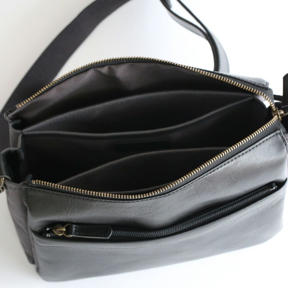 裏か表かファスナーのある面を便宜上、前胴と設定しておりますが、前と後ろ、それぞれに革の表情を楽しんでいただける”ダブルフェイス”のショルダーバッグです。お好みや状況に合わせて使い分けをお楽しみください。