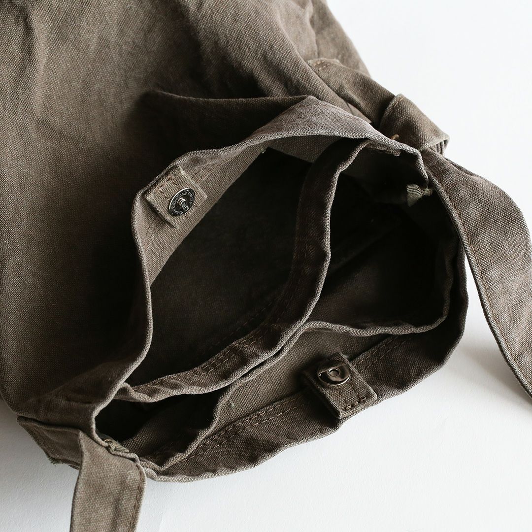 間口はマグネットホックでカチッと留めていただけます。ストーンウォッシュ加工によるダメージや破損を防ぐため、加工後に手作業で取り付けています。また、マグネットホックをカバン本体に直接取り付けるのではなく、帆布でつくった輪状のパーツに取りつけることで、持ち手を持ったまま片手でもマグネットホックを開け閉めしやすいよう工夫しています。シンプルなつくりのなかにも、使い心地へのこだわりを。
