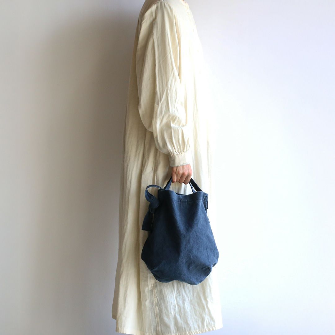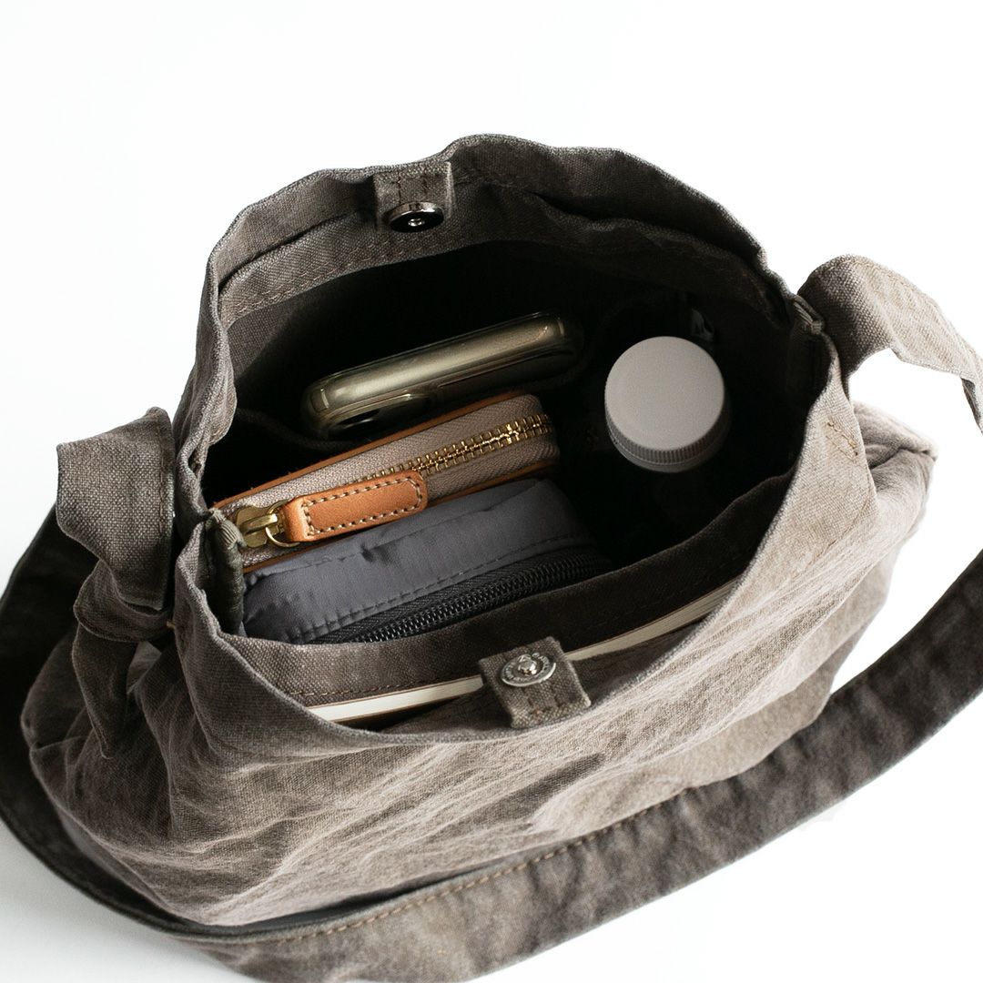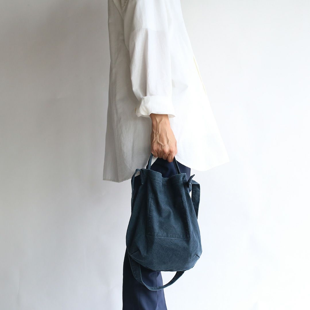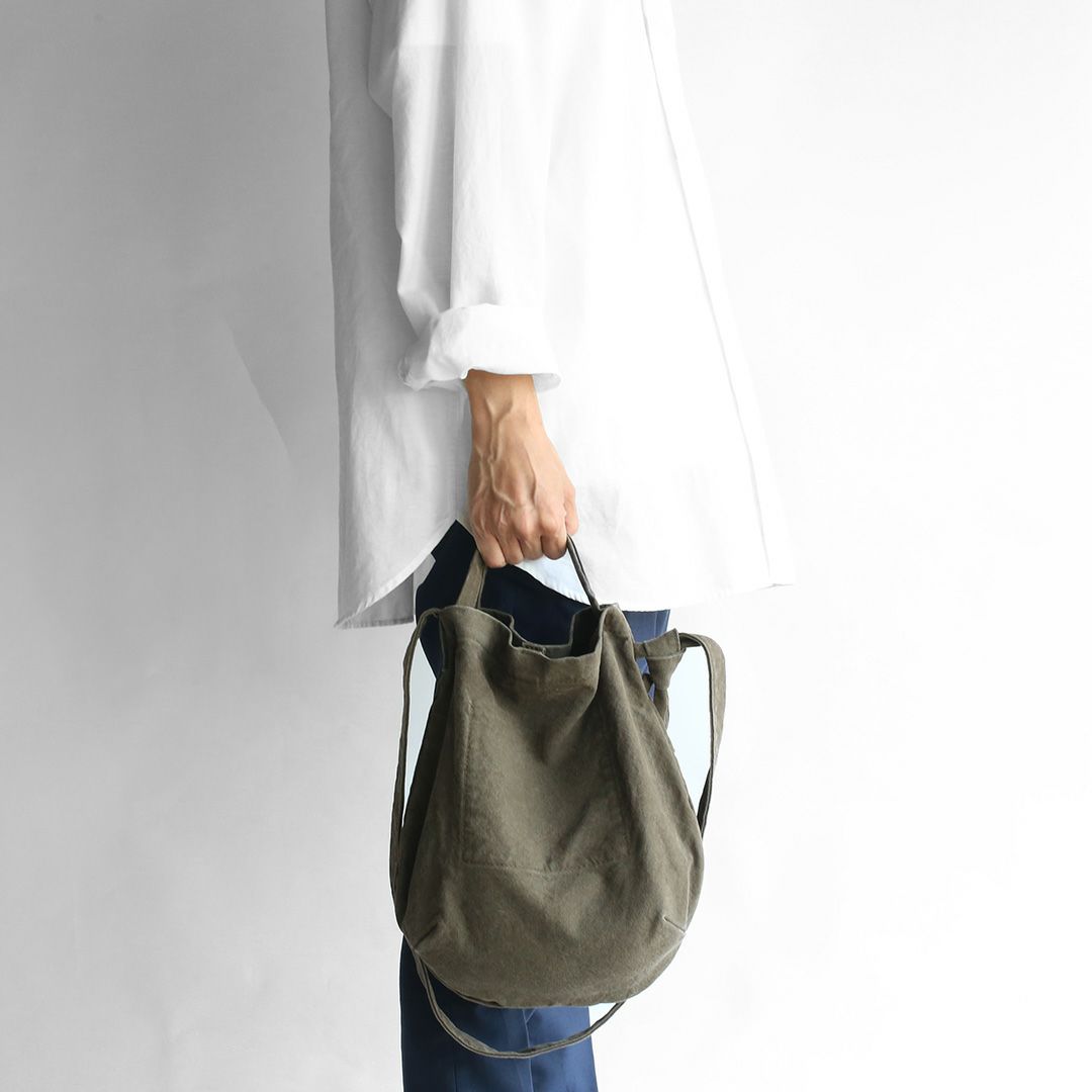 使うシーンに合わせて肩かけとしても手さげスタイルとしても持てる2WAYタイプ。持ち手は内側に取り付けているため、外からは見えないところがすっきりとしたデザインのためのポイント。重さはわずか約200g!くたっと柔らかな肌触りと長く愛用してきたかのようなこなれ感を味わいながら、どこへでもラフに楽に持ち運べます。コンパクトに折りたたむこともできるので、サブバッグとして携帯しておくのもおすすめです。
