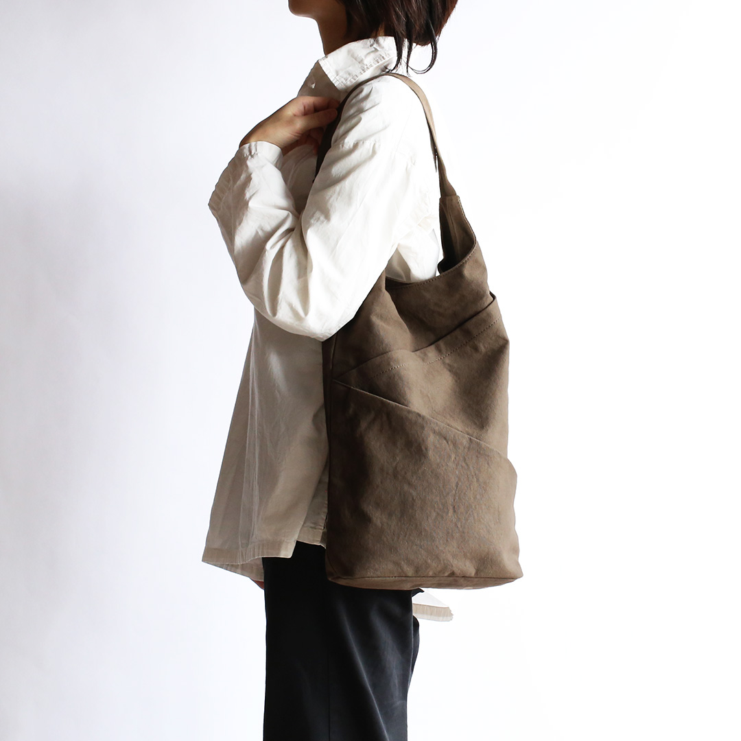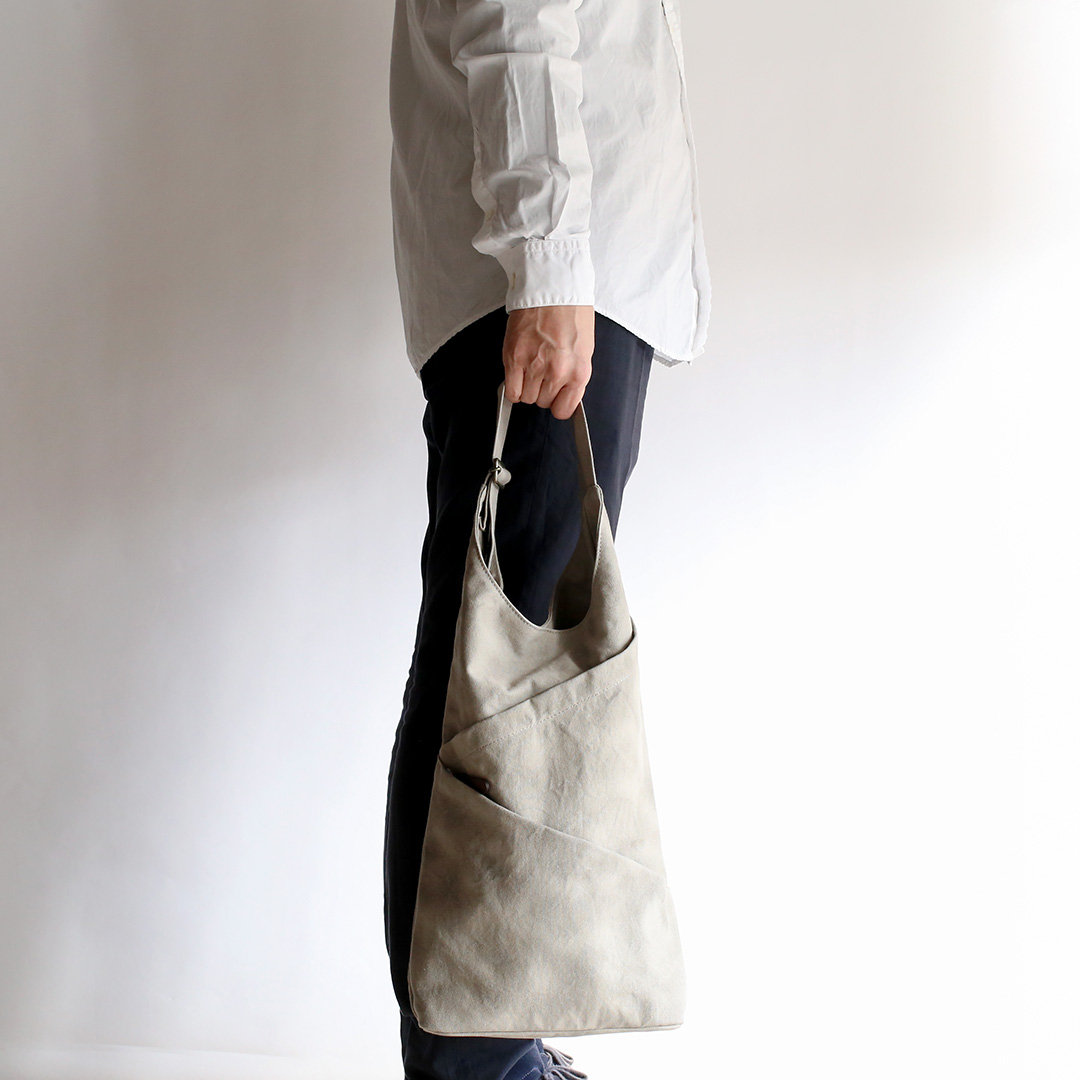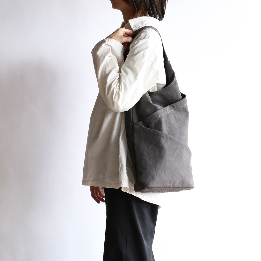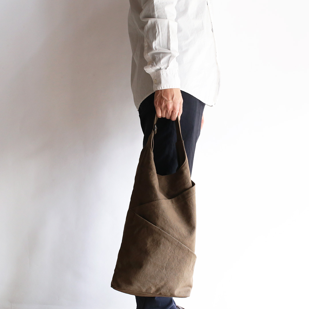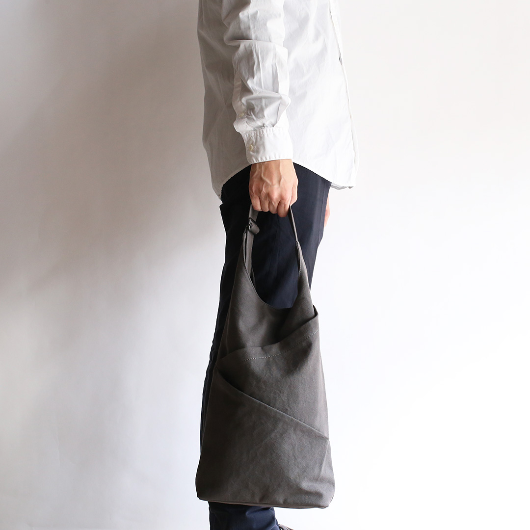 新芽からちょっと伸びたタケノコのようなデザインに、備長炭染めの味わい深い帆布の質感を組み合わせることで、ユニークなトートバッグに仕上がりました。A4サイズのファイルも縦に収納できる、見た目もすっきりスリムな深型のトートです。ショルダーベルトを短くして手提げにすると、肩掛けスタイルとはまた違ったシルエットに。ベルトの長さで変わる雰囲気もお楽しみください。