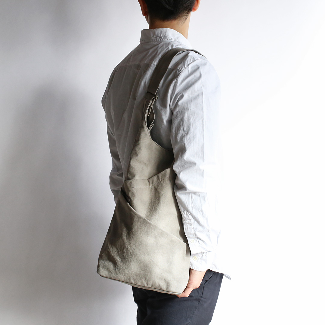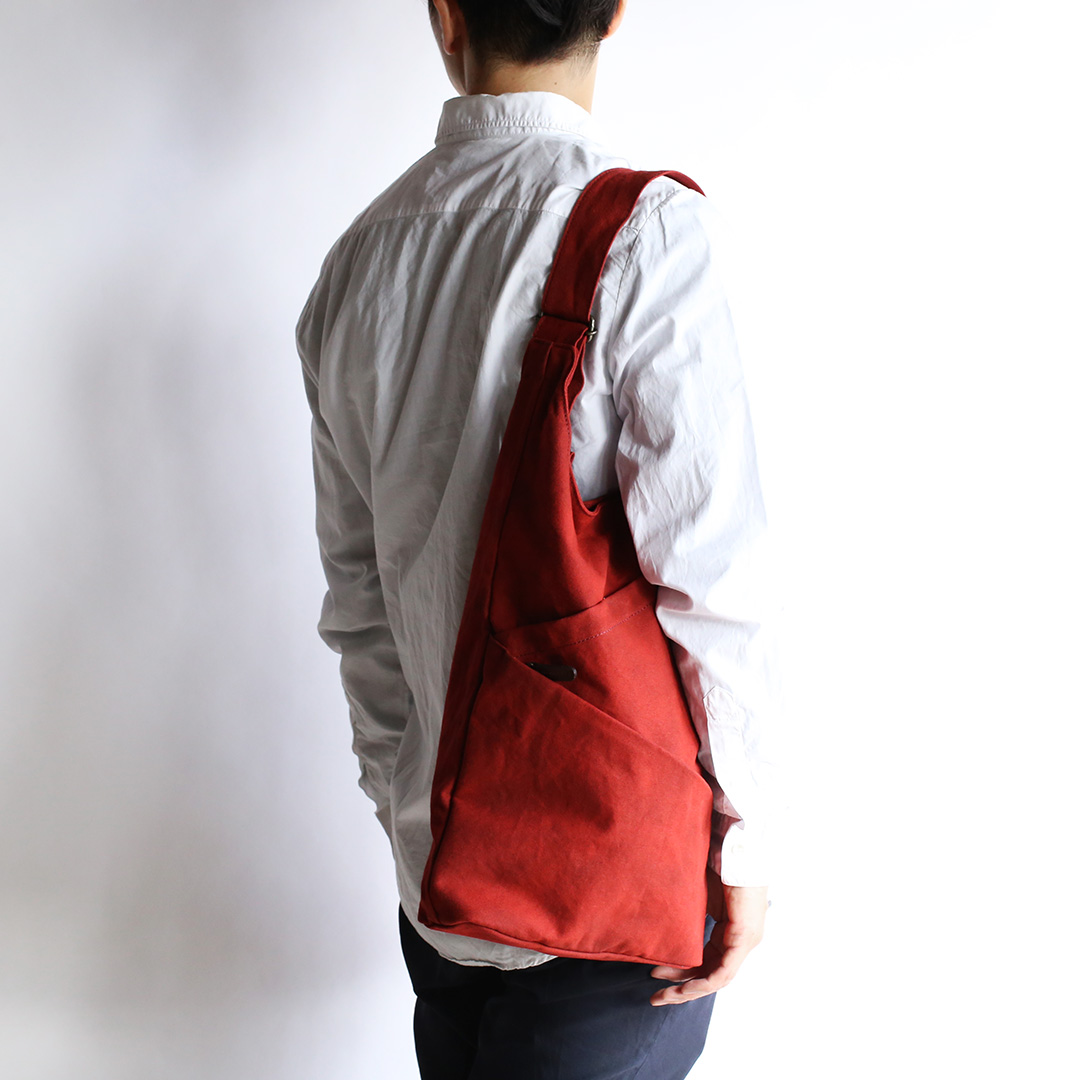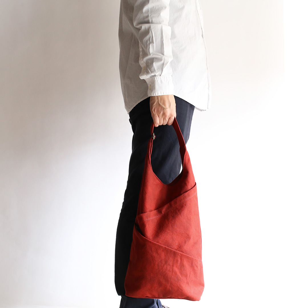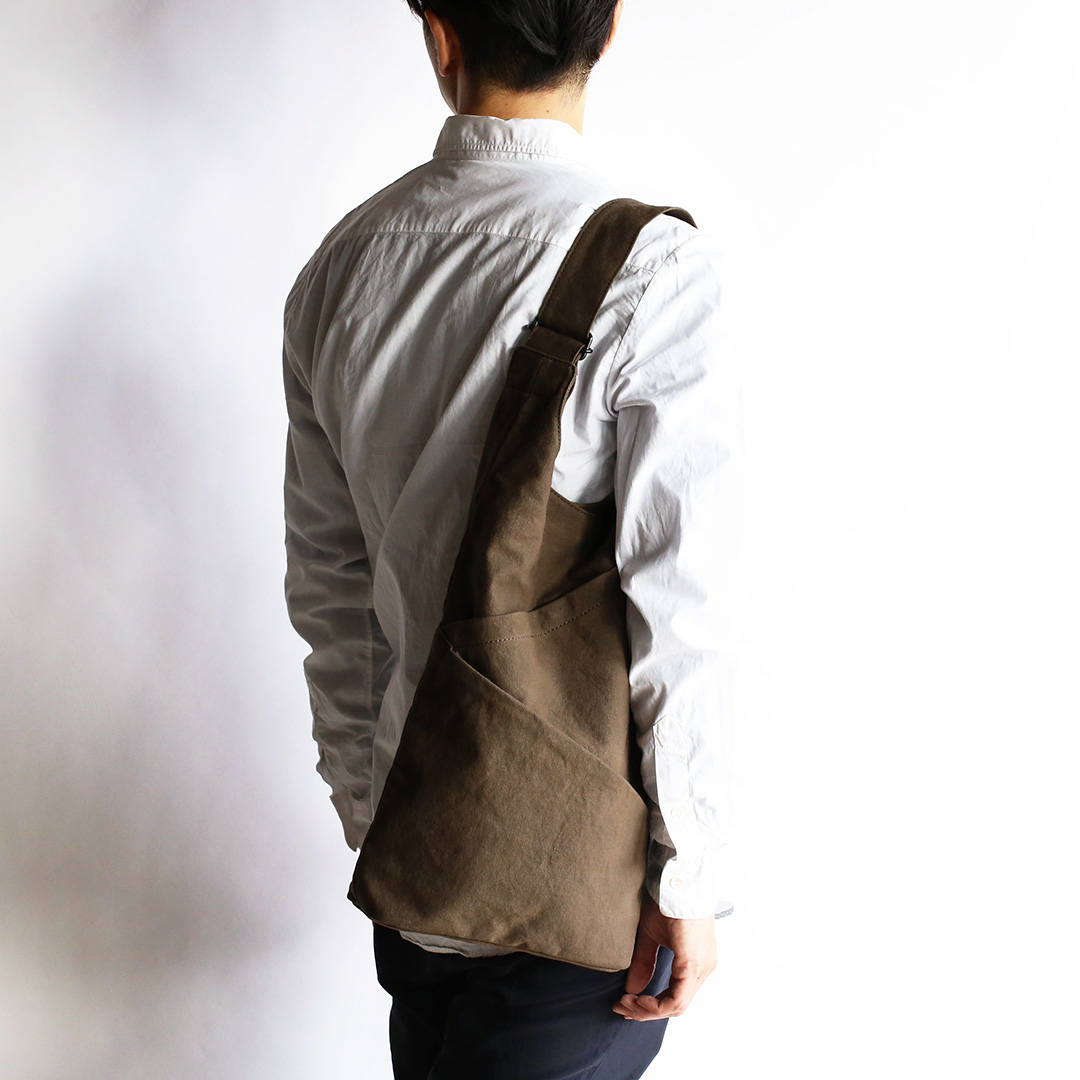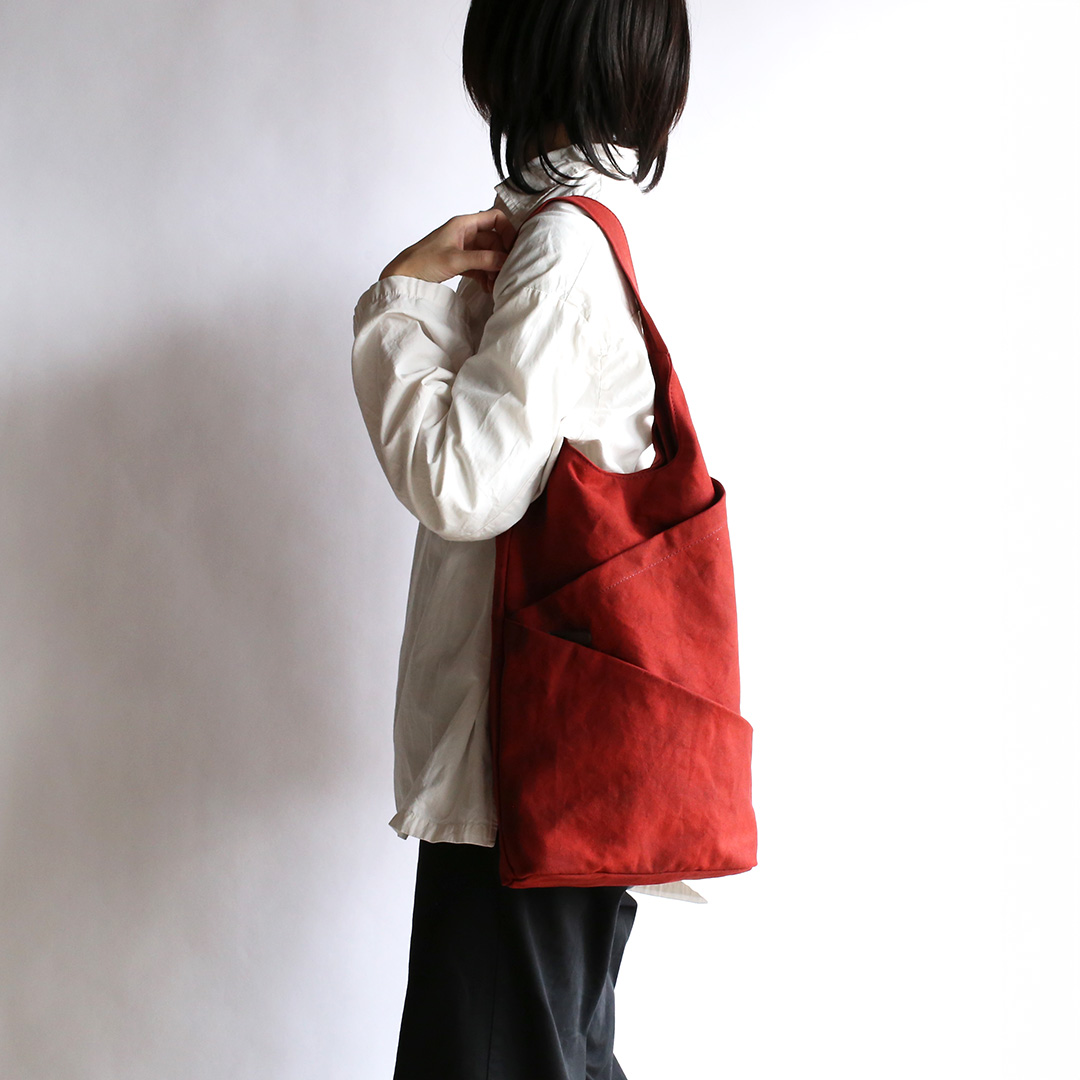 新芽からちょっと伸びたタケノコのようなデザインに、備長炭染めの味わい深い帆布の質感を組み合わせることで、ユニークなトートバッグに仕上がりました。A4サイズのファイルも縦に収納できる、見た目もすっきりスリムな深型のトートです。ショルダーベルトを短くして手提げにすると、肩掛けスタイルとはまた違ったシルエットに。ベルトの長さで変わる雰囲気もお楽しみください。