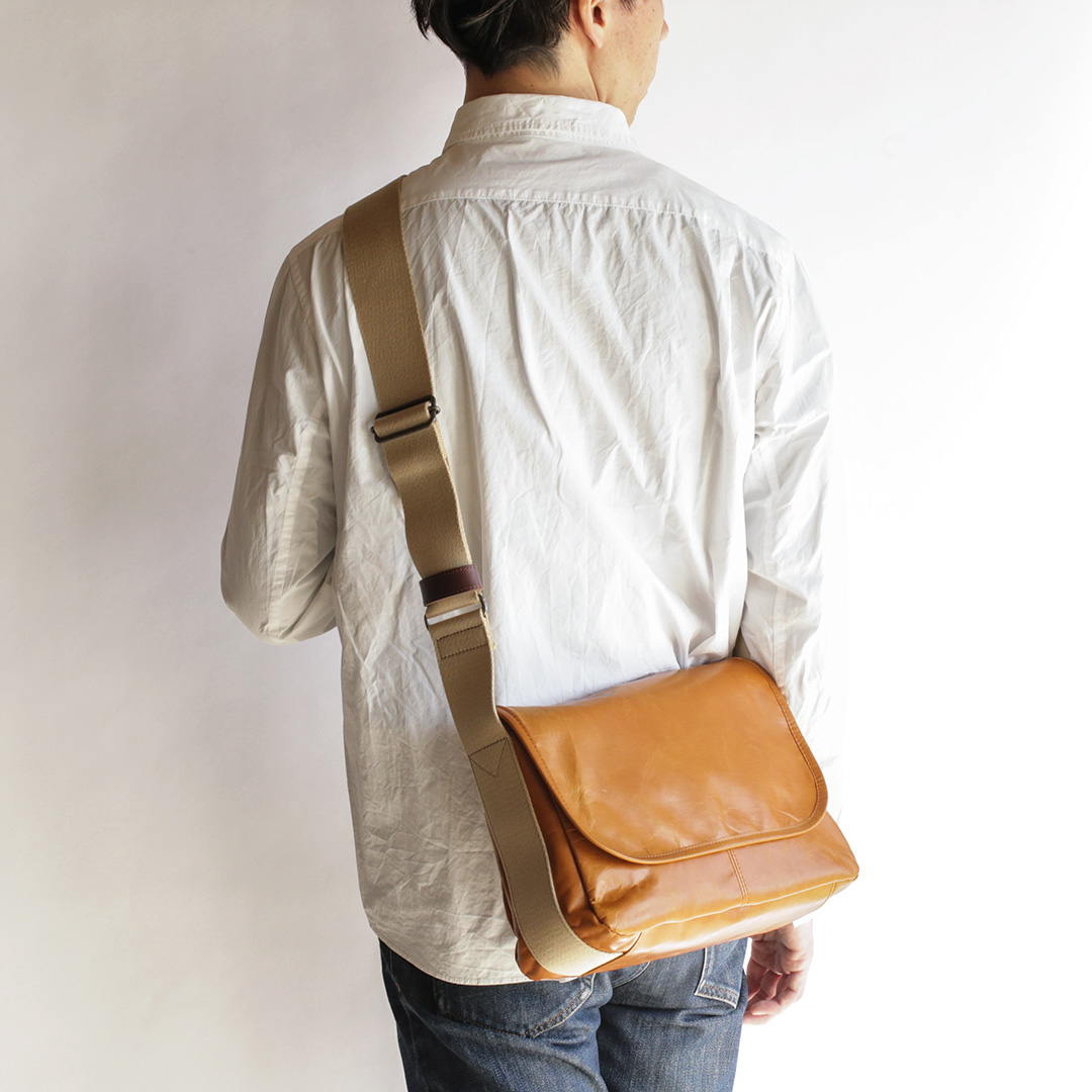 使うほどに味わい深くなる旨味があふれた馬革で仕立てたフラップタイプのレザーショルダーバッグ。側面に5cm幅の綾織りテープを大胆にあしらうことにより、ビンテージ&ワークな雰囲気に。ソフトな手触りの馬革の特徴を生かしながらも、鞄としての使い勝手の良さや身体へのフィット感を損なわないよう仕上げました。重量はわずか約480g!見た目の重厚感からは想像できない驚きの軽さです。