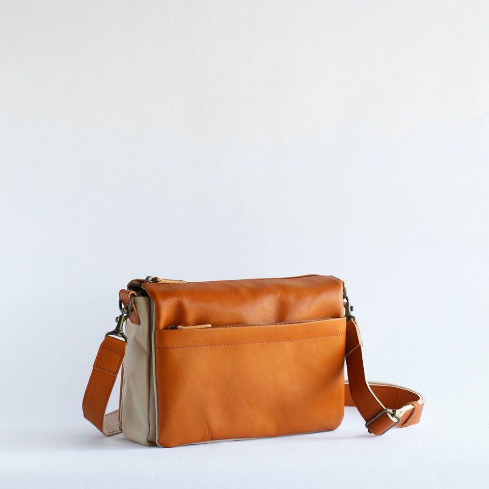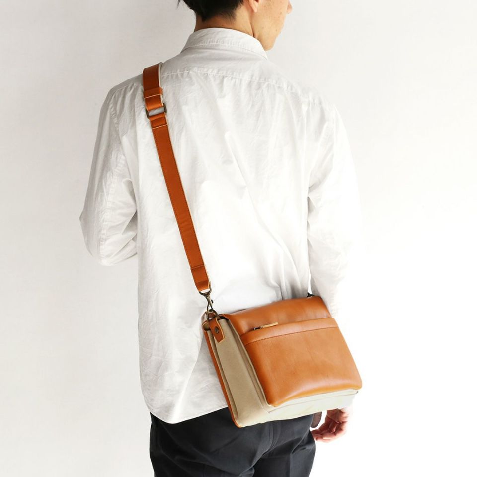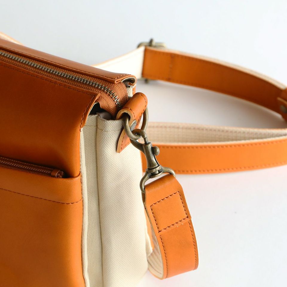 軽くて丈夫、牛革と帆布を組み合わせたスワローマチ仕立ての3層式ショルダーバッグです。スワローマチという特殊な双胴のマチ構造により収納部が3層に分かれており、収納量に応じてマチが拡張する仕組みです。ベーシックで飽きのこないデザインだからずっと使えます。