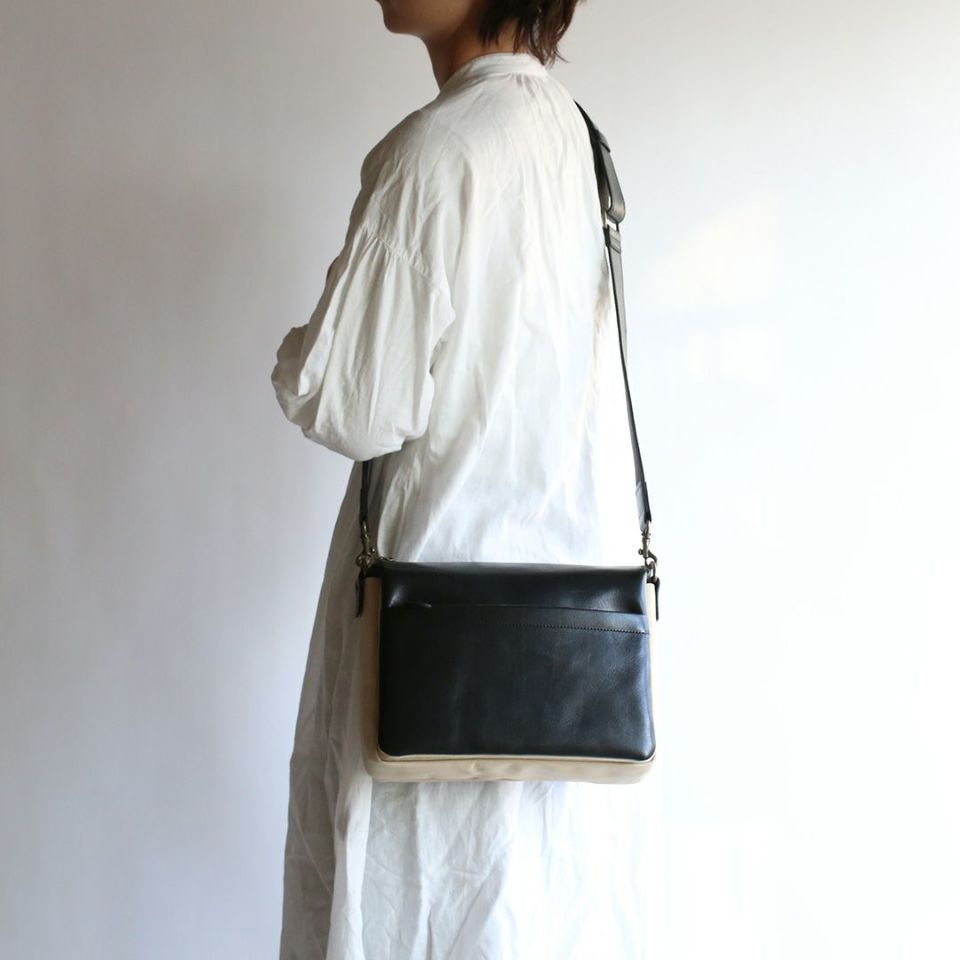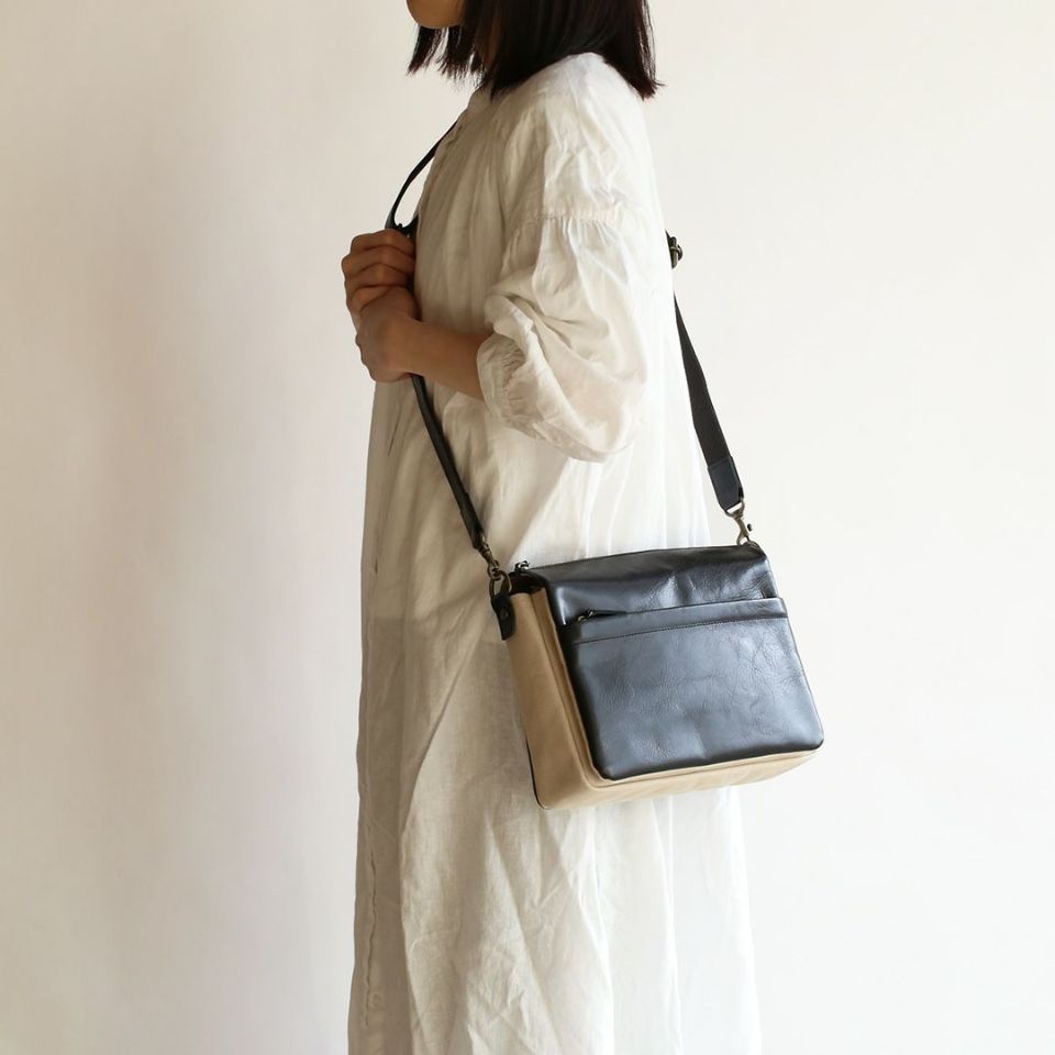 ファスナーのある面を便宜上、前胴と設定しておりますが、前と後ろ、それぞれに革の表情を楽しんでいただける”ダブルフェイス”のショルダーバッグです。お好みや状況に合わせて使い分けをお楽しみください。