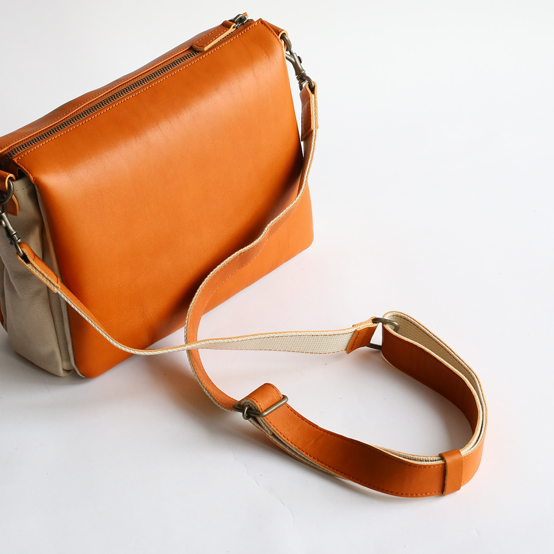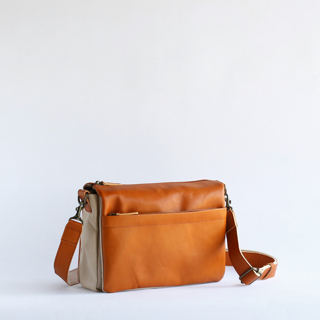 姫路でなめしたタンニンなめしの牛革に中厚手の8号帆布を組み合わせました。それぞれの素朴な質感は、使い込む時間とともに味わい深い表情に変化してまいります。バッグの前後に革、側面と底部には帆布を配することで、レザーの質感と表情をまといながらも、軽量化も実現しております。ですがショルダーベルトは革製にこだわりました。