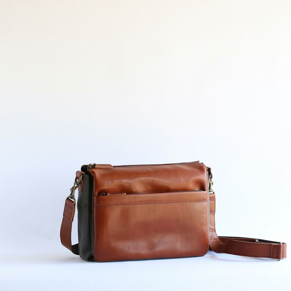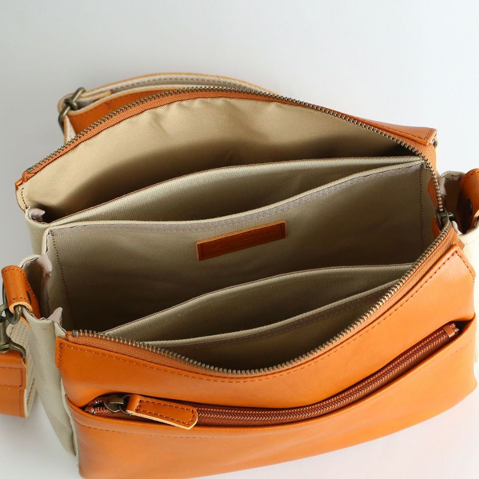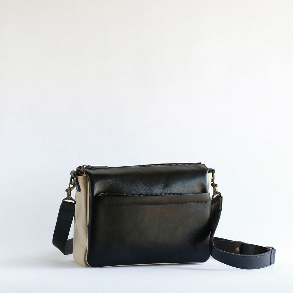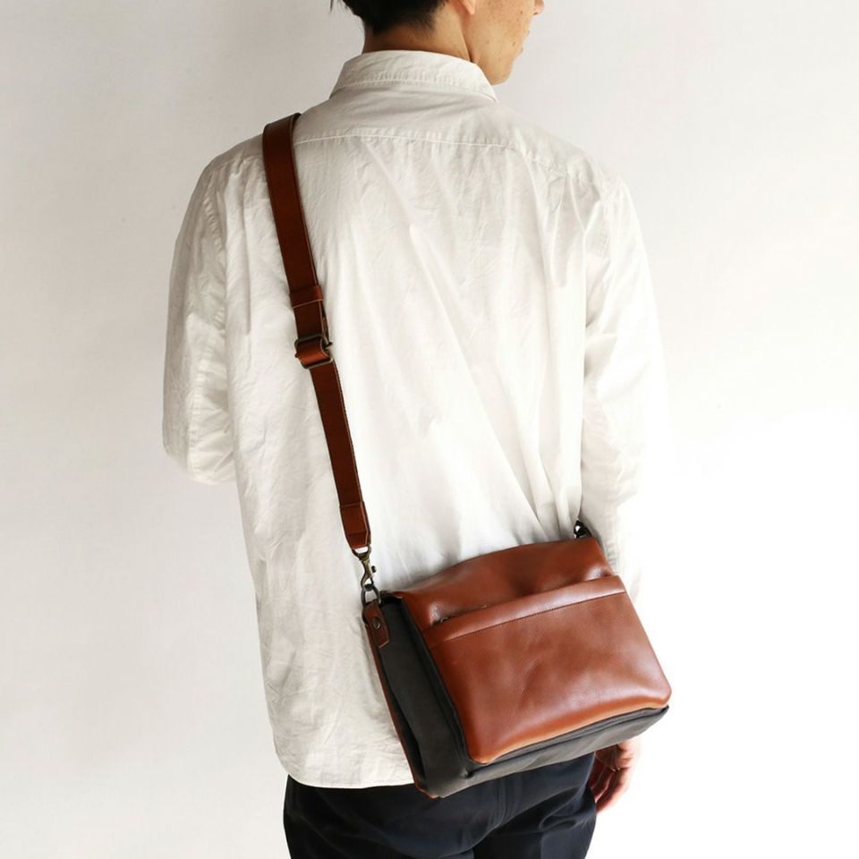 軽くて丈夫、牛革と帆布を組み合わせたスワローマチ仕立ての3層式ショルダーバッグです。スワローマチという特殊な双胴のマチ構造により収納部が3層に分かれており、収納量に応じてマチが拡張する仕組みです。ベーシックで飽きのこないデザインだからずっと使えます。
