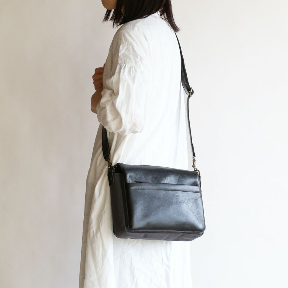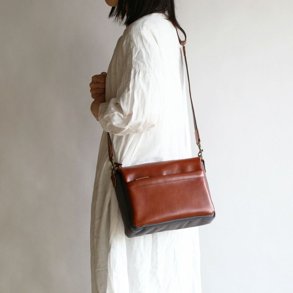 ファスナーのある面を便宜上、前胴と設定しておりますが、前と後ろ、それぞれに革の表情を楽しんでいただける”ダブルフェイス”のショルダーバッグです。お好みや状況に合わせて使い分けをお楽しみください。