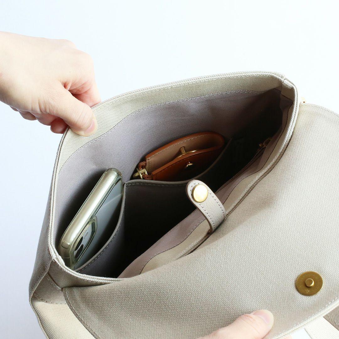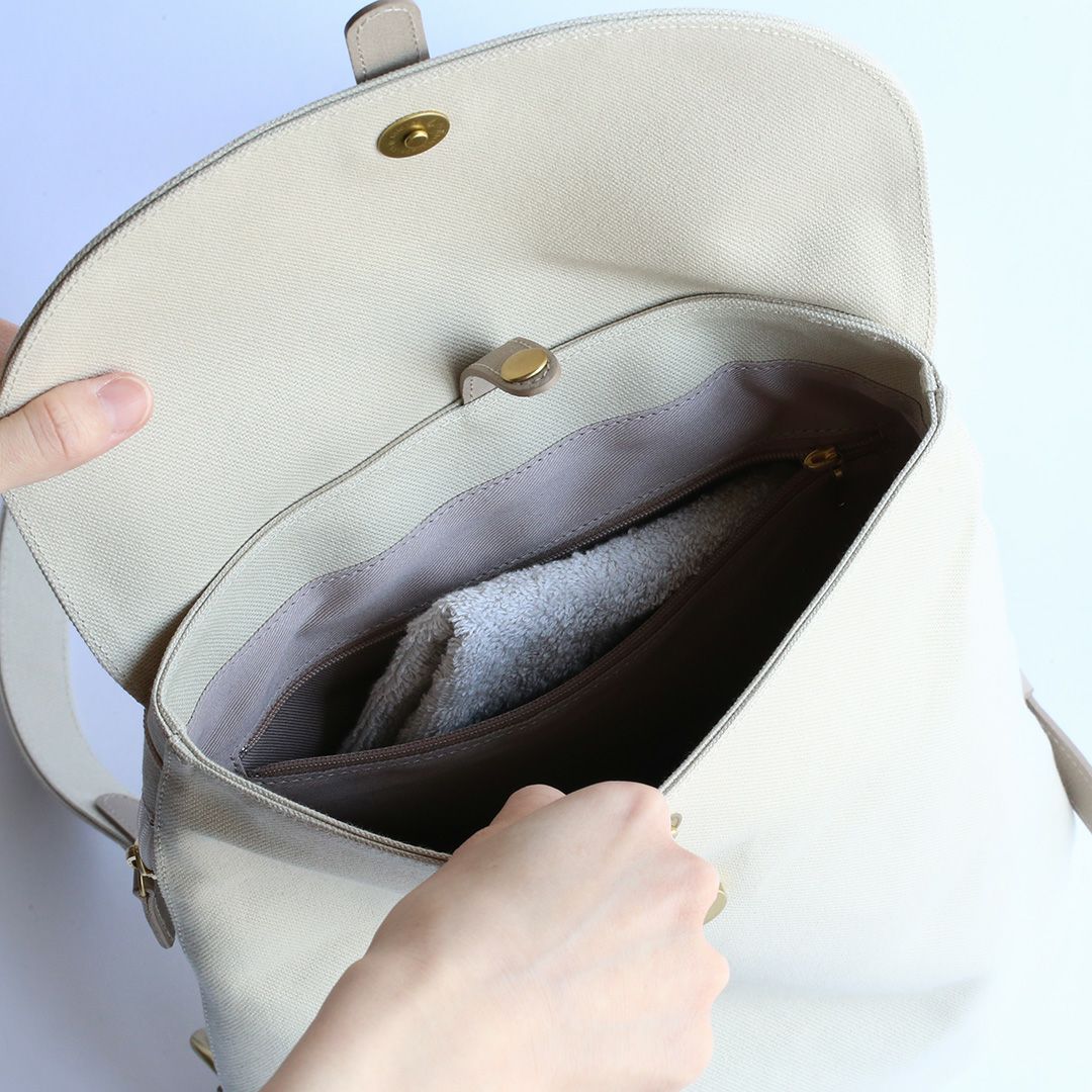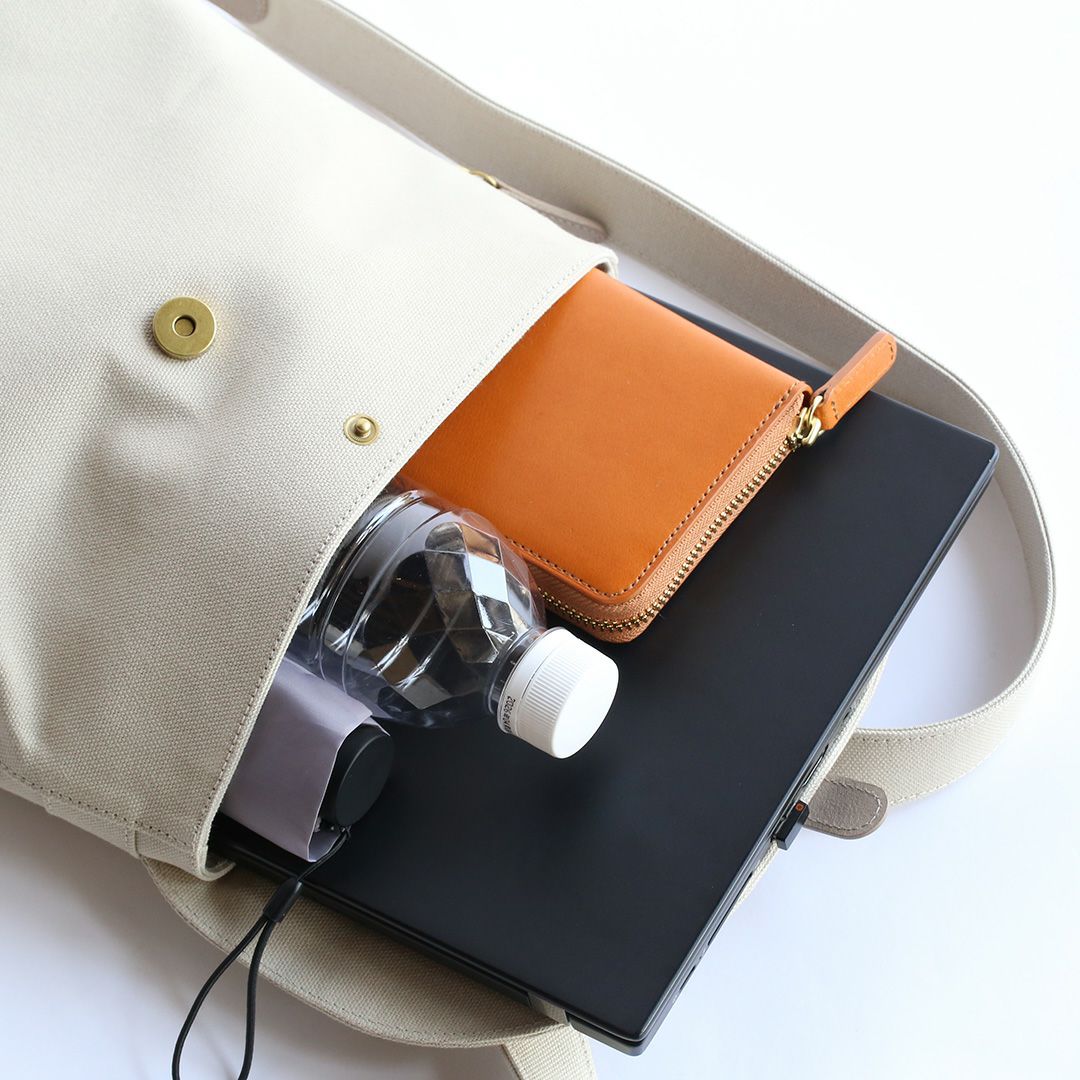 メイン収納にはA4サイズの書類や13インチのノートPCも収まり、スリムな見た目ですが、お出かけのパートナーとしてもお仕事カバンとしても使える便利なサイズ感です。