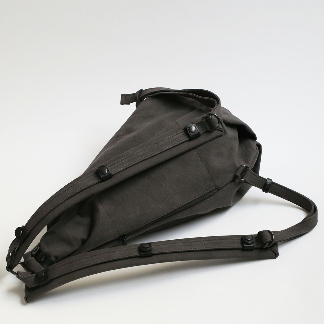 いくら軽いナップサックでも、長時間背負っていると肩に負担がかからないか…そんなご心配を解決してくれる、心強いアイテムです。程よい厚みとしなやかさをもつクッションを備長炭染め帆布で包み、革パーツを組み合わせたデザインは、ナップサックにも自然に馴染みます。