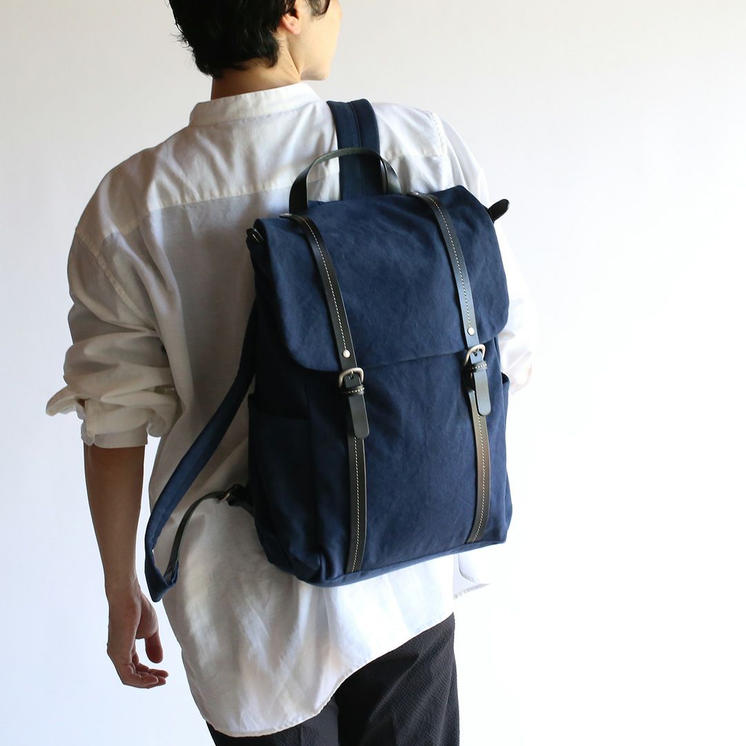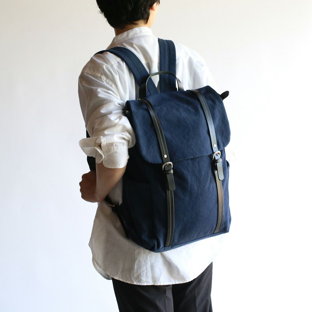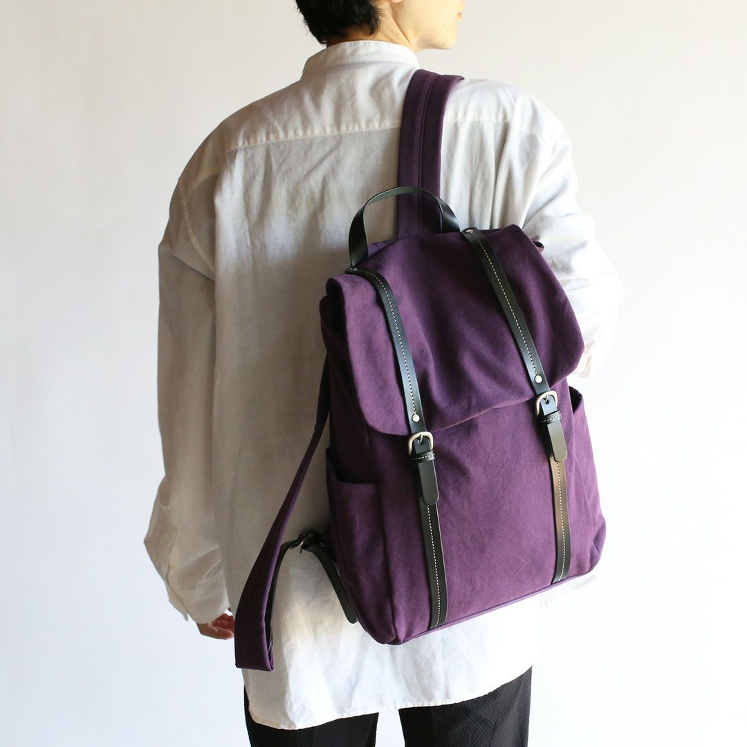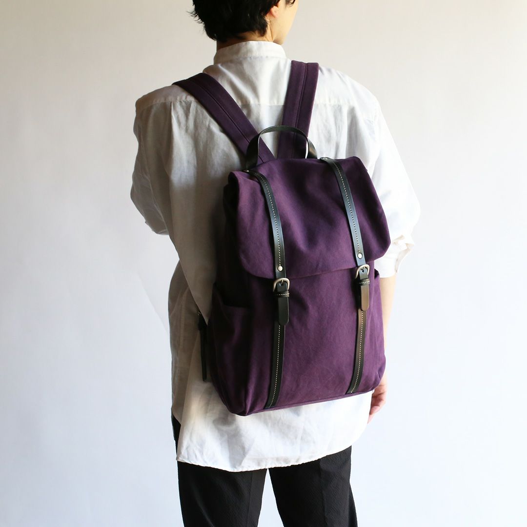 バイオウォッシュ加工を施し、ふんわりやわらかな肌あたりに仕上げた8号帆布で、フラップタイプのおおきなリュックをつくりました。15.6インチのノートパソコンも収まる見ためどおりの大容量で、たくさんの荷物もひとつにまとめて持ち運べます。お色はネイビー、ナイトグレー、パープルの全3色。帆布の風合いに合わせたヌメ革が良いアクセントに。遠くからでも目を惹く存在感で、どのお色もかっこよくお持ちいただけます。