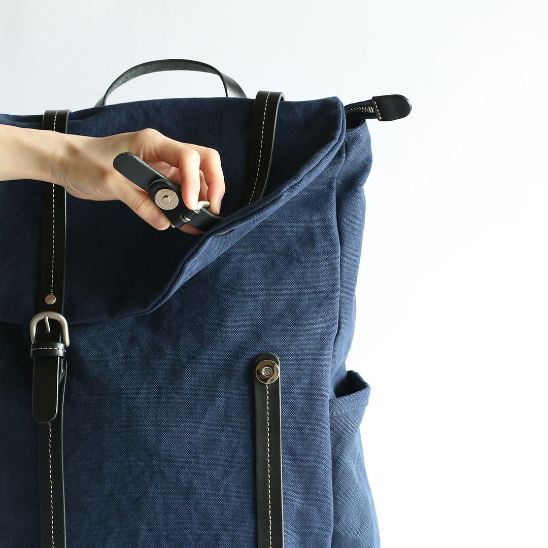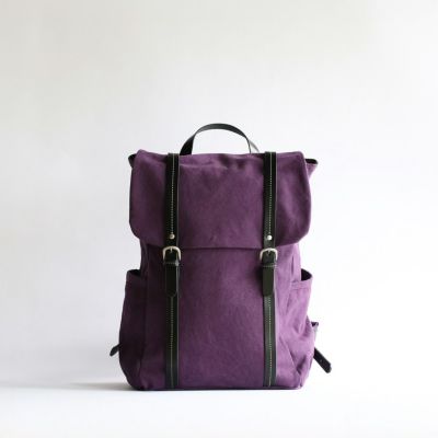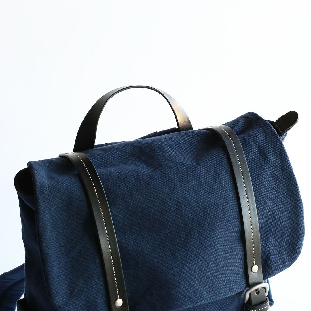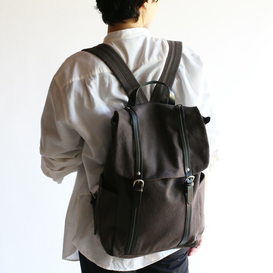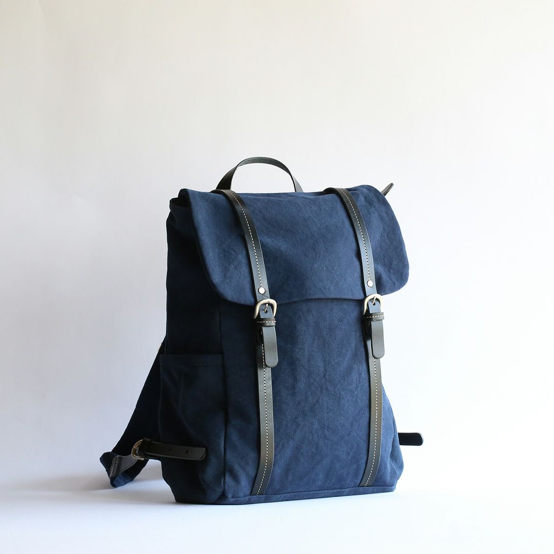 バイオウォッシュ加工を施し、ふんわりやわらかな肌あたりに仕上げた8号帆布で、フラップタイプのおおきなリュックをつくりました。15.6インチのノートパソコンも収まる見ためどおりの大容量で、たくさんの荷物もひとつにまとめて持ち運べます。お色はネイビー、ナイトグレー、パープルの全3色。帆布の風合いに合わせたヌメ革が良いアクセントに。遠くからでも目を惹く存在感で、どのお色もかっこよくお持ちいただけます。