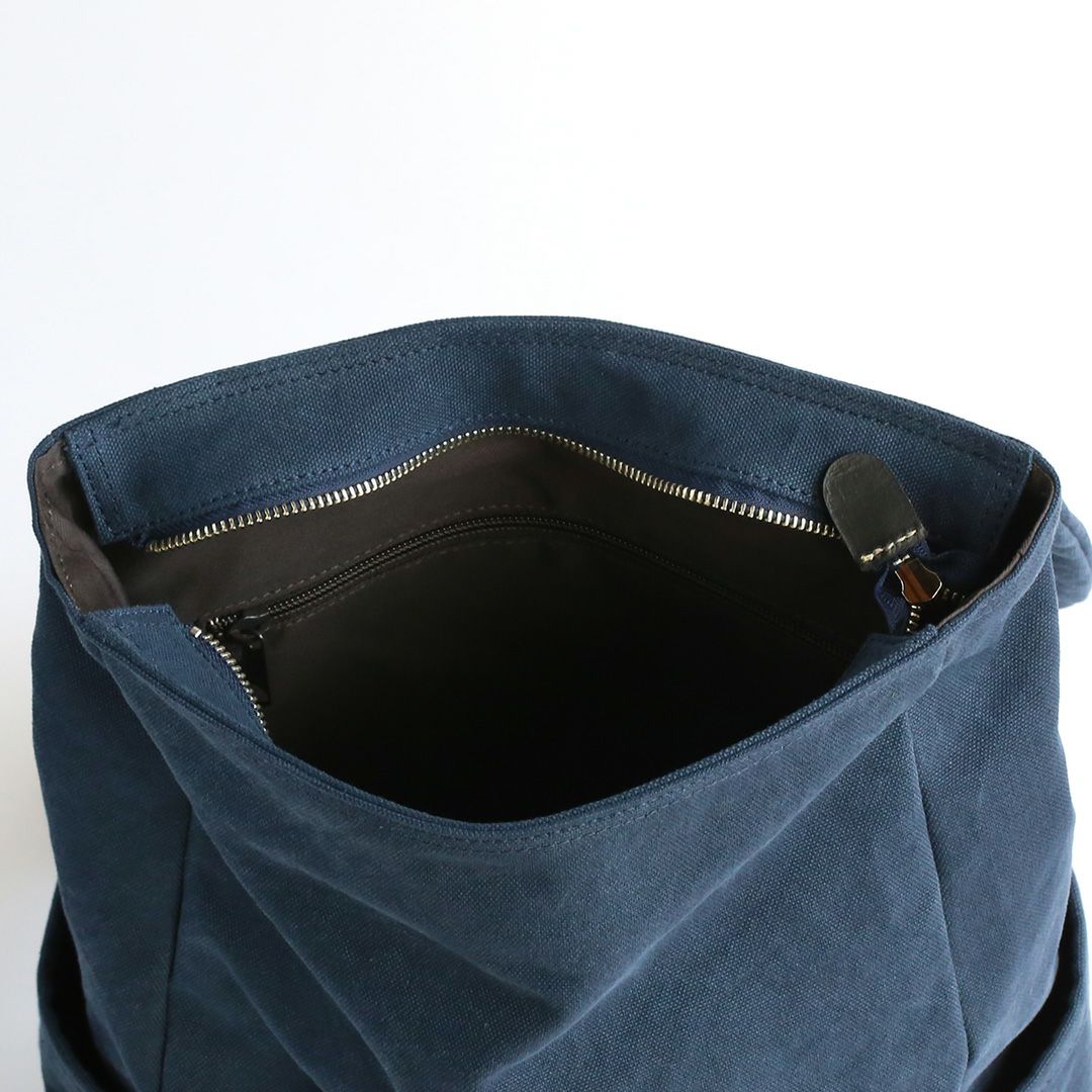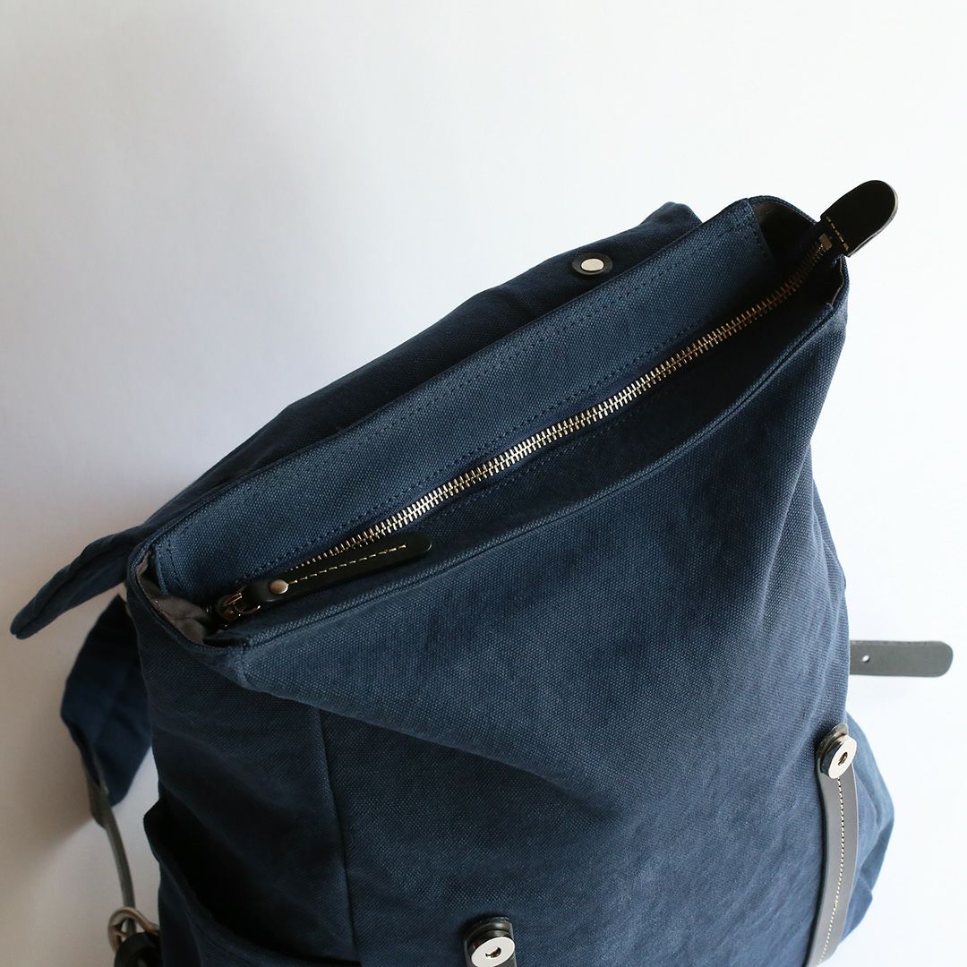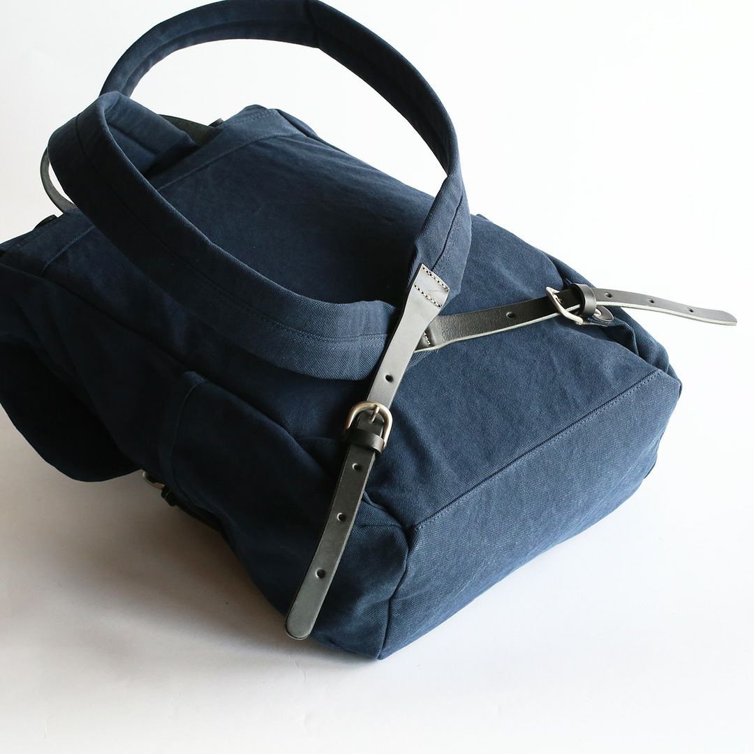 8号帆布にバイオウォッシュ加工を施し、ふんわりやわらかな肌あたりのおおきなリュックをつくりました。見ためどおりの大容量で、たくさんの荷物もひとつにまとめて持ち運べます。お色はネイビー、ナイトグレー、パープルの全3色。遠くからでも目を惹く存在感で、どのお色もかっこよくお持ちいただけます。