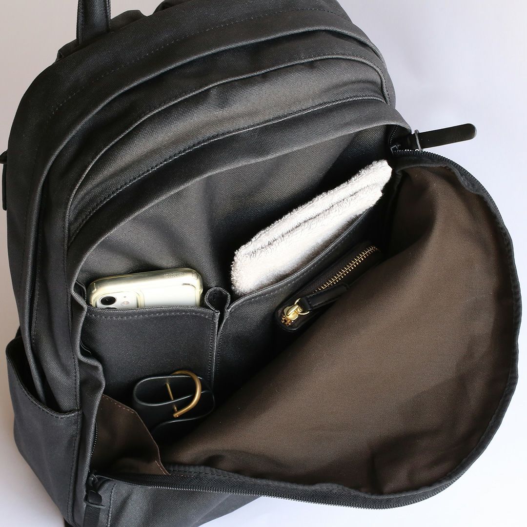 フロントポケットは開閉口がL字型になっており、4つのオーガナイズポケットが備わります。広々したリビングにはA4ファイルや長財布などが収納可能。もはやちょっとしたバッグなみの収納力を誇るポケットです。