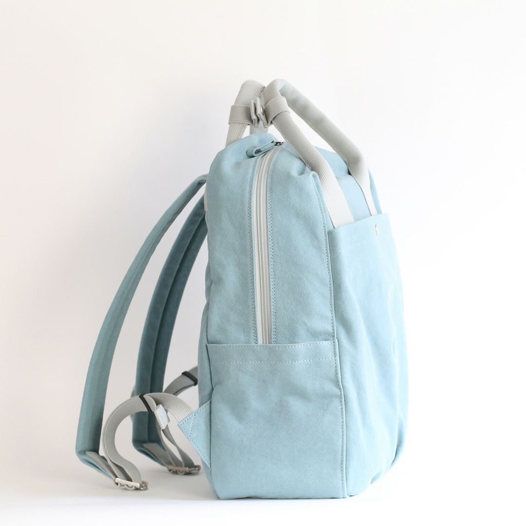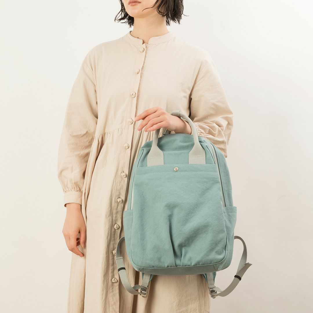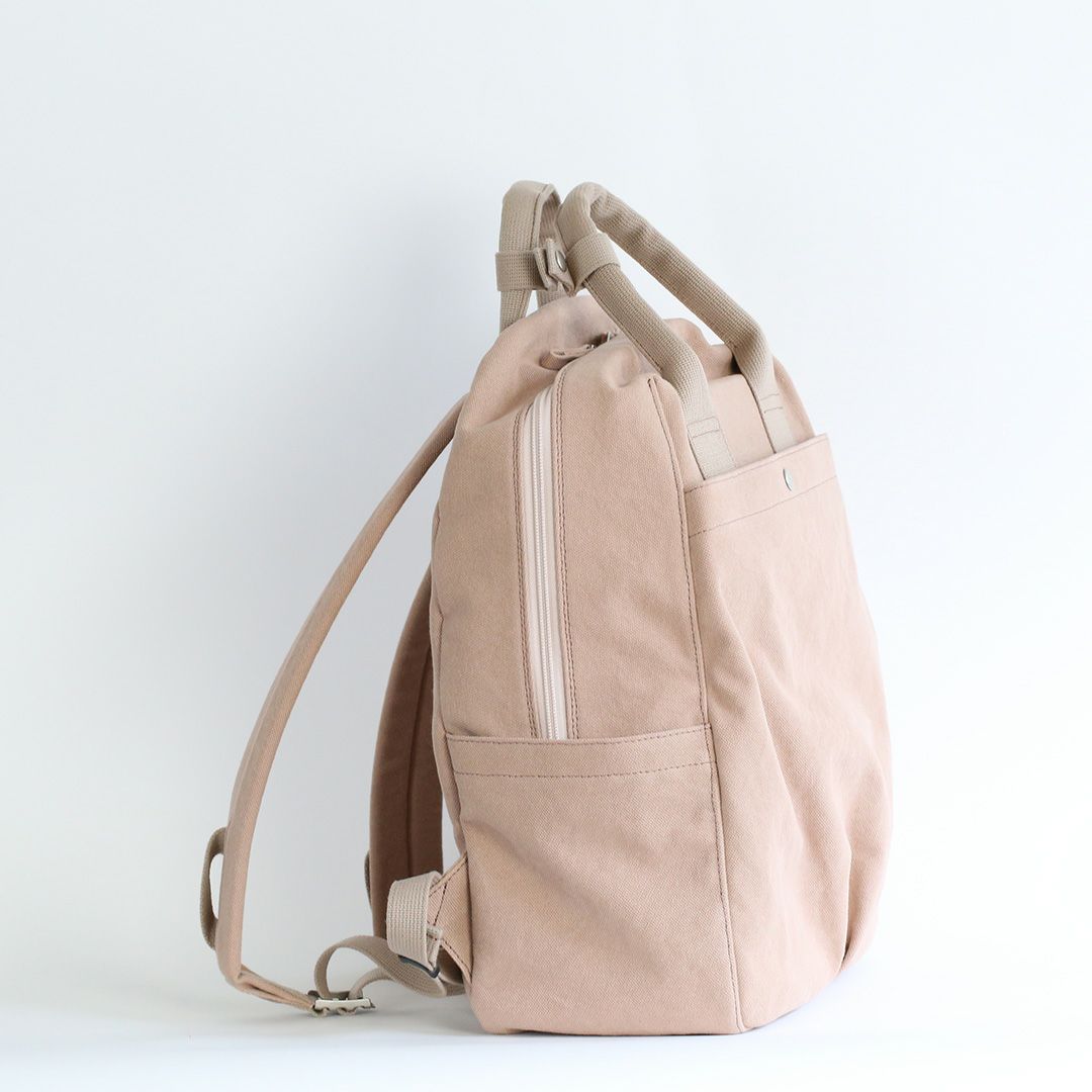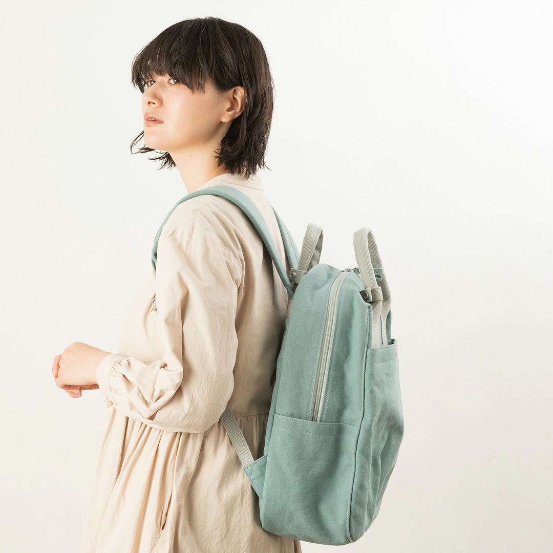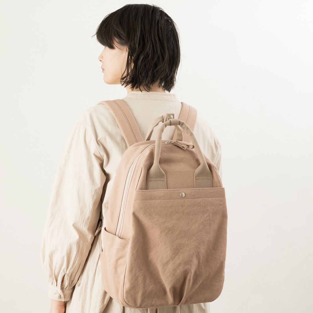 国産の8号帆布でつくった、持ち手が自立するA4サイズ対応のリュックです。背負っても持っても愛らしい、ふんわり柔らかい雰囲気のデザインは、リュック本体からマチへ回り込むように形取る設計により生み出されています。見た目はふんわりしてますが、持ち手やベルトのつくりのこだわりなど、快適な背負い心地のための工夫はしっかり詰め込んでいます。