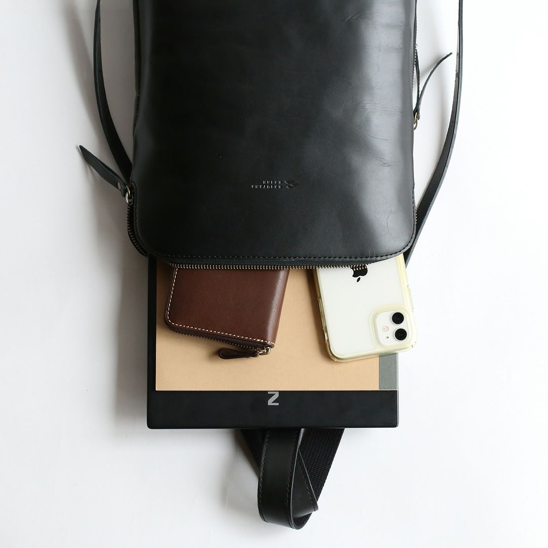 全体的なスリムなイメージとはうらはらに、楕円形の底マチがあるおかげで13インチのノートPCやノートが入ります。 スタッフはセミナーや勉強会にこのリュック1つで快適に出張をこなします。とても重宝しています。 ビジカジやカジュアルな格好で出向く出張に持っていくバッグとして、カジュアルすぎずちょうど良く、 また、A4サイズも収納できるきれいめのレザーリュックです。現地でもらった資料なども入れて持って帰れます。