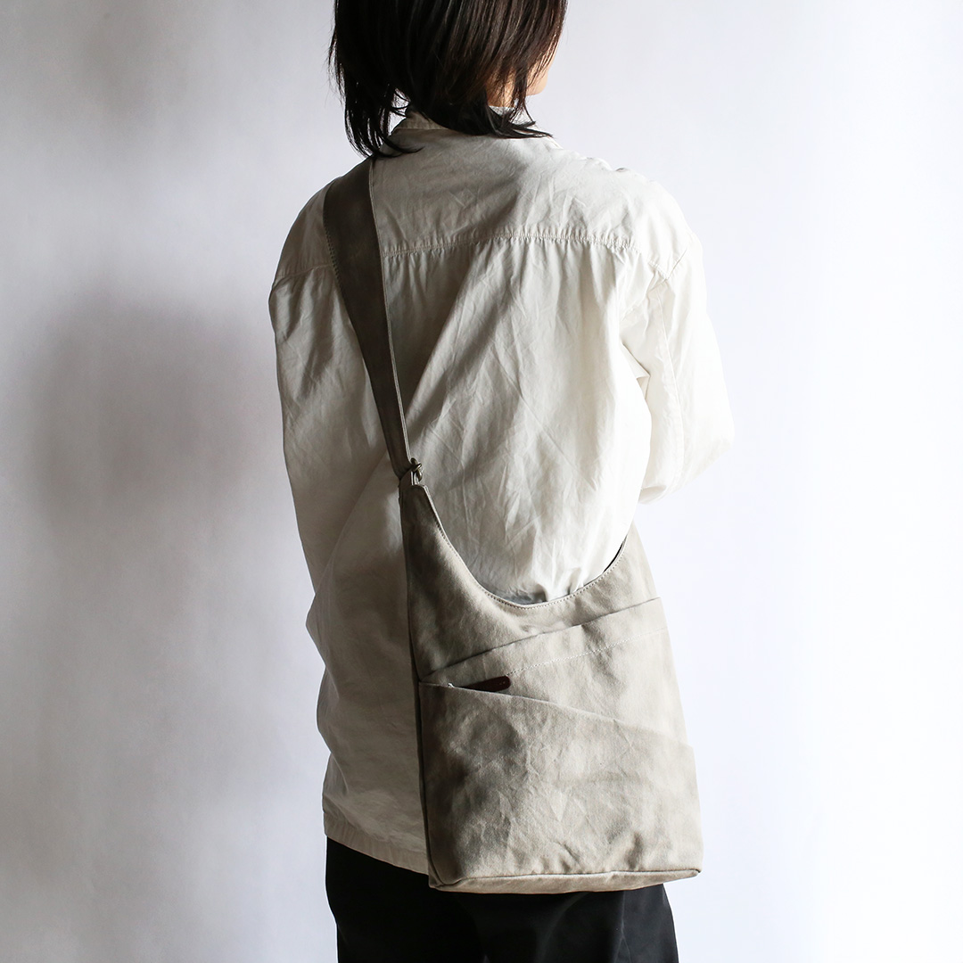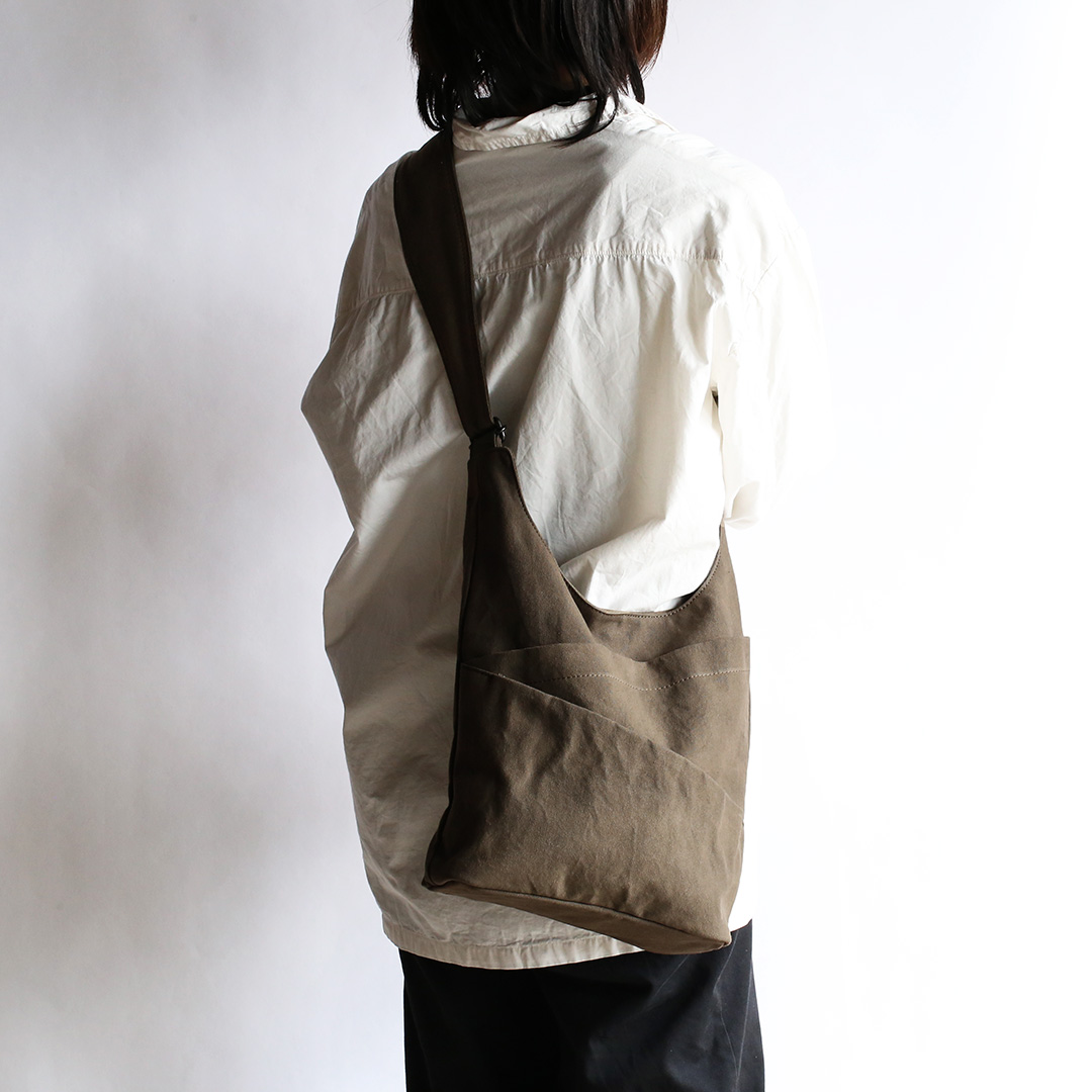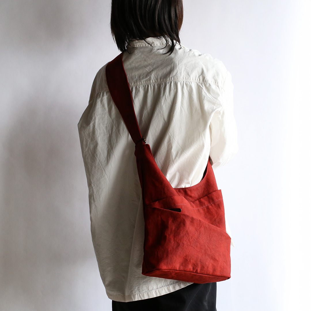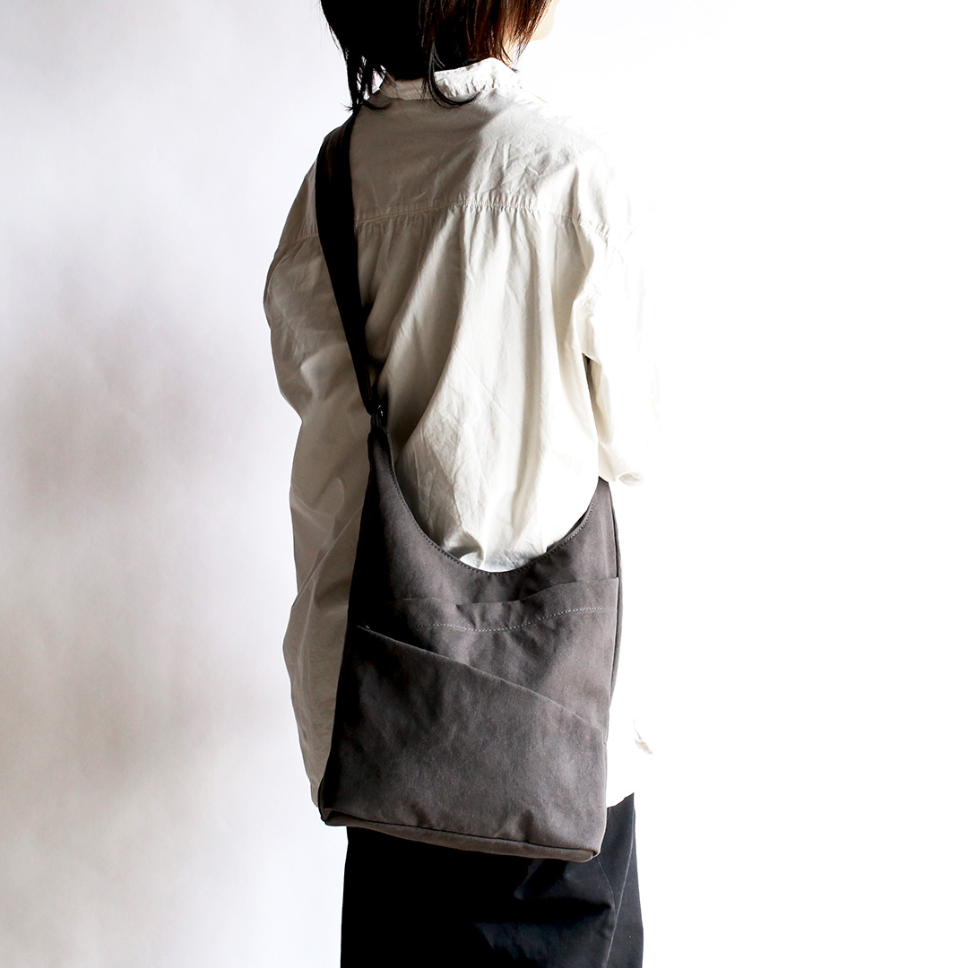 まるでタケノコのようにポケットを斜めにつけることで、荷物を収納しやすく、取り出しやすいように設計しています。 備長炭染めの味わい深い帆布の質感と、タケノコのようなユニークなデザインを組み合わせることで、機能的なだけでなく、使うたびに特別感を味わえるショルダーバッグに仕上がりました。