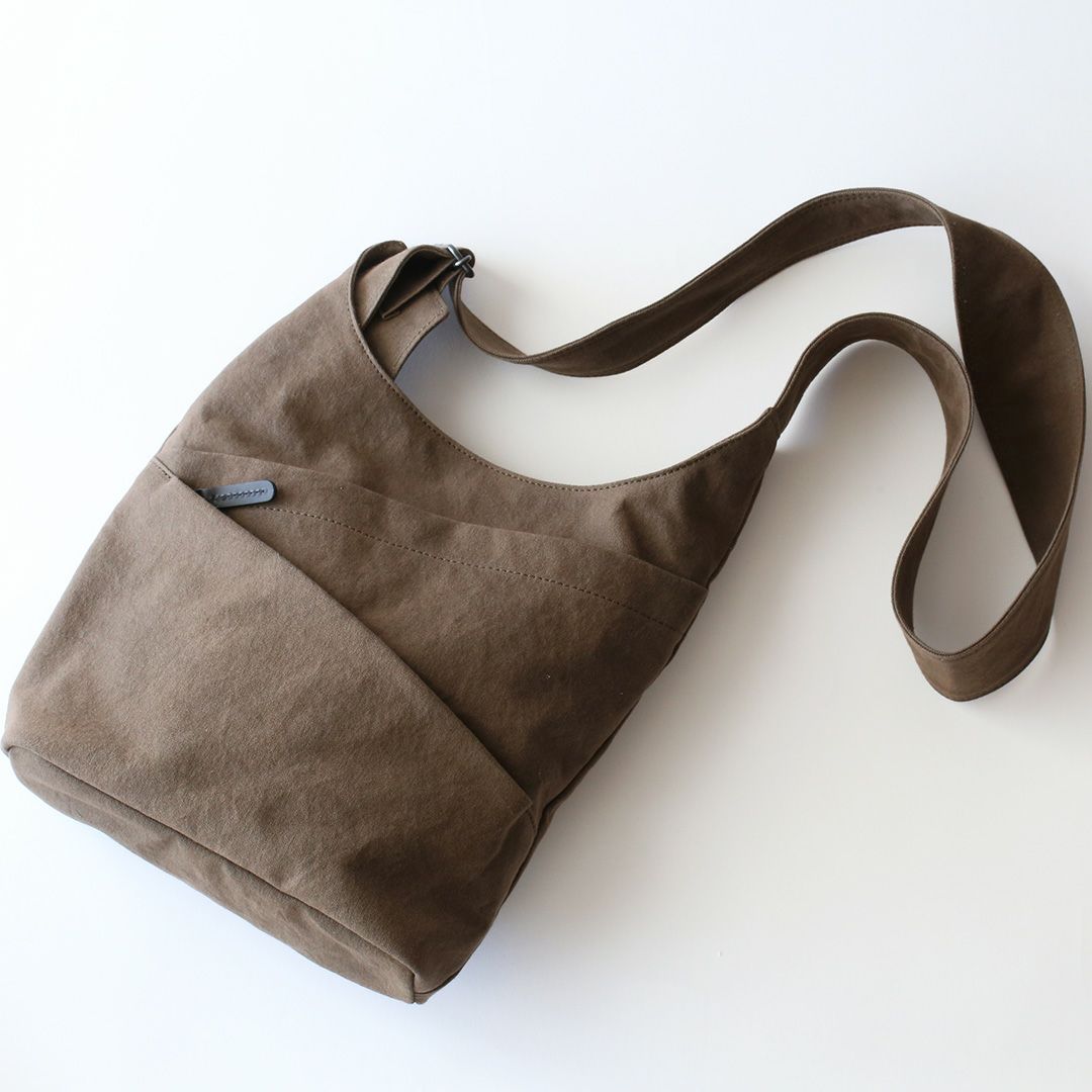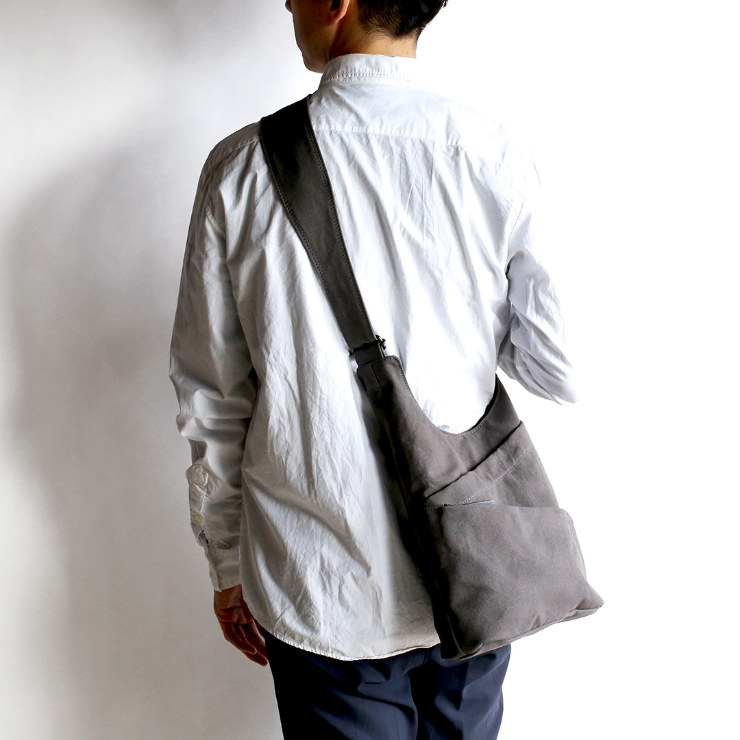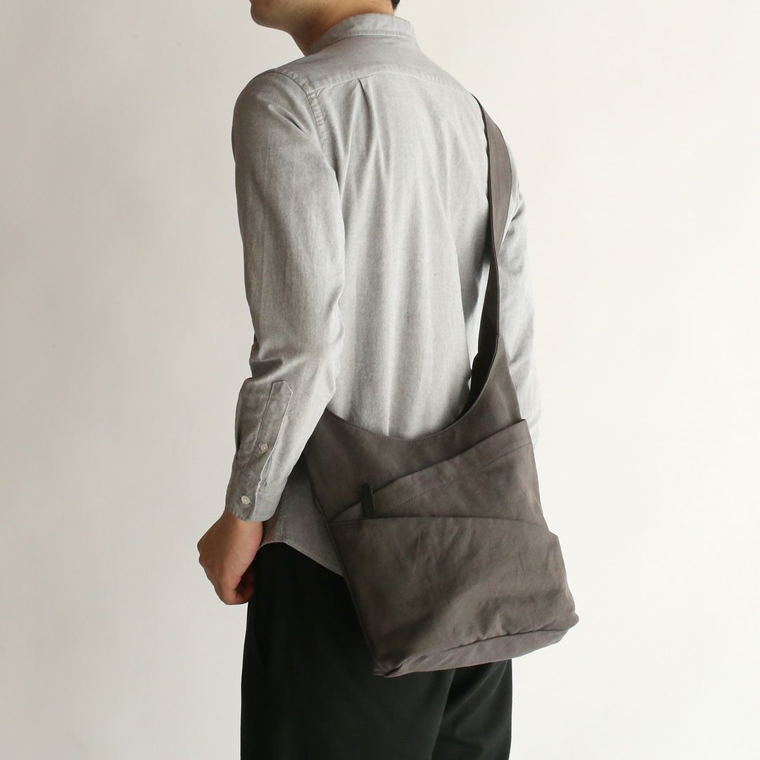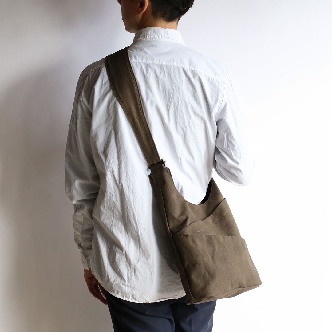 まるでタケノコのようにポケットを斜めにつけることで、荷物を収納しやすく、取り出しやすいように設計しています。 備長炭染めの味わい深い帆布の質感と、タケノコのようなユニークなデザインを組み合わせることで、機能的なだけでなく、使うたびに特別感を味わえるショルダーバッグに仕上がりました。
