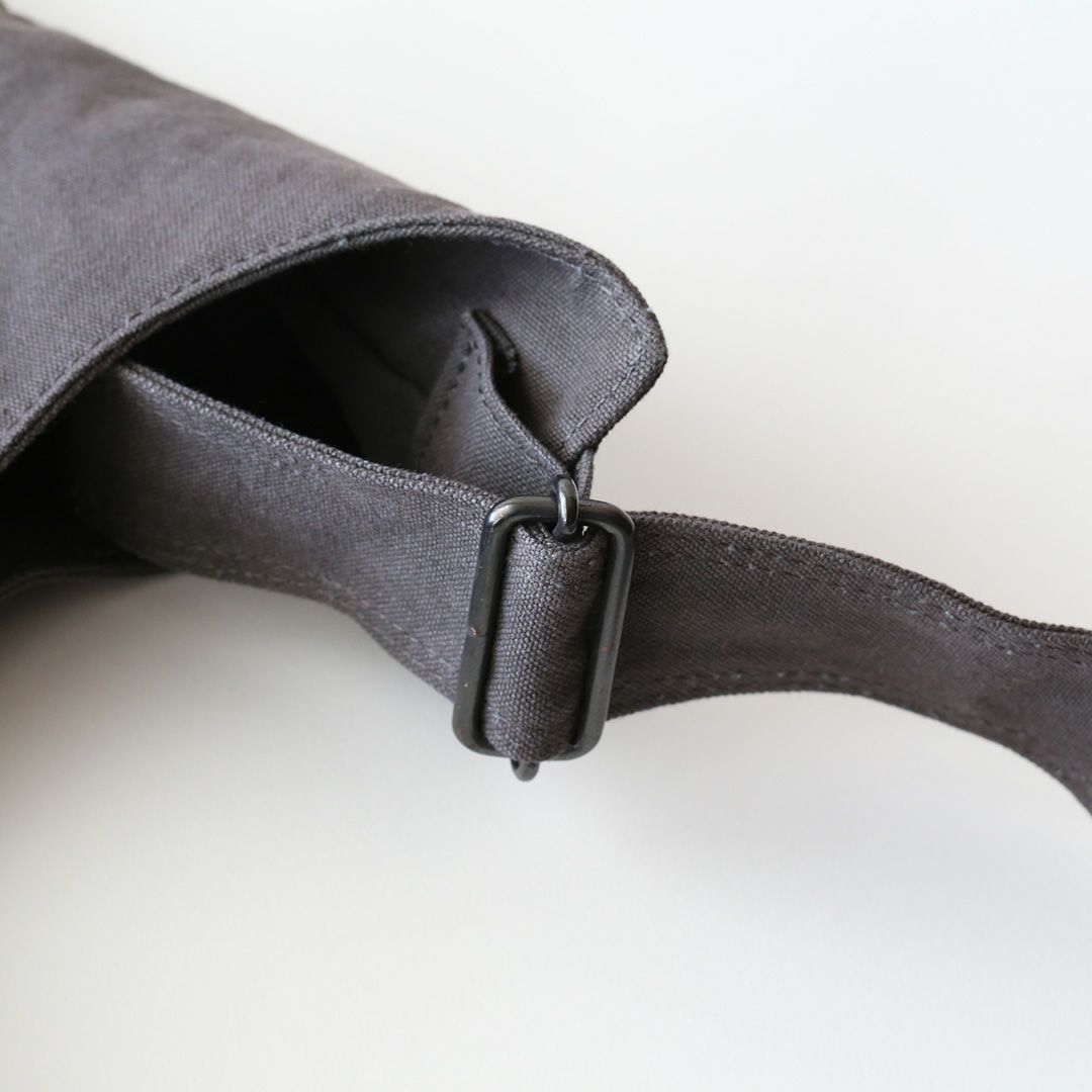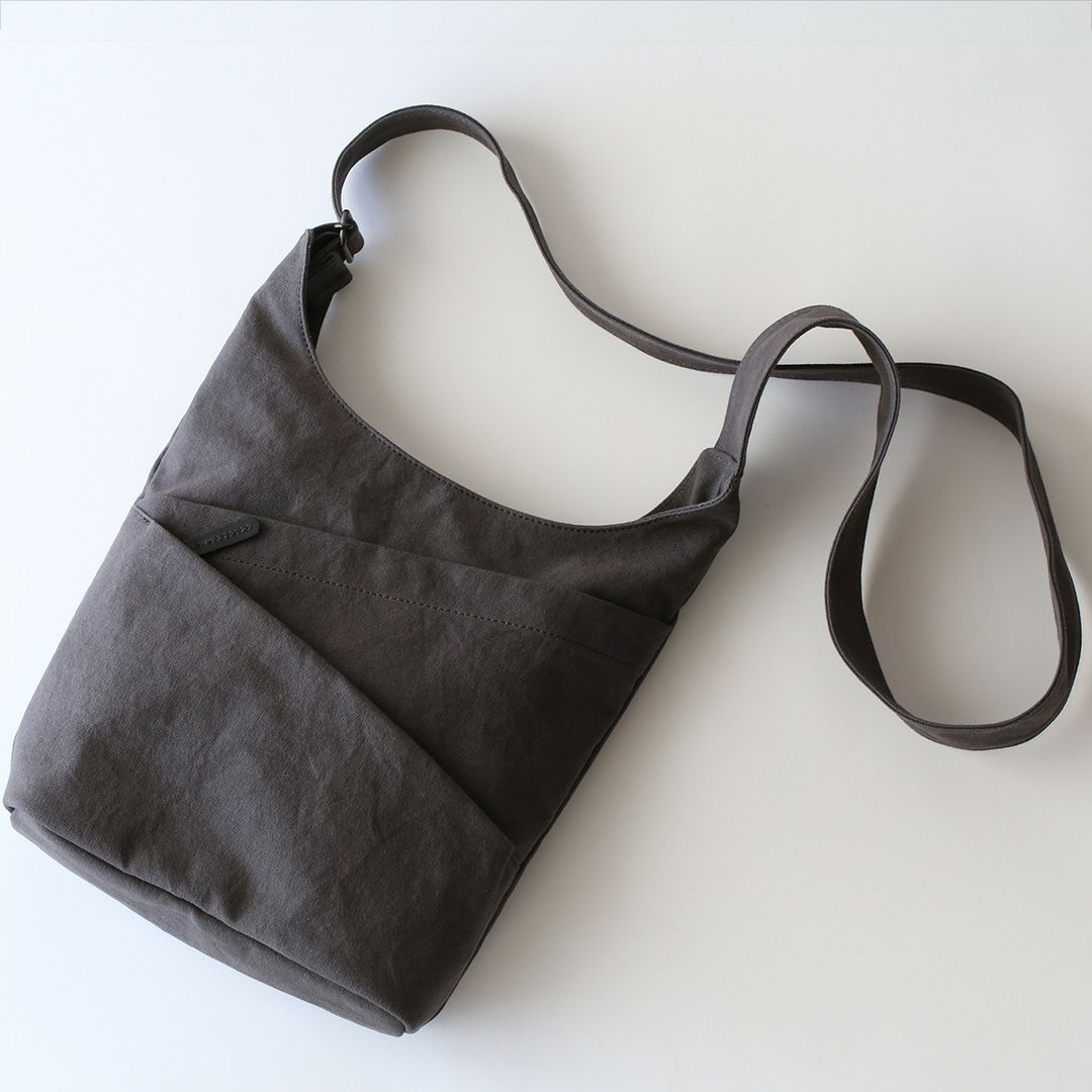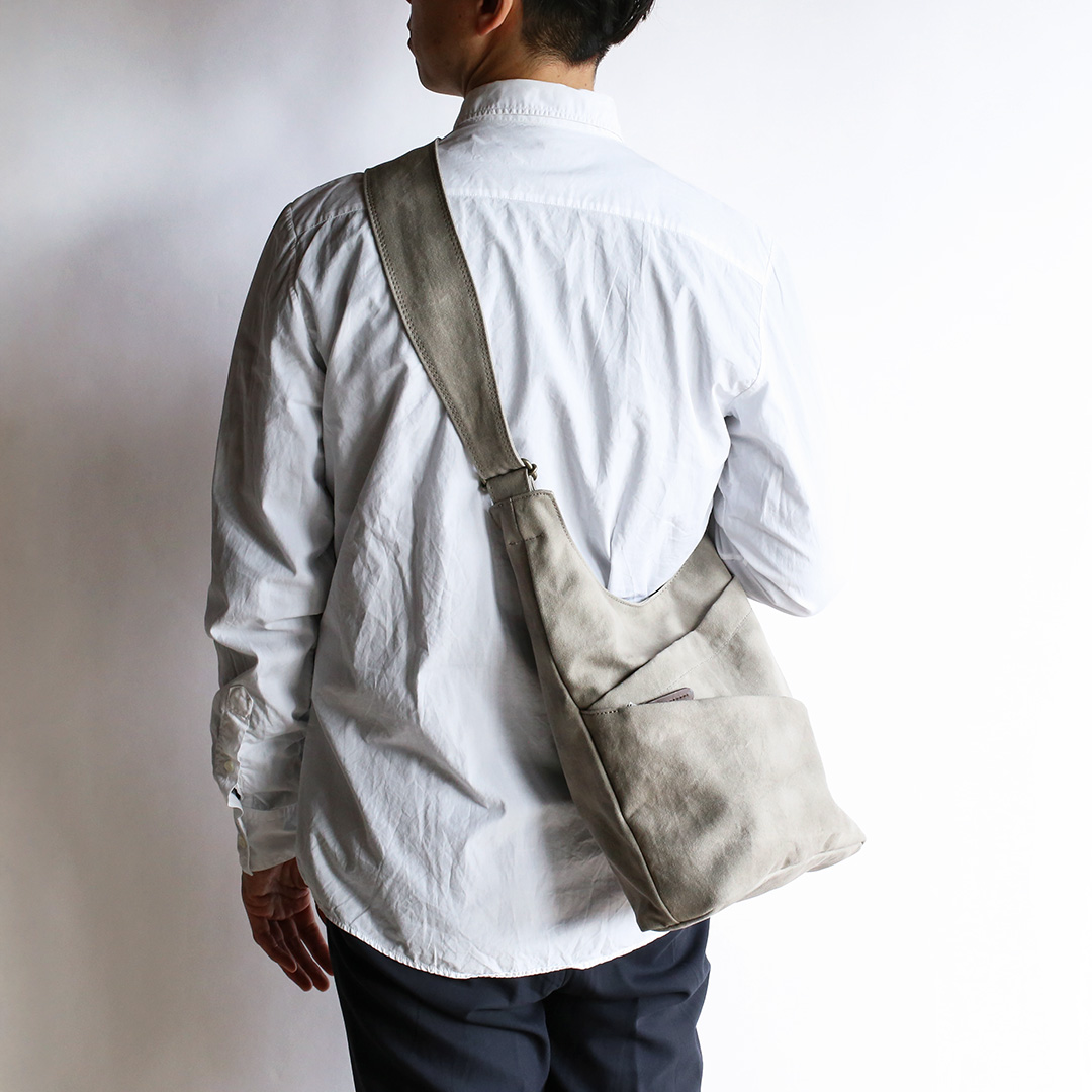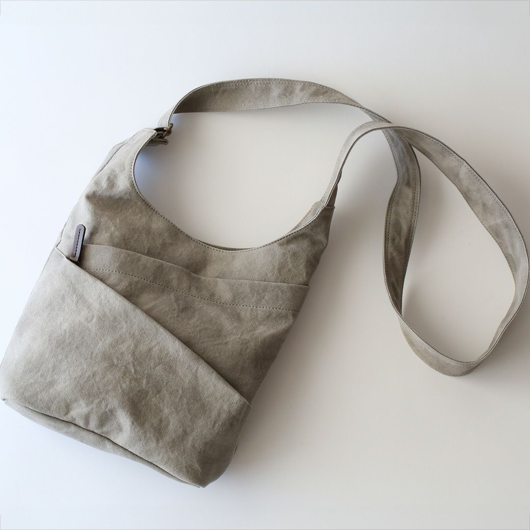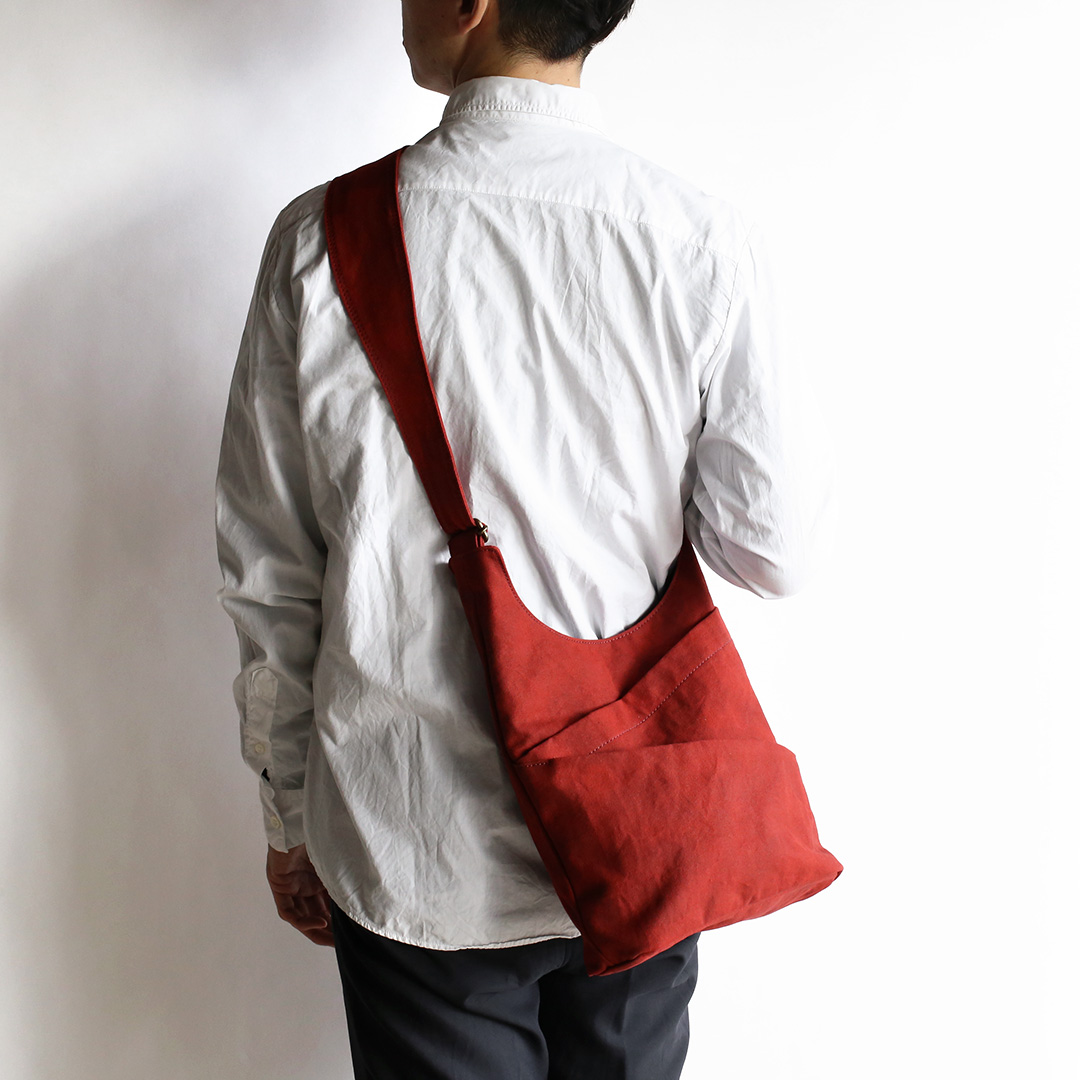 まるでタケノコのようにポケットを斜めにつけることで、荷物を収納しやすく、取り出しやすいように設計しています。 備長炭染めの味わい深い帆布の質感と、タケノコのようなユニークなデザインを組み合わせることで、機能的なだけでなく、使うたびに特別感を味わえるショルダーバッグに仕上がりました。