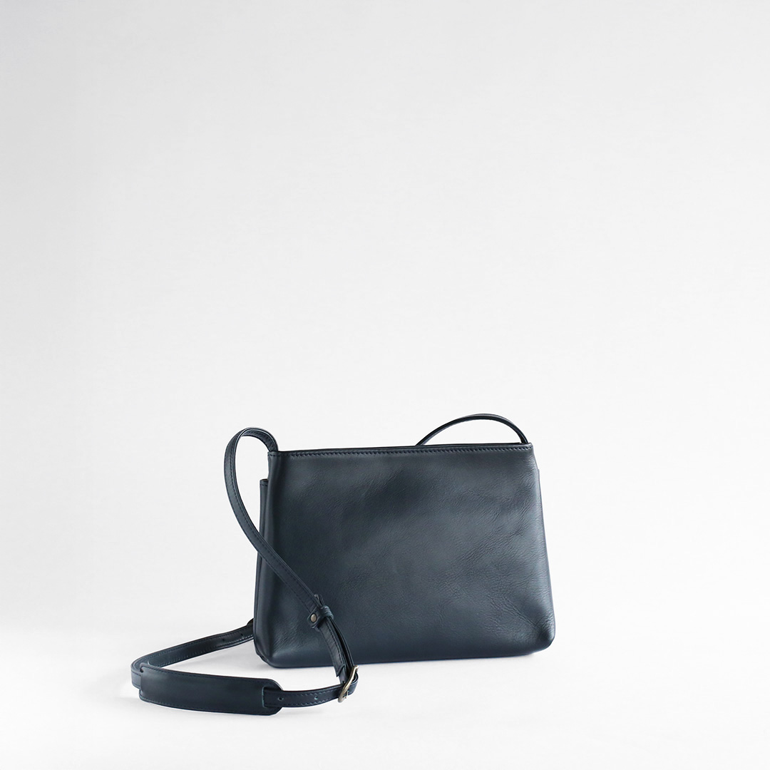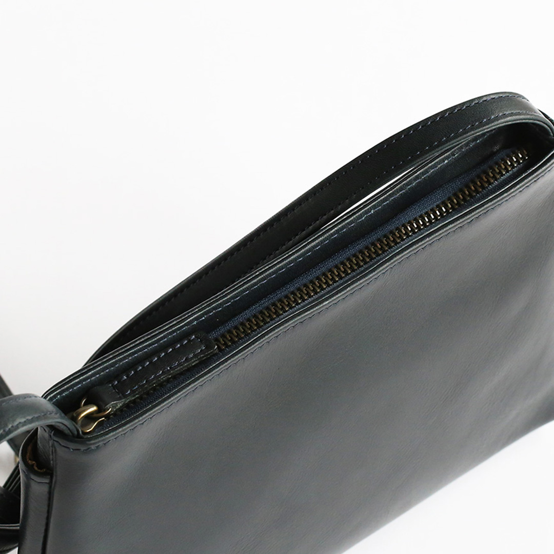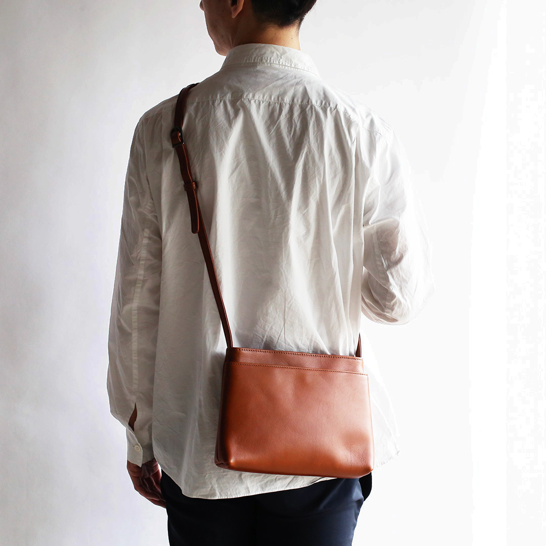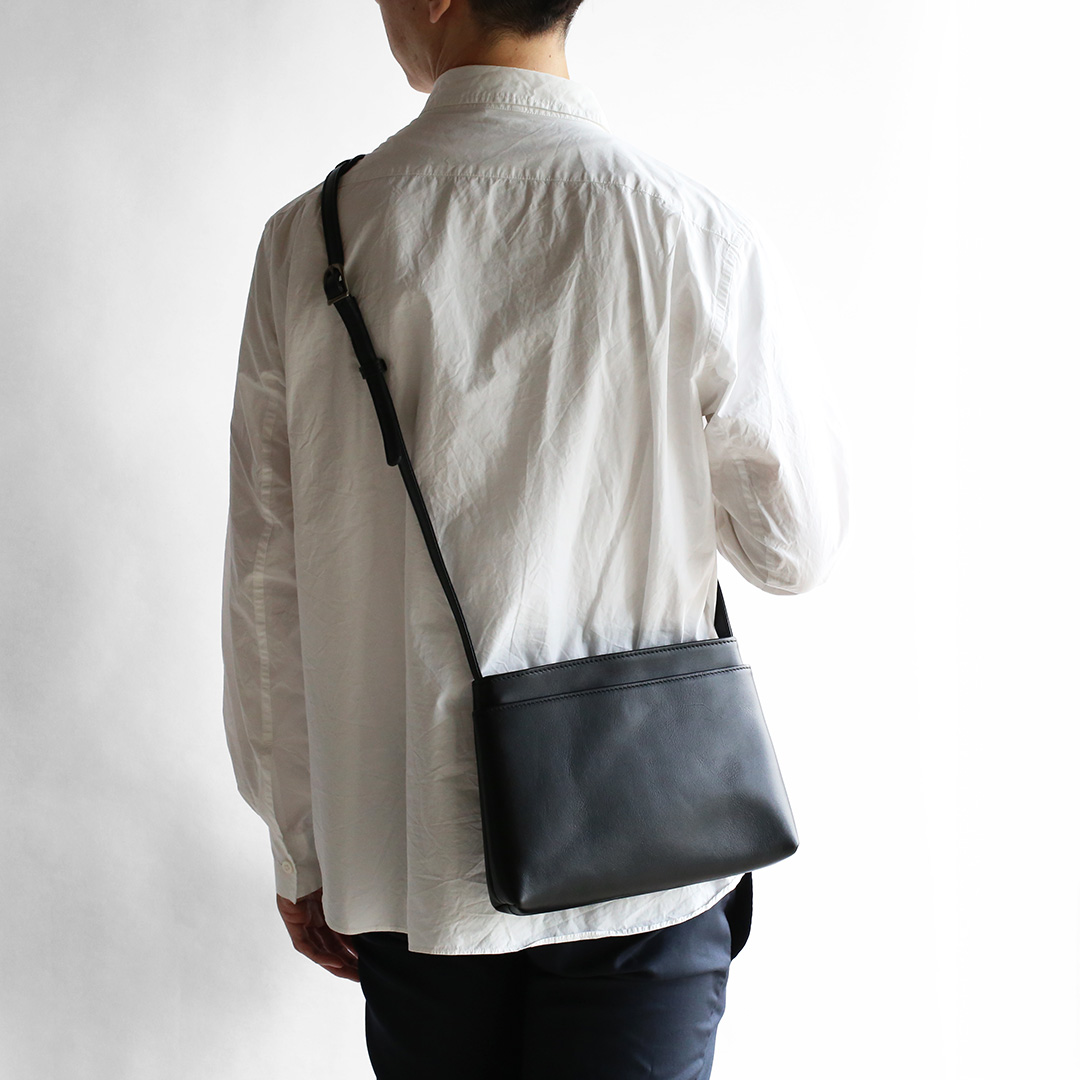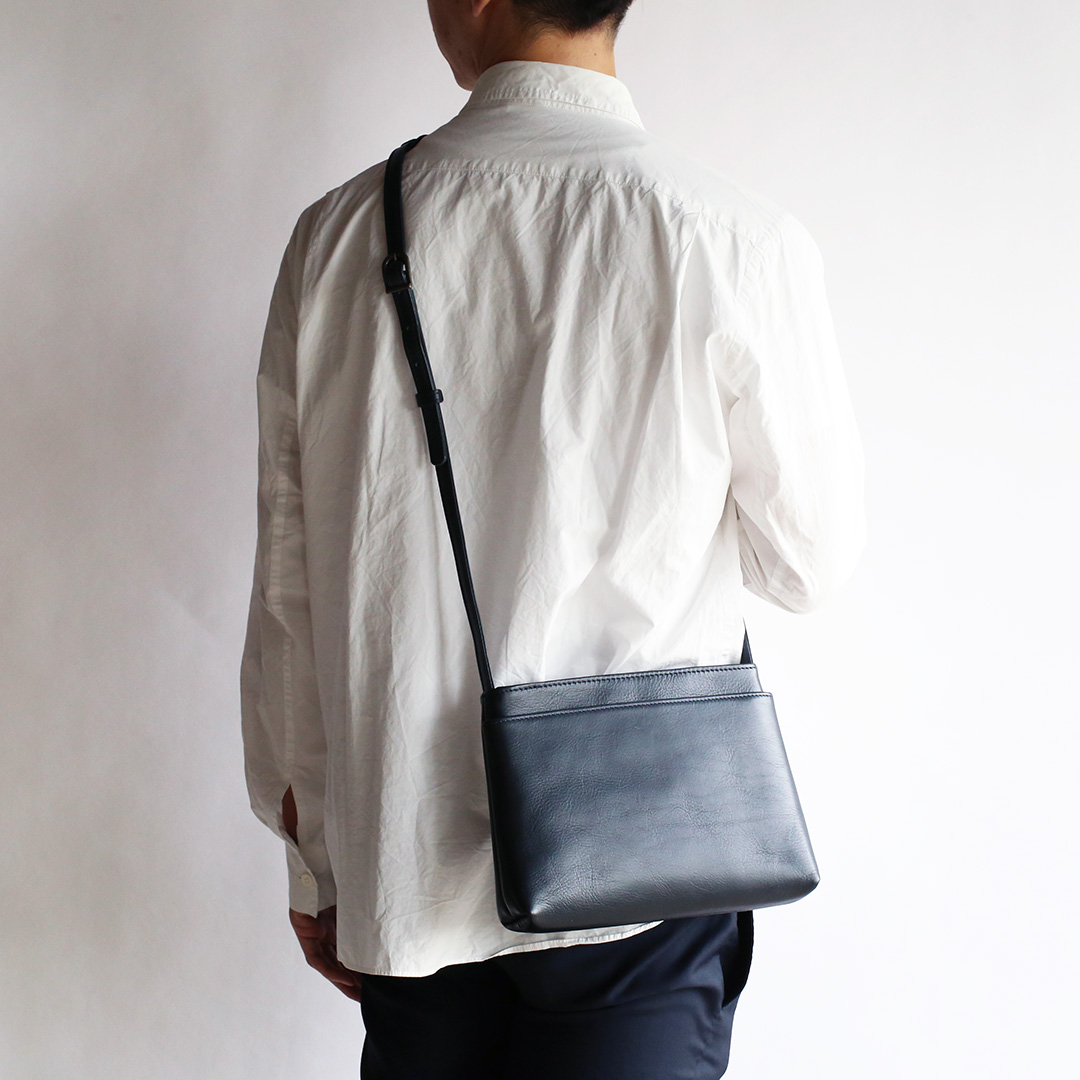 色移りや水濡れに強い特性を備えた牛革で製作したレザーサコッシュです。軽量で身体にフィットするスリムなデザインなので、気軽にいつでもどこでも持ち運んでいただけます。ブラック、ネイビー、ブラウン、キャメルの4色展開です。