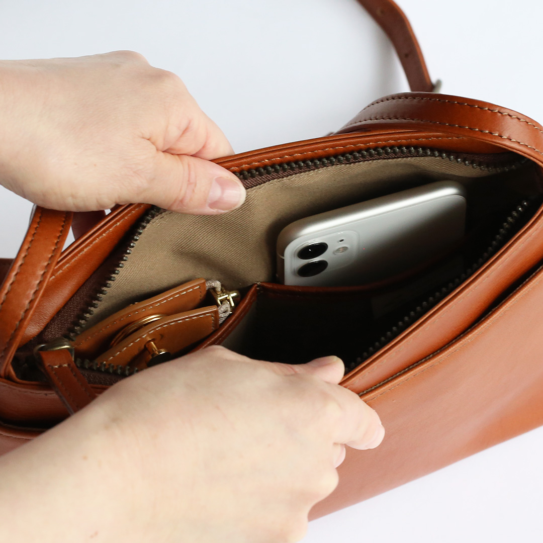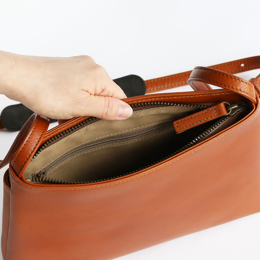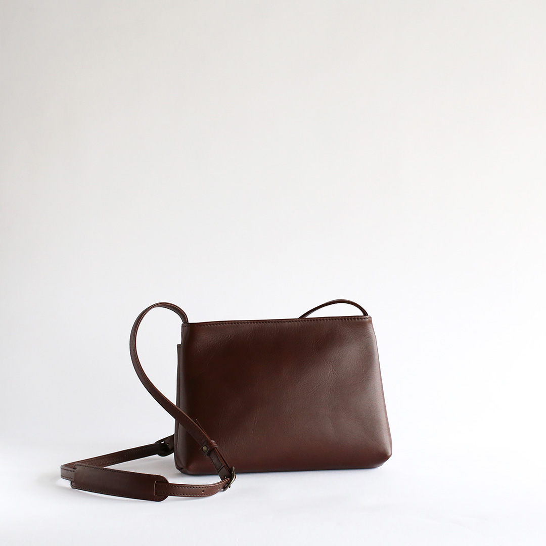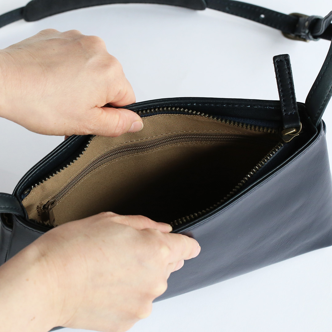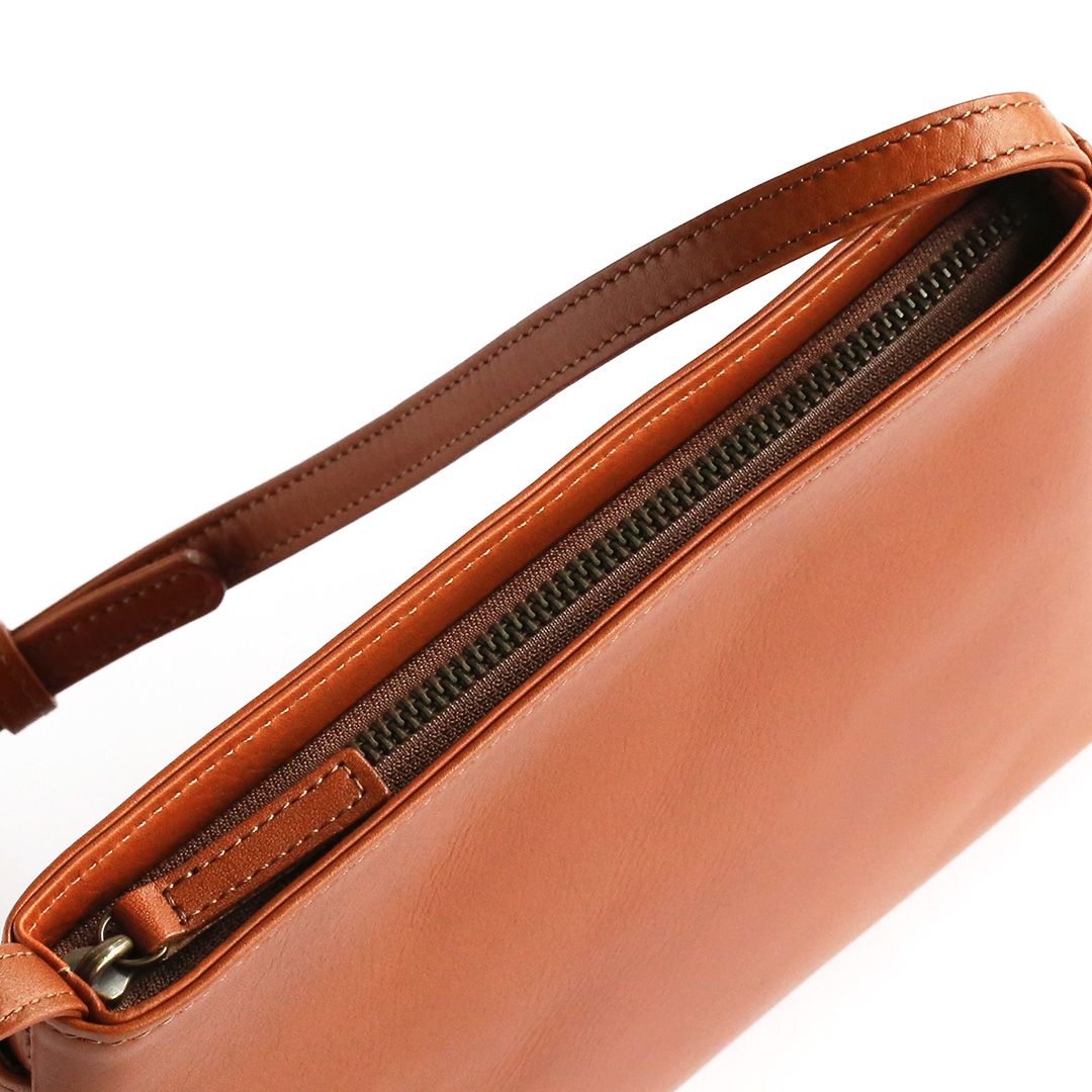 色移りや水濡れに強い特性を備えた牛革で製作したレザーサコッシュです。軽量で身体にフィットするスリムなデザインなので、気軽にいつでもどこでも持ち運んでいただけます。ブラック、ネイビー、ブラウン、キャメルの4色展開です。