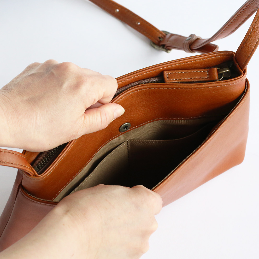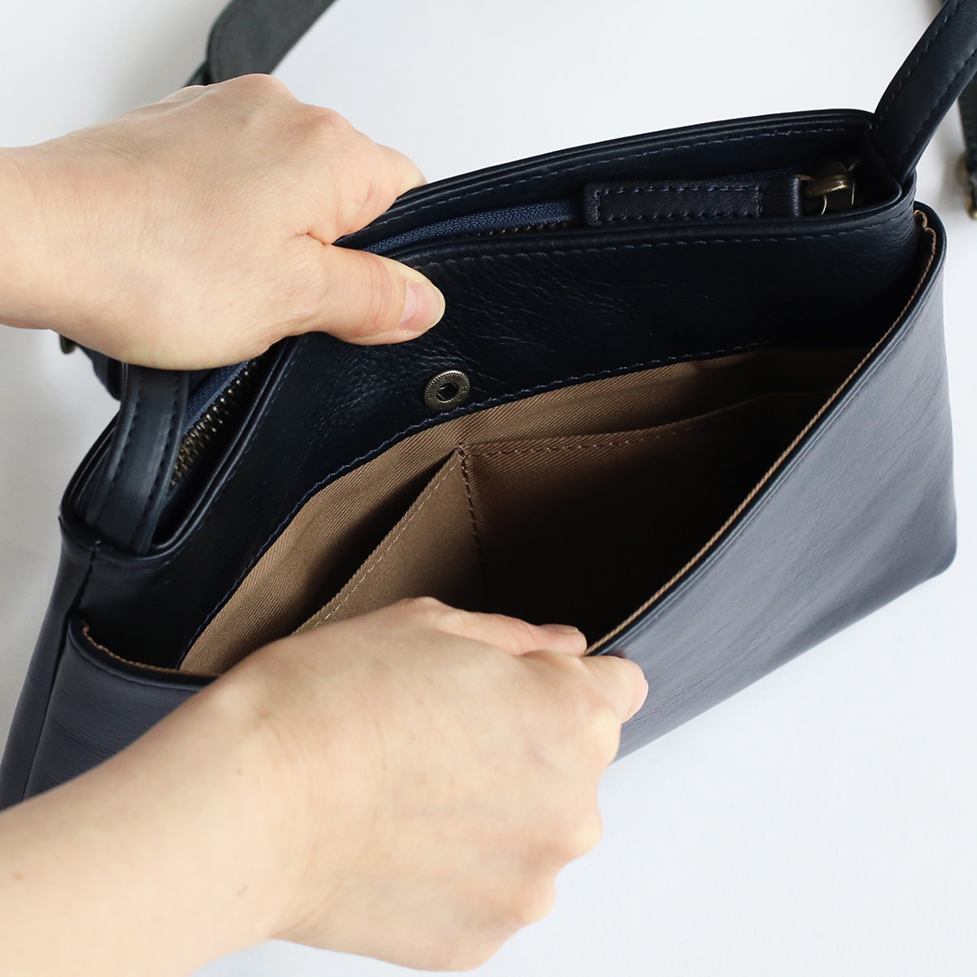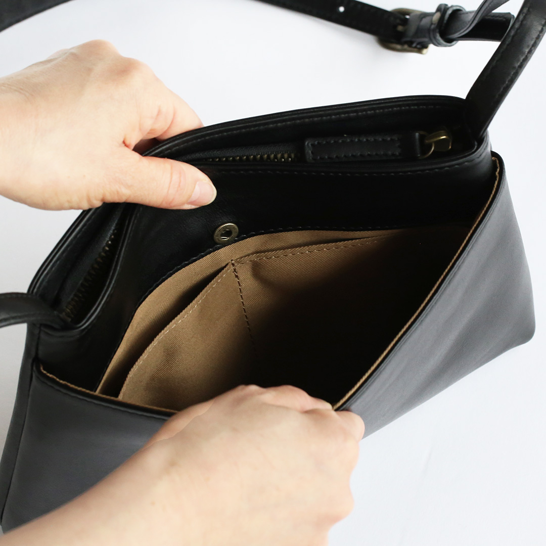 こちらのレザーサコッシュ、ポケットがある方ない方、どちらが表でも正解です。外側のポケットはホックボタンで留めることができ、中にはオープンポケット(横12㎝×縦10㎝)が2つあります。スマホやパスケースなど、すぐに取り出したいものはこちらへ。