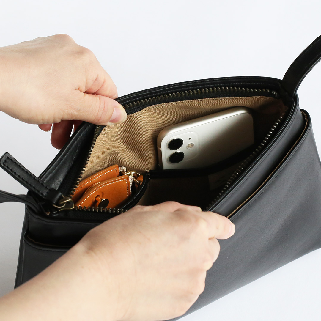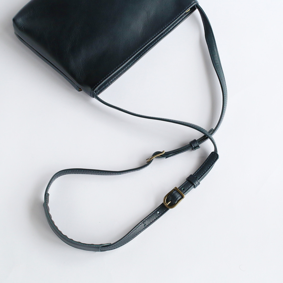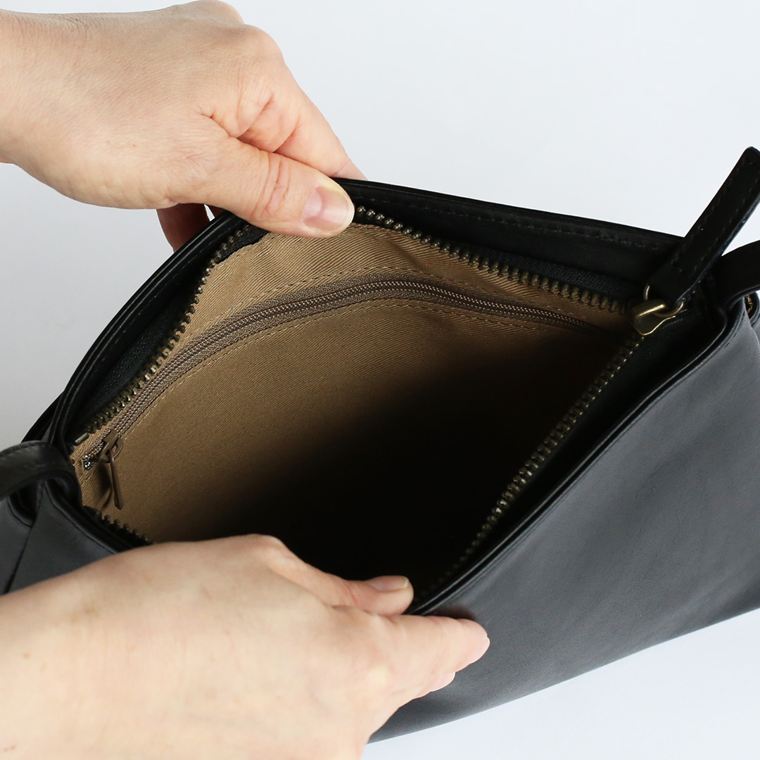 こちらのレザーサコッシュ、ポケットがある方ない方、どちらが表でも正解です。外側のポケットはホックボタンで留めることができ、中にはオープンポケット(横12㎝×縦10㎝)が2つあります。スマホやパスケースなど、すぐに取り出したいものはこちらへ。