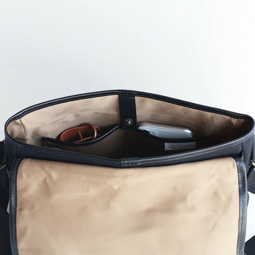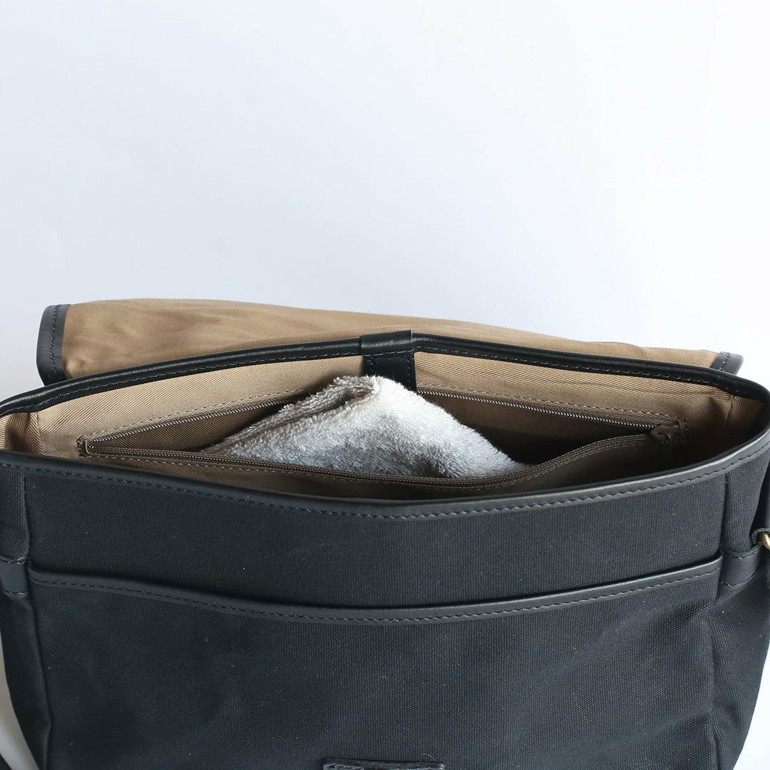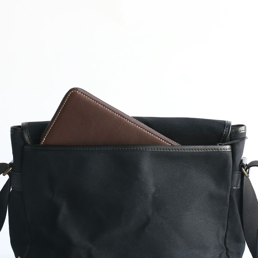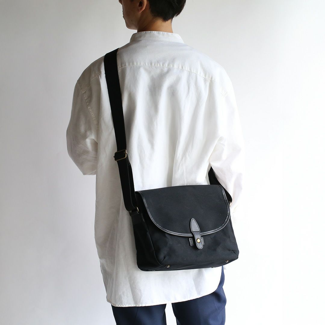 パラフィン帆布という軽くて丈夫で水をはじく素材の特徴を活かした帆布と革のショルダーバッグ。落ち着いた色合いと素材感からクラシックなムードが漂います。 しっかりとした厚みとハリのある帆布は使うほどに柔らかくなり、自然と馴染んでいきます。内外に充実したポケットを多数配置。小物類をすっきり収納でき、街歩きからご旅行、カメラバッグとしても便利なサイズ感です。