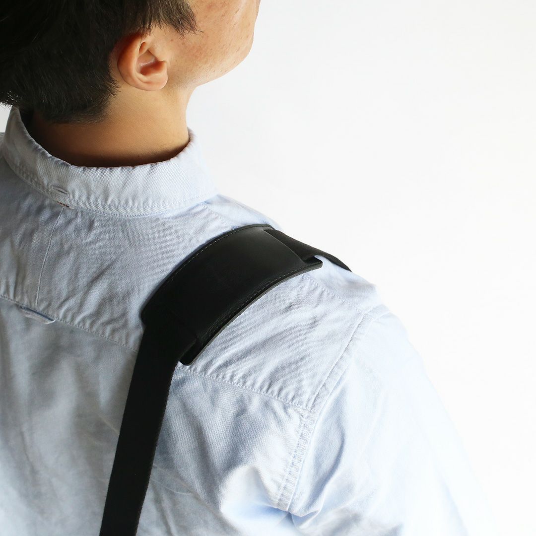 ショルダーベルトには、牛革でつくったショルダーパッド(横13.5㎝×縦5.3㎝×厚さ0.3㎝)を付けています。裏面には滑り止め加工を施しているため、肩にフィットしてズレ落ちにくく、負担も和らげてくれます。重い荷物を入れて長時間持ち歩く場合に、あるとなしでは大違いですよ!