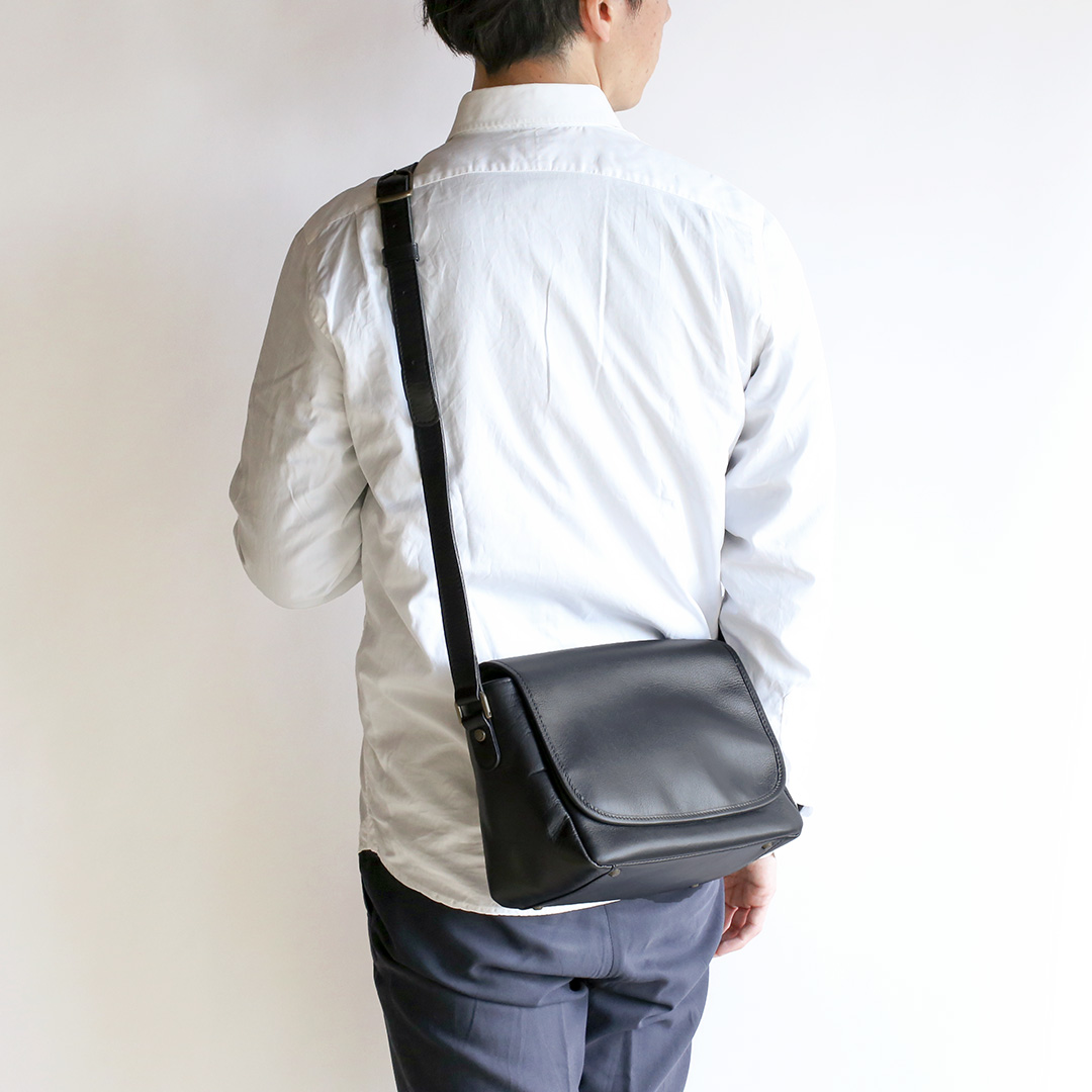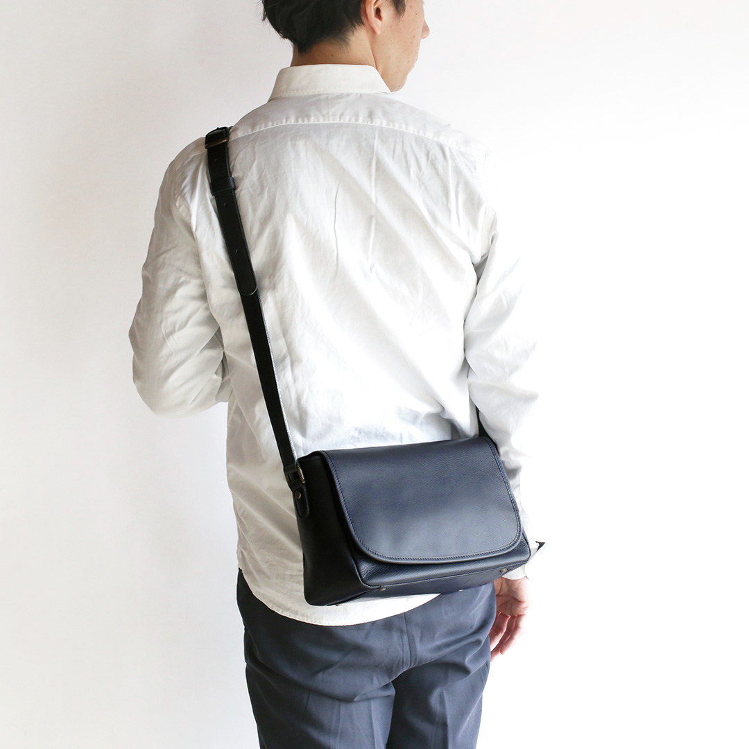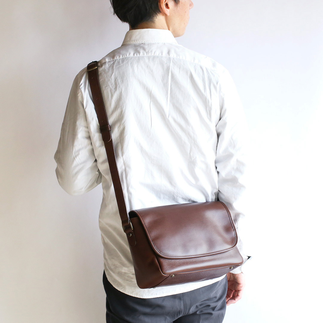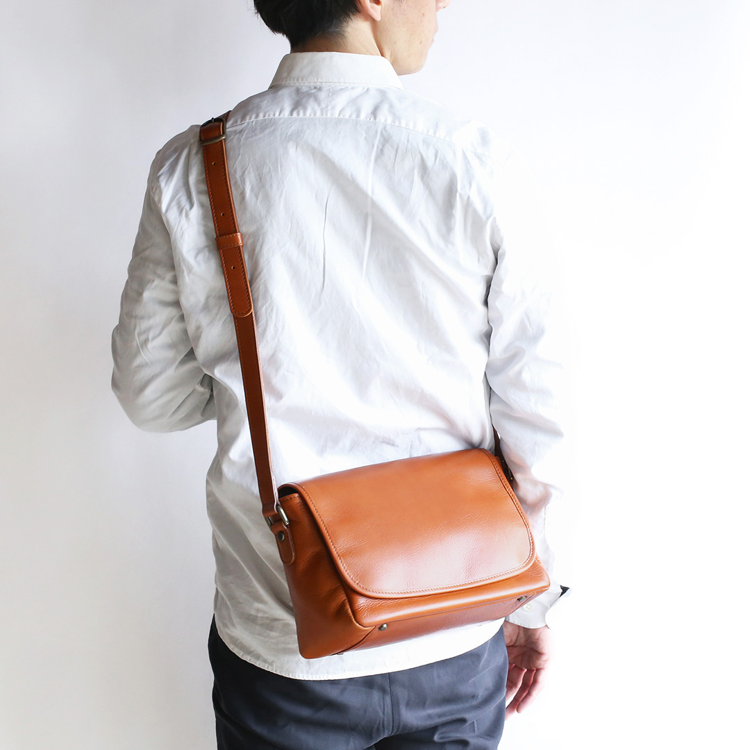 カジュアルな雰囲気になりがちなショルダーバッグですが、かぶせ部分の曲線美が作り出すフォルムは、きれいめなスタイルにも自然に溶け込みます。また、雨を気にすることなく革製品を持ち歩く楽しさを味わっていただけるよう、革の風合いそのままに軽撥水性と、色うつりが起きにくい仕上げを施しました。※より撥水性を高めるためレザー用防水スプレーもご使用いただけます。