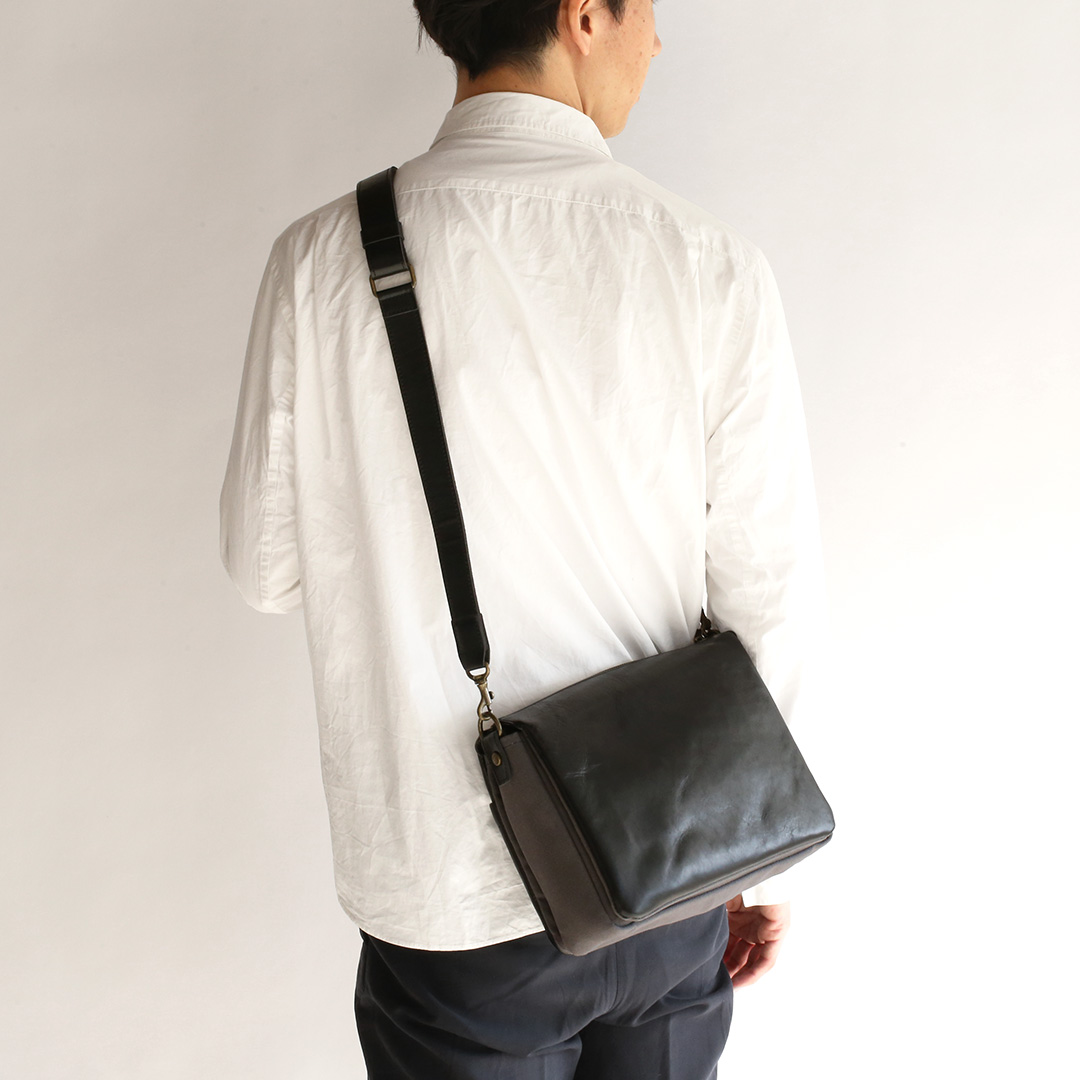 ファスナーのある面を便宜上、前胴と設定しておりますが、前と後ろ、それぞれに革の表情を楽しんでいただける”ダブルフェイス”のショルダーバッグです。お好みや状況に合わせて使い分けをお楽しみください。