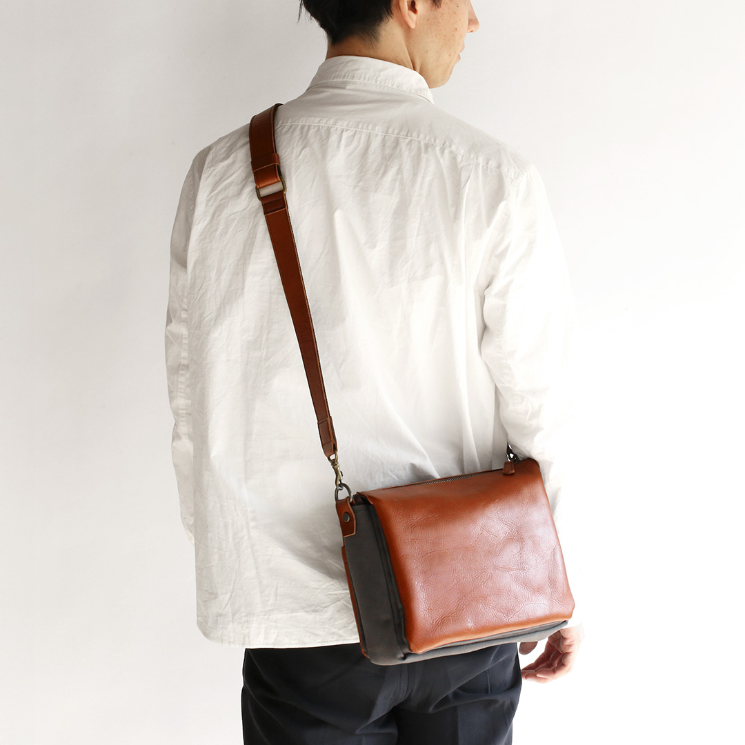 軽くて丈夫、牛革と帆布を組み合わせたスワローマチ仕立ての3層式ショルダーバッグです。スワローマチという特殊な双胴のマチ構造により収納部が3層に分かれており、収納量に応じてマチが拡張する仕組みです。ベーシックで飽きのこないデザインだからずっと使えます。
